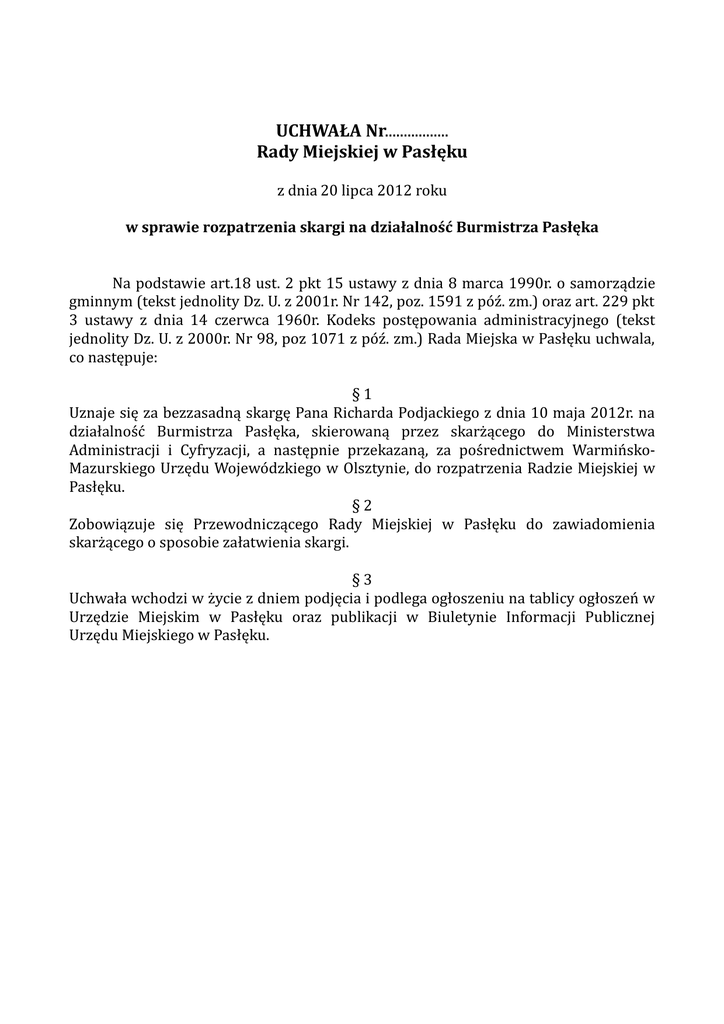 UCHWAŁA Nr................. Rady Miejskiej w Pasłęku z dnia 20 lipca 2012 roku w sprawie rozpatrzenia skargi na działalność Burmistrza Pasłęka Na podstawie art.18 ust. 2 pkt 15 ustawy z dnia 8 marca 1990r. o samorządzie gminnym (tekst jednolity Dz. U. z 2001r. Nr 142, poz. 1591 z póź. zm.) oraz art. 229 pkt 3 ustawy z dnia 14 czerwca 1960r. Kodeks postępowania administracyjnego (tekst jednolity Dz. U. z 2000r. Nr 98, poz 1071 z póź. zm.) Rada Miejska w Pasłęku uchwala, co następuje: §1 Uznaje się za bezzasadną skargę Pana Richarda Podjackiego z dnia 10 maja 2012r. na działalność Burmistrza Pasłęka, skierowaną przez skarżącego do Ministerstwa Administracji i Cyfryzacji, a następnie przekazaną, za pośrednictwem WarmińskoMazurskiego Urzędu Wojewódzkiego w Olsztynie, do rozpatrzenia Radzie Miejskiej w Pasłęku. §2 Zobowiązuje się Przewodniczącego Rady Miejskiej w Pasłęku do zawiadomienia skarżącego o sposobie załatwienia skargi. §3 Uchwała wchodzi w życie z dniem podjęcia i podlega ogłoszeniu na tablicy ogłoszeń w Urzędzie Miejskim w Pasłęku oraz publikacji w Biuletynie Informacji Publicznej Urzędu Miejskiego w Pasłęku. UZASADNIENIE Do Uchwały Nr............................................................................. Rady Miejskiej w Pasłęku z dnia 20 lipca 2012 roku w sprawie rozpatrzenia skargi Pana Richarda Podjackiego na działalność Burmistrza Pasłęka Pan Richard Podjacki sformułował w piśmie z dnia 10 maja 2012 roku skargę na działalność Burmistrza Pasłęka, które wysłał do Ministra Administracji i Cyfryzacji w Warszawie. Powyższa skarga wraz z pismem przewodnim z dnia 21 maja 2012r. została przekazana przez Dyrektora Departamentu Współpracy z Jednostkami Samorządu Terytorialnego Ministerstwa Administracji i Cyfryzacji do Dyrektora Wydziału Prawnego i Nadzoru Warmińsko- Mazurskiego Urzędu Wojewódzkiego w Olsztynie z prośbą o udzielenie odpowiedzi zainteresowanemu. Działająca z upoważnienia Wojewody Warmińsko- Mazurskiego, Dyrektor Wydziału Prawnego i Nadzoru Urzędu Wojewódzkiego w Olsztynie uznała, że jest to skarga na działalność Burmistrza Pasłęka, do rozpatrzenia której właściwa jest Rada Miejska w Pasłęku i pismem z dnia 05 czerwca 2012 roku przekazała skargę Pana Richarda Podjackiego tej radzie. Rada Miejska w Pasłęku po zapoznaniu się ze skargą stwierdziła, że zawiera ona między innymi zarzuty odnoszące się do działalności Burmistrza Pasłęka. Skarżący zarzucił nieuwzględnienie przez Burmistrza Pasłęka wniosku o zwolnienie lub odroczenie z podatku od nieruchomości do czasu osiągania zysku z hali, nierówne traktowanie jego osoby w związku z posiadanym obywatelstwem niemieckim, a w szczególności brak otrzymywania bliżej nieokreślonych świadczeń oraz nieudzielenie mu pomocy poprzez nie włączenie nieruchomości należącej do jego firmy do specjalnej strefy ekonomicznej, nieuwzględnienie jego osoby w bliżej niesprecyzowanych przetargach. Nadto zarzucił brak pomocy finansowej ze strony Gminy Pasłęk oraz podniósł fakt zmuszania jego osoby, pomimo ciężkiej choroby do nadsyłania zwolnień lekarskich. Rada Miejska w Pasłęku działając na podstawie art. 229 pkt 3 Kodeksu postępowania administracyjnego rozpatrzyła ww. zarzuty w zakresie dotyczącym działalności Burmistrza Pasłęka. W toku sprawdzania zarzutów sformułowanych przez Pana Richarda Podjackiego stwierdzono co następuje. Pan Richard Podjacki, jako dyrektor jednoosobowego zarządu jest reprezentantem przedsiębiorcy pod nazwą M.B.S.M. Spółka z ograniczoną odpowiedzialnością. W dniu 23 lutego 2007r. do Urzędu Miejskiego w Pasłęku, wpłynęło pismo Pana Richarda Podjackiego zawierające wniosek o rozłożenie na raty spłaty zobowiązań z tytułu podatku od nieruchomości za rok 2006. Po rozpatrzeniu wniosku, dnia 06 marca 2007r. została wydana decyzja Nr FN3157/3/2007/JM w sprawie rozłożenia na raty płatności zaległości podatkowej w podatku od nieruchomości, w której Burmistrz Pasłęka rozłożył wyżej wymienionemu podatnikowi spłatę zaległego podatku na 4 raty, z podaniem terminu płatności poszczególnych rat. Pismem z dnia 08 sierpnia 2007r. podatnik zwrócił się ponownie do Burmistrza Pasłęka o przesunięcie terminów płatności z tytułu podatku od nieruchomości do dnia 31 października 2007r. z powodu sytuacji rodzinnej. Decyzją FN 3110/5/2007/JM z dnia 08 sierpnia 2007r. Burmistrz Pasłęka odroczył termin płatności siedmiu pierwszych z dwunastu rat podatku od nieruchomości za 2007r., do dnia 31 października 2007r. W dniu 29 października 2007r. do urzędu wpłynęło kolejne pismo Pana Richarda Podjackiego z prośbą o przesunięcie terminu płatności podatku od nieruchomości do dnia 31 stycznia 2008r. Podatnik w uzasadnieniu powołał się na trudną sytuację finansową, przy czym w dalszej korespondencji do wniosku dołączył informację o stanie majątkowym i finansowym Spółki. Na podstawie dostarczonych przez podatnika dokumentów dnia 26 listopada 2007r. Burmistrz Pasłęka wydał decyzję Nr FN 3110/6/2007/JM, na mocy której po raz kolejny odroczył termin płatności podatku, tym razem do dnia 31 stycznia 2008r. Zgodnie z art. 48 § 1 ustawy z dnia 29 sierpnia 1997r. Ordynacja podatkowa (t.j. Dz.U. z 2005r. Nr 8, poz. 60, z późn. zm.) ,,Organ podatkowy, na wniosek podatnika, w przypadkach uzasadnionych ważnym interesem podatnika lub interesem publicznym może odraczać terminy przewidziane w przepisach prawa podatkowego, z wyjątkiem terminów określonych w art. 68-71, art. 77 § 1-3, art. 79 § 2, art. 80 § 1, art. 87 § 3 i 4, art. 88 § 1 i art. 118". Od roku 2007, oprócz wymienionych wyżej pism, Richard Podjacki nie zwracał się do Burmistrza Pasłęka z żadnymi innymi wnioskami odnośnie udzielenia jakiejkolwiek pomocy. Należy wskazać, że w okresie od 2009 do 2011 roku Spółka reprezentowana pr