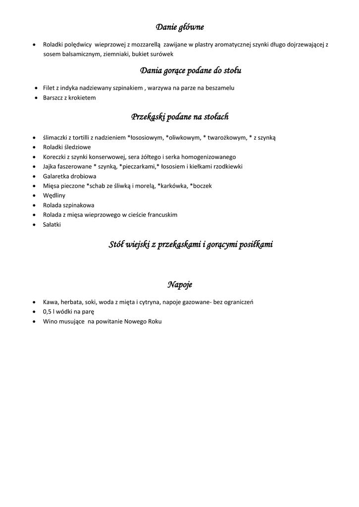 Danie główne Roladki polędwicy wieprzowej z mozzarellą zawijane w plastry aromatycznej szynki długo dojrzewającej z sosem balsamicznym, ziemniaki, bukiet surówek Dania gorące podane do stołu Filet z indyka nadziewany szpinakiem , warzywa na parze na beszamelu Barszcz z krokietem Przekąski podane na stołach ślimaczki z tortilli z nadzieniem *łososiowym, *oliwkowym, * twarożkowym, * z szynką Roladki śledziowe Koreczki z szynki konserwowej, sera żółtego i serka homogenizowanego Jajka faszerowane * szynką, *pieczarkami,* łososiem i kiełkami rzodkiewki Galaretka drobiowa Mięsa pieczone *schab ze śliwką i morelą, *karkówka, *boczek Wędliny Rolada szpinakowa Rolada z mięsa wieprzowego w cieście francuskim Sałatki Stół wiejski z przekąskami i gorącymi posiłkami Napoje Kawa, herbata, soki, woda z mięta i cytryna, napoje gazowane- bez ograniczeń 0,5 l wódki na parę Wino musujące na powitanie Nowego Roku