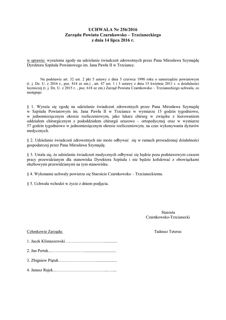 UCHWAŁA Nr 256/2016 Zarządu Powiatu Czarnkowsko – Trzcianeckiego z dnia 14 lipca 2016 r. w sprawie: wyrażenia zgody na udzielanie świadczeń zdrowotnych przez Pana Mirosława Szymajdę Dyrektora Szpitala Powiatowego im. Jana Pawła II w Trzciance. Na podstawie art. 32 ust. 2 pkt 5 ustawy z dnia 5 czerwca 1998 roku o samorządzie powiatowym (t. j. Dz. U. z 2016 r., poz. 814 ze zm.) , art. 47 ust. 1 i 3 ustawy z dnia 15 kwietnia 2011 r. o działalności leczniczej (t. j. Dz. U. z 2015 r. , poz. 618 ze zm.) Zarząd Powiatu Czarnkowsko – Trzcianeckiego uchwala, co następuje: § 1. Wyraża się zgodę na udzielanie świadczeń zdrowotnych przez Pana Mirosława Szymajdę w Szpitalu Powiatowym im. Jana Pawła II w Trzciance w wymiarze 15 godzin tygodniowo, w jednomiesięcznym okresie rozliczeniowym, jako lekarz chirurg w związku z kierowaniem oddziałem chirurgicznym z pododdziałem chirurgii urazowo – ortopedycznej oraz w wymiarze 57 godzin tygodniowo w jednomiesięcznym okresie rozliczeniowym, na czas wykonywania dyżurów medycznych. § 2. Udzielanie świadczeń zdrowotnych nie może odbywać się w ramach prowadzonej działalności gospodarczej przez Pana Mirosława Szymajdę. § 3. Ustala się, że udzielanie świadczeń medycznych odbywać się będzie poza podstawowym czasem pracy przewidzianym dla stanowiska Dyrektora Szpitala i nie będzie kolidować z obowiązkami służbowymi przewidzianymi na tym stanowisku. § 4. Wykonanie uchwały powierza się Staroście Czarnkowsko – Trzcianeckiemu. § 5. Uchwała wchodzi w życie z dniem podjęcia. Starosta Czarnkowsko-Trzcianecki Członkowie Zarządu: 1. Jacek Klimaszewski ………………………............. 2. Jan Pertek...…………………….............................. 3. Zbigniew Piątek……………………….................... 4. Janusz Rajek..………………………………...….... Tadeusz Teterus UZASADNIENIE do uchwały Nr 256/2016 Zarządu Powiatu Czarnkowsko – Trzcianeckiego z dnia 14 lipca 2016 r. Ustawa o działalności leczniczej w art. 47 pkt. 1 dopuszcza możliwość udzielania świadczeń zdrowotnych przez kierownika podmiotu leczniczego niebędącego przedsiębiorcą, wykonującego zawód medyczny. Jednocześnie kierownik podmiotu leczniczego niebędącego przedsiębiorcą nie może podejmować innego zatrudnienia bez wyrażonej w formie pisemnej zgody podmiotu tworzącego. Mając na uwadze powyższe zapisy, Pan Mirosław Szymajda zwrócił się z wnioskiem do Zarządu Powiatu Czarnkowsko – Trzcianeckiego na udzielanie świadczeń zdrowotnych w zakresie lekarza chirurga, na czas kierowania oddziałem chirurgicznym z pododdziałem chirurgii urazowo – ortopedycznej oraz na czas wykonywania dyżurów medycznych. Wobec powyższego przyjęcie niniejszej uchwały jest zasadne.