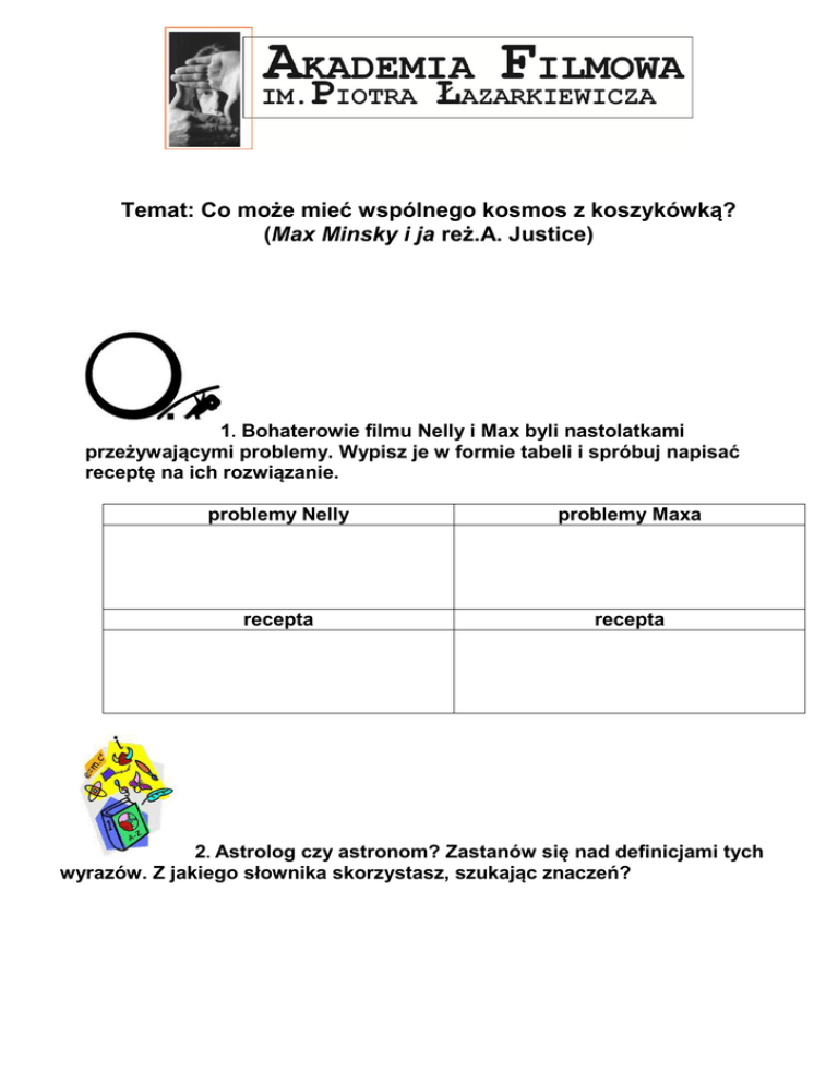 Temat: Co może mieć wspólnego kosmos z koszykówką? (Max Minsky i ja reż.A. Justice) 1. Bohaterowie filmu Nelly i Max byli nastolatkami przeżywającymi problemy. Wypisz je w formie tabeli i spróbuj napisać receptę na ich rozwiązanie. problemy Nelly problemy Maxa recepta recepta 2. Astrolog czy astronom? Zastanów się nad definicjami tych wyrazów. Z jakiego słownika skorzystasz, szukając znaczeń? 3. Pomiędzy Nelly a Maxem doszło do transakcji. Co dzięki niej zyskała dziewczyna a co chłopak? 4. Kto w filmie wypowiedział słowa: Dom jest tam, gdzie Twoje miejsce. Czy zgadzasz się z tym stwierdzeniem? Uzasadnij swoją wypowiedź. 5. Nelly musiała pokonać odległość Berlin – Luxemburg (1024 km), by spełniło się jej marzenie. Jak daleko Ty musiałbyś sięgnąć, by spełnić własne? Wypowiedz się przed koleżankami i kolegami z klasy. Źródła: www.nhef.pl Opracowała: Justyna Szczepaniak Projekt dofinansowano ze środków: Ministerstwa Kultury i Dziedzictwa Narodowego, Gminy Jarocin i Samorząd Województwa Wielkopolskiego Kino jest członkiem: