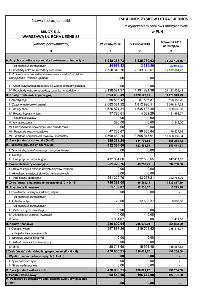 RACHUNEK ZYSKÓW I STRAT JEDNOSTEK Nazwa i adres jednostki z wyłączeniem banków i ubezpieczycieli w PLN MINOX S.A. WARSZAWA UL ECHA LEŚNE 58 (wariant porównawczy) IV kwartał 2012 IV kwartał 2013 IV kwartał 2012 narastająco 0 1 2 3 A. Przychody netto ze sprzedaży i zrównane z nimi, w tym: - od jednostek powiązanych I. Przychody netto ze sprzedaży produktów II. Zmiana stanu produktów (zwiększenie - wartość dodatnia, zmniejszenie - wartość ujemna) III. Koszt wytworzenia produktów na własne potrzeby jednostki IV. Przychody netto ze sprzedaży towarów i materiałów B. Koszty działalności operacyjnej I. Amortyzacja II. Zużycie materiałów i energii III. Usługi obce IV. Podatki i opłaty, w tym: - podatek akcyzowy V. Wynagrodzenia VI. Ubezpieczenia społeczne i inne świadczenia VII. Pozostałe koszty rodzajowe VIII. Wartość sprzedanych towarów i materiałów C. Zysk (strata) ze sprzedaży (A - B) D. Pozostałe przychody operacyjne I. Zysk ze zbycia niefinansowych aktywów trwałych 8 948 367,73 24 661,33 2 750 345,76 6 425 730,03 3 384,86 2 233 838,67 0,00 0,00 0,00 6 198 021,97 8 353 030,49 59 816,42 2 082 381,22 1 526 824,31 37 723,61 0,00 385,00 0,00 47 230,67 4 598 669,26 595 337,24 412 384,60 0,00 0,00 4 191 891,36 7 070 522,61 51 806,87 1 812 996,51 1 545 483,39 4 532,29 0,00 0,00 0,00 99 885,64 3 555 817,91 34 056 128,15 32 948,93 12 922 691,73 21 133 436,42 33 170 913,73 198 150,26 9 046 347,32 6 630 695,90 51 963,27 3 849,00 179 527,64 17 060 380,34 644 792,58 885 214,42 622 583,65 847 411,63 0,00 - II. Dotacje III. Inne przychody operacyjne E. Pozostałe koszty operacyjne I. Strata ze zbycia niefinansowych aktywów trwałych II. Aktualizacja wartości aktywów niefinansowych III. Inne koszty operacyjne F. Zysk (strata) z działalności operacyjnej (C + D - E) G. Przychody finansowe I. Dywidendy i udziały w zyskach, w tym: 412 384,60 251 329,76 0,00 0,00 251 329,76 756 392,08 1 109,07 0,00 622 583,65 847 411,63 43 253,21 392 758,36 0,00 0,00 43 253,21 392 758,36 65 462,14 1 339 867,69 12 535,37 11 279,98 0,00 - - od jednostek powiązanych II. Odsetki, w tym: 28,00 12 535,37 0,00 0,00 1 081,07 286 600,94 257 887,26 0,00 0,00 0,00 9 868,88 - od jednostek powiązanych III. Zysk ze zbycia inwestycji IV. Aktualizacja wartości inwestycji V. Inne H. Koszty finansowe I. Odsetki, w tym: 235 695,00 219 701,52 1 411,10 851 882,99 735 815,37 - dla jednostek powiązanych II. Strata ze zbycia inwestycji III. Aktualizacja wartości inwestycji IV. Inne I. Zysk (strata) z działalności gospodarczej (F + G - H) J. Wynik zdarzeń nadzwyczajnych (J.I - J.II) I. Zyski nadzwyczajne II. Straty nadzwyczajne K. Zysk (strata) brutto (I +/- J) L. Podatek dochodowy M. Pozostałe obowiązkowe zmniejszenia zysku (zwiększenia straty) 0,00 0,00 28 713,68 470 900,21 0,00 0,00 0,00 470 900,21 98 549,00 0,00 0,00 0,00 15 993,48 288 621,77 0,00 0,00 0,00 288 621,77 106 612,00 0,00 116 067,62 499 264,68 499 264,68 126 701,00 - 372 351,21 - N. Zysk (strata) netto (K - L - M) ________________ Data ____________________________ Podpis osoby, której powierzono ________________ Data 395 233,77 372 563,68 _________________________ Podpis kierownika jednostki * prowadzenie ksiąg rachunkowych * Jeżeli jednostką kieruje organ wieloosobowy (por. art. 3, ust. 1, pkt. 5 ustawy o rachunkowości), sprawozdanie podpisują wszyscy członkowie tego organu. Odmowa podpisu wymaga pisemnego uzasadnienia dołączonego do sprawozdania finansowego. NOSTEK ycieli IV kwartał 2013 narastająco 4 30 459 898,27 870 867,57 12 584 790,12 17 875 108,15 30 105 441,01 213 514,79 8 140 870,70 6 169 937,12 21 172,12 346 291,99 15 213 654,29 354 457,26 896 760,25 10 288,91 886 471,34 88 236,81 88 236,81 1 162 980,70 2 514 671,50 13 986,42 2 500 685,08 1 118 387,88 971 427,48 146 960,40 2 559 264,32 2 559 264,32 229 476,00 - 2 329 788,32 tego organu. Odmowa