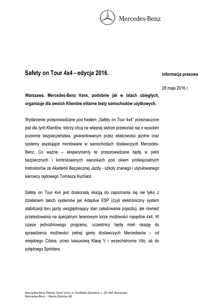 Safety on Tour 4x4 - edycja 2016. Informacja prasowa 28 maja 2016 r. Warszawa. Mercedes-Benz Vans, podobnie jak w latach ubiegłych, organizuje dla swoich Klientów elitarne testy samochodów użytkowych. Wydarzenie przeprowadzane pod hasłem „Safety on Tour 4x4” przeznaczone jest dla tych Klientów, którzy chcą na własnej skórze przekonać się o wysokim poziomie bezpieczeństwa, gwarantowanym przez właściwości jezdne oraz systemy asystujące montowane w samochodach dostawczych MercedesBenz. Co ważne – eksperymenty te przeprowadzane będą w pełni bezpiecznych i kontrolowanych warunkach pod okiem profesjonalnych instruktorów ze Akademii Bezpiecznej Jazdy - szkoły znanego i utytułowanego kierowcy rajdowego Tomasza Kuchara. Safety on Tour 4x4 jest doskonałą okazją do zapoznania się nie tylko z działaniem takich systemów jak Adaptive ESP (czyli elektroniczny system stabilizacji toru jazdy uwzględniający stan załadowania pojazdu), ale również przetestowania na specjalnym terenowym torze możliwości napędów 4x4. W czasie jednodniowego programu, uczestnicy będą mieli okazję do sprawdzenia możliwości pełnej gamy dostawczych Mercedesów – od miejskiego Citana, przez luksusową Klasę V i wszechstronne Vito, aż do potężnego Sprintera. Mercedes-Benz Polska, Dział Vans, ul. Gottlieba Daimlera 1, 02-460 Warszawa Mercedes-Benz – Marka Daimler AG Strona 2 W 2016 zorganizowane zostaną dwie edycje tego wydarzenia – w czerwcu dostawcze Mercedesy zaprezentują swoje możliwości w Legnicy, zaś we wrześniu w Toruniu. Kontakt: Adam Dutkowski, Product Communication Vans tel. +48 22 312 72 81, 698 697 281 mail: [email protected] Mercedes-Benz Polska, Dział Vans, ul. Gottlieba Daimlera 1, 02-460 Warszawa Mercedes-Benz – Marka Daimler AG