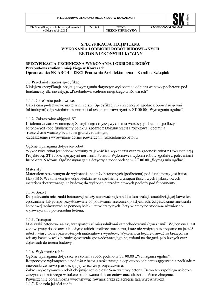 PRZEBUDOWA STADIONU MIEJSKIEGO W KOWARACH ST- Specyfikacja techniczna wykonania i odbioru robót 2012 Poz. 0.5 BETON NIEKONSTRUKCYJNY 05-SPEC-WYM.OG./2012 SPECYFIKACJA TECHNICZNA WYKONANIA I ODBIORU ROBÓT BUDOWLANYCH BETON NIEKONSTRUKCYJNY SPECYFIKACJA TECHNICZNA WYKONANIA I ODBIORU ROBÓT Przebudowa stadionu miejskiego w Kowarach Opracowanie: SK-ARCHITEKCI Pracownia Architektoniczna – Karolina Szkapiak 1.1 Przedmiot i zakres specyfikacji. Niniejsza specyfikacja obejmuje wymagania dotyczące wykonania i odbioru warstwy podbetonu pod fundamenty dla inwestycji: „Przebudowa stadionu miejskiego w Kowarach” 1.1.1. Określenia podstawowe. Określenia podstawowe użyte w niniejszej Specyfikacji Technicznej są zgodne z obowiązującymi (aktualnymi) odpowiednimi normami i określeniami zawartymi w ST 00.00 „Wymagania ogólne”. 1.1.2. Zakres robót objętych ST. Ustalenia zawarte w niniejszej Specyfikacji dotyczą wykonania warstwy podbetonu (podłoży betonowych) pod fundamenty obiektu, zgodnie z Dokumentacją Projektową i obejmują: -rozścielenie warstwy betonu na gruncie rodzimym, -zagęszczenie i wyrównanie górnej powierzchni rozścielonego betonu Ogólne wymagania dotyczące robót. Wykonawca robót jest odpowiedzialny za jakość ich wykonania oraz za zgodność robót z Dokumentacją Projektową, ST i obowiązującymi normami. Ponadto Wykonawca wykona roboty zgodnie z poleceniami Inspektora Nadzoru. Ogólne wymagania dotyczące robót podano w ST 00.00 „Wymagania ogólne”. Materiały Materiałem stosowanym do wykonania podłoży betonowych (podbetonu) pod fundamenty jest beton klasy B10. Wykonawca jest odpowiedzialny ze spełnienie wymagań ilościowych i jakościowych materiału dostarczanego na budowę do wykonania przedmiotowych podłoży pod fundamenty. 1.1.4. Sprzęt Do podawania mieszanki betonowej należy stosować pojemniki o konstrukcji umożliwiającej łatwe ich opróżnianie lub pompy przystosowane do podawania mieszanek plastycznych. Zagęszczanie mieszanki betonowej wykonywać za pomocą belek i łat wibracyjnych. Łaty wibracyjne stosować również do wyrównywania powierzchni betonu. 1.1.5. Transport Mieszanki betonowe należy transportować mieszalnikami samochodowymi (gruszkami). Wykonawca jest zobowiązany do stosowania jedynie takich środków transportu, które nie wpłyną niekorzystnie na jakość robót i właściwości przewożonych materiałów i wyrobów. Wykonawca będzie usuwać na bieżąco, na własny koszt, wszelkie zanieczyszczenia spowodowane jego pojazdami na drogach publicznych oraz dojazdach do terenu budowy. 1.1.6. Wykonanie robót Ogólne wymagania dotyczące wykonania robót podano w ST 00.00 „Wymagania ogólne”. Rozpoczęcie wykonywania podłoża z betonu może nastąpić dopiero po odbiorze zagęszczenia podkładu z mieszanki żwirowo-piaskowej i jej właściwego zagęszczenia. Zakres wykonywanych robót obejmuje rozścielenie 5cm warstwy betonu. Beton ten zapobiega ucieczce zaczynu cementowego w trakcie betonowania fundamentów oraz ułatwia ułożenie zbrojenia. Powierzchnię górną można wyrównywać również przez ściągnięcie łatą wyrównawczą. 1.1.7. Kontrola jakości robót PRZEBUDOWA STADIONU MIEJSKIEGO W KOWARACH ST- Specyfikacja techniczna wykonania i odbioru robót 2012 Poz. 0.5 BETON NIEKONSTRUKCYJNY 05-SPEC-WYM.OG./2012 Rozpoczęcie wykonania podłoża z betonu może nastąpić dopiero po odbiorze zagęszczenia gruntu. Przy sprawdzeniu stanu gruntów w podłożu należy stosować makroskopowe metody badań gruntów zgodnie z aktualnie obowiązującymi normami. Badania składników betonu powinny być wykonywane przed przystąpieniem do przygotowania mieszanki betonowej i prowadzone systematycznie przez cały czas trwania robót betonowych. W przeciętnych warunkach wykonania betonu zakres kontroli powinien obejmować wszystkie wymagane normami właściwości betonu. Wykonywanie mieszanki betonowej powinno być kontrolowane na bieżąco. Kontroli powinny podlegać parametry, od których zależy jakość betonu. Należy sprawdzić zgodność z Projektem pod względem kształtu, wymiarów i rzędnych ułożonej warstwy betonu. Dopuszczalne odchyłki wymiarowe: -głębokość nie więcej niż 20 mm -wymiary w planie nie więcej niż 30 mm -usytuowanie nie więcej niż 50 mm 1.1.8. Obmiar robót Ogólne zasady i wymagania dotyczące obmiaru robót podano w ST 00.00 „Wymagania ogólne”. Obmiar robót określa ilość wykonanych robót zgodnie z Dokumentacją Projektową i postanowieniami Umowy. Jednostką obmiarową dla podłoży betonowych jest 1m2 betonu. 1.1.9. Odbiór robót Ogólne warunki odbioru podano w ST 00.00 „Wymagania ogólne”. Celem odbioru jest protokolarne dokonanie finalnej oceny rzeczywistego wykonania robót w odniesieniu do ich ilości, jakości i wartości. Odbiorom podlegają: -dostarczona na plac budowy gotowa mieszanka betonowa -beton wykonanych elementów 1.1.10. Podstawa płatności Ogólne wymagania dotyczące płatności podano w ST 00.00 „Wymagania ogólne”. Płatności należy przyjmować zgodnie z obmiarem i oceną jakości robót, w oparciu o wyniki pomiarów. Należy wykonać zakres robót wymieniony w pkt. 1.4 niniejszej ST, zgodnie z Dokumentacją projektową. 1.1.11. Dokumentu odniesienia Dokumentami odniesienia są Polskie Normy, Aprobaty techniczne i Dokumentacja Projektowa. 1) PN-EN 206-1:2003 Beton. Część 1: Wymagania, właściwości, produkcja i zgodność 2) PN-88/B-06250 Beton zwykły 3) PN-63/B-06251 Roboty betonowe i żelbetowe. Wymagania techniczne 4) PN-EN 197-1:2002 Cement. Część 1: Skład, wymagania i kryteria zgodności dotyczące cementów powszechnego użytku 5) PN-EN 197-2:2002 Cement. Część 2: Ocena zgodności 6) PN-EN 196-1:1996 Metody badania cementu. Oznaczanie wytrzymałości 7) PN-EN 1008:2004 Woda zarobowa do betonu. Specyfikacja pobierania próbek, badanie i ocena przydatności wody zarobowej do betonu, w tym wody odzyskanej z pr