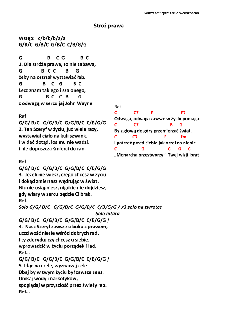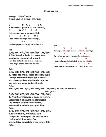 Słowa i muzyka Artur Suchożebrski Stróż prawa Wstęp: c/b/b/b/a/a G/B/C G/B/C G/B/C C/B/G/G G B C G B C 1. Dla stróża prawa, to nie zabawa, G B C C B G żeby na ostrzał wystawiać łeb. G B C G B C Lecz znam takiego i szalonego, G B C C B G z odwagą w sercu jaj John Wayne Ref G/G/ B/C G/G/B/C G/G/B/C C/B/G/G 2. Ten Szeryf w życiu, już wiele razy, wystawiał ciało na kuli szwank. I widać dotąd, los mu nie wadzi. i nie dopuszcza śmierci do ran. Ref C C7 F F7 Odwaga, odwaga zawsze w życiu pomaga C C7 B G By z głową do góry przemierzać świat. C C7 F fm I patrzeć przed siebie jak orzeł na niebie C G C G C „Monarcha przestworzy”, Twej wizji brat. Ref… G/G/ B/C G/G/B/C G/G/B/C C/B/G/G 3. Jeżeli nie wiesz, czego chcesz w życiu i dokąd zmierzasz wędrując w świat. Nic nie osiągniesz, nigdzie nie dojdziesz, gdy wiary w sercu będzie Ci brak. Ref.. Solo G/G/ B/C G/G/B/C G/G/B/C C/B/G/G / x3 solo na zwrotce Solo gitara G/G/ B/C G/G/B/C G/G/B/C C/B/G/G / 4. Nasz Szeryf zawsze u boku z prawem, uczciwość niesie wśród dobrych rad. I ty zdecyduj czy chcesz u siebie, wprowadzić w życiu porządek i ład. Ref… G/G/ B/C G/G/B/C G/G/B/C C/B/G/G / 5. Idąc na czele, wyznaczaj cele Dbaj by w twym życiu był zawsze sens. Unikaj wódy i narkotyków, spoglądaj w przyszłość przez świeży łeb. Ref…