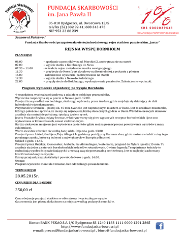 FUNDACJA SKARBOWOŚCI im. Jana Pawła II 85-010 Bydgoszcz, ul. Dworcowa 12/5 tel/fax (52) 332 92 41; 608 343 475 NIP 953 23 88 239 ORGANIZACJA POŻYTKU PUBLICZNEGO Szanowni Państwo ! Fundacja Skarbowości przygotowała ofertę jednodniowego rejsu statkiem pasażerskim „Jantar” REJS NA WYSPĘ BORNHOLM PLAN REJSU 06.00 07.00 07.30 – 11.00 11.30 16.00 17.30 22.00 – spotkanie uczestników na ul. Morskiej 2, zaokrętowanie na statek – wyjście statku z Kołobrzegu do Nexo - w trakcie rejsu: zwiedzanie mostka nawigacyjnego – przybycie do Nexo (port docelowy na Bornholmie), spotkanie z pilotem - zakończenie wycieczki, zaokrętowanie na statek – wyjście statku z Nexo do Kołobrzegu – przypłyniecie do Kołobrzegu, wyokrętowanie pasażerów. Zakończenie wycieczki. Program wycieczki objazdowej po wyspie Bornholm 4-ro godzinna wycieczka objazdowa, z udziałem polskiego przewodnika. Wycieczka rozpoczyna się w porcie w Nexo o godz. 12.00. Przejazd trasą wzdłuż wschodniego, skalistego wybrzeża, przez Arsdale, gdzie znajduje się działający do dziś holenderski wiatrak muzeum. Przystanek w Svaneke – postój ok. 45 min. Svaneke jest najmniejszym miastem w Danii. Jest to urokliwe miasteczko, którego położenie sprawia, że cieszy się największą liczbą słonecznych godzin w Danii. Wśród kolorowych domków znajduje się centralnie położony, tętniący życiem rynek. Jest tu Svanake Bryhus jedyny browar, w którym warzy się piwo wg starych receptur borholmskich i jest ono wytwarzane w kilku smakach, nawet czekoladowym. Bardzo ciekawym miejscem jest wytwórnia cukierków gdzie można poznać proces powstawania wyrobów z masy cukierniczej. Warto zwiedzić również niewielką hutę szkła. Odjazd o godz. 13.00 Przejazd przez Listed, Gudhjem,Tejn, Alinge i 1- godzinny postój przy Hammershus, gdzie można zwiedzić ruiny tego potężnego zamku, które są jednymi z największych w Europie północnej. Odjazd o godz. 14.45. Przejazd przez Rutsker, Klemensker, Arsballe, las Almindingen, Vestemarie, przyjazd do Nylars i postój 15 min. Tu znajduje się jeden z czterech bornholmskich kościołów rotundowych. Owiane legendą Templariuszy kościoły te rozbudzają wyobraźnię zwiedzających i urzekają swą niepowtarzalną architekturą. Jest to najlepiej zachowany kościół rotundowy na wyspie. Dalszy przejazd przez Aakirkeby i powrót do Nexo o godz. 16.00. Uwaga: Program wycieczki może ulec zmianie, bez oddzielnego powiadamiania. TERMIN REJSU 28.05.2015r. CENA REJSU DLA 1-OSOBY 250,00 zł Cena obejmuje przejazd statkiem w obie strony i wycieczkę po wyspie. Gastronomia jest płatna dodatkowo na miejscu według podanych cenników. Konto: BANK PEKAO S.A. I/O Bydgoszcz 83 1240 1183 1111 0000 1291 2865 http://www.fundacjaskarbowosci.pl e-mail: [email protected] , [email protected] FUNDACJA SKARBOWOŚCI im. Jana Pawła II 85-010 Bydgoszcz, ul. Dworcowa 12/5 tel/fax (52) 332 92 41; 608 343 475 NIP 953 23 88 239 Cennik gastronomi na statku m/s „Jantar”: Menu do wyboru. Śniadanie: Parówki drobiowe 100g Ser żółty 30g Szynka 30g Pomidor 30g Ogórek 30g Masło 15g Pieczywo 150g Kawa, herbata 10g Dżem 25g ORGANIZACJA POŻYTKU PUBLICZNEGO Cena: 22 zł Obiadokolacja: Zupy: Żurek z jajkiem 200g Cena: 8 zł Pomidorowa z ryżem 200g Cena: 6 zł II Dania: Zestaw I: Pieczone udko z kurczaka Ryż biały Surówka z kapusty pekińskiej 150g 150g 150g Zestaw II: Pieczeń wieprzowa w sosie Kluseczki Surówka z kapusty pekińskiej 150g 150g 150g Zestaw III: Kotlet schabowy Frytki Surówka z kapusty pekińskiej 120g 150g 150g Cena: 25 zł Cena: 28 zł Cena: 29 zł Ceny zestawów nie obejmują zimnych napoi. Cennik napoi zimnych i gorących w restauracji m/s „Jantar”: Soki owocowe Coca-Cola Fanta Sprite Nestea Woda mineralna Kawa Kawa cappuccino Kawa macchiato Herbata Gorąca czekolada 200ml but. but. but. but. but. 6 zł 8 zł 8 zł 8 zł 8 zł 5 zł 8 zł 9 zł 10 zł 5 zł 7 zł Konto: BANK PEKAO S.A. I/O Bydgoszcz 83 1240 1183 1111 0000 1291 2865 http://www.fundacjaskarbowosci.pl e-mail: [email protected] , [email protected] FUNDACJA SKARBOWOŚCI im. Jana Pawła II 85-010 Bydgoszcz, ul. Dworcowa 12/5 tel/fax (52) 332 92 41; 608 343 475 NIP 953 23 88 239 ORGANIZACJA POŻYTKU PUBLICZNEGO ZGŁOSZENIA I WPŁATY – do dnia 31 marca 2015 r. FUNDACJA SKARBOWOŚCI im. Jana Pawła II 85-010 Bydgoszcz, ul. Dworcowa 12/5 e-mail: [email protected] tel/fax (52) 332 92 41, Nr konta: BANK PEKAO S.A. I/O Bydgoszcz 83 1240 1183 1111 0000 1291 2865 Kserokopie lub skany dowodów wpłaty oraz zgłoszenia zawierające następujące dane: - imię i nazwisko - data urodzenia (rok-miesiąc-dzień) - obywatelstwo - nr tel komórkowego do opiekuna grupy prosimy przesyłać na adres e-mail: [email protected] Dodatkowe informacje: 1. Na wyspie obowiązuje waluta: korona duńska. Sugeruje posiadanie kieszonkowego w DKK. Nie ma kantoru wymiany walut w Nexo, ani na statku; min. kieszonkowego: 200 DKK 2. Przypominamy o konieczności posiadania przez wszystkich uczestników wyjazdu dokumentu tożsamości, tj.: dowodu osobistego lub paszportu. 3. Na wyspie honorowane są wszystkie karty płatnicze. 4. Na statku płatność gotówką w złotówkach. 5. Rejs jest ubezpieczony 6. Nie ma zniżek dla dzieci ILOŚĆ MIEJSC OGRANICZONA! Liczy się kolejność zgłoszeń i wpłat. Ze względu na konieczność opłacenia czarteru z góry nie mamy możliwości zwrotu dokonanych wpłat po dniu 31 marca 2015. W przypadku zgłoszenia się małej ilości uczestników zastrzegamy sobie prawo odwołania rejsu. Zwracamy wtedy wszystkie dokonane wpłaty. Z A P R A S Z A M Y! Konto: BANK PEKAO S.A. I/O Bydgoszcz 83 1240 1183 1111 0000 1291 2865 http://www.fundacjaskarbowosci.pl e-mail: [email protected] , [email protected]