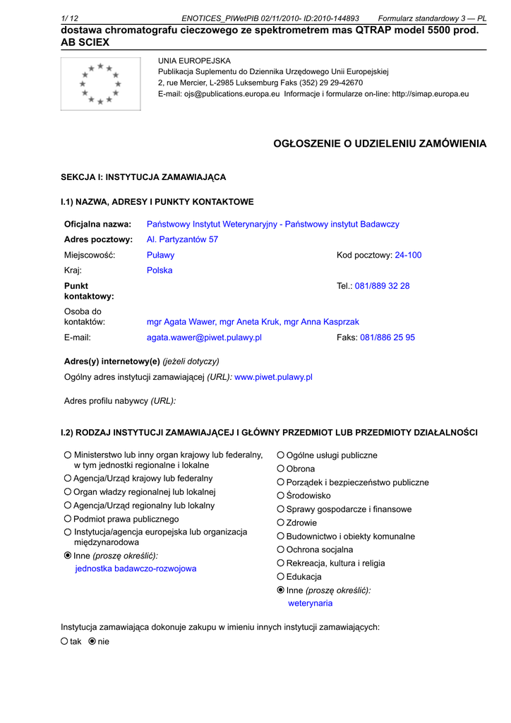 1/ 12 ENOTICES_PIWetPIB 02/11/2010- ID:2010-144893 Formularz standardowy 3 — PL dostawa chromatografu cieczowego ze spektrometrem mas QTRAP model 5500 prod. AB SCIEX UNIA EUROPEJSKA Publikacja Suplementu do Dziennika Urzędowego Unii Europejskiej 2, rue Mercier, L-2985 Luksemburg Faks (352) 29 29-42670 E-mail: [email protected] Informacje i formularze on-line: http://simap.europa.eu OGŁOSZENIE O UDZIELENIU ZAMÓWIENIA SEKCJA I: INSTYTUCJA ZAMAWIAJĄCA I.1) NAZWA, ADRESY I PUNKTY KONTAKTOWE Oficjalna nazwa: Państwowy Instytut Weterynaryjny - Państwowy instytut Badawczy Adres pocztowy: Al. Partyzantów 57 Miejscowość: Puławy Kraj: Polska Punkt kontaktowy: ______ Kod pocztowy: 24-100 Tel.: 081/889 32 28 Osoba do kontaktów: mgr Agata Wawer, mgr Aneta Kruk, mgr Anna Kasprzak E-mail: [email protected] Faks: 081/886 25 95 Adres(y) internetowy(e) (jeżeli dotyczy) Ogólny adres instytucji zamawiającej (URL): www.piwet.pulawy.pl Adres profilu nabywcy (URL): ________________________________________ I.2) RODZAJ INSTYTUCJI ZAMAWIAJĄCEJ I GŁÓWNY PRZEDMIOT LUB PRZEDMIOTY DZIAŁALNOŚCI Ministerstwo lub inny organ krajowy lub federalny, w tym jednostki regionalne i lokalne Ogólne usługi publiczne Agencja/Urząd krajowy lub federalny Porządek i bezpieczeństwo publiczne Organ władzy regionalnej lub lokalnej Agencja/Urząd regionalny lub lokalny Podmiot prawa publicznego Instytucja/agencja europejska lub organizacja międzynarodowa Inne (proszę określić): jednostka badawczo-rozwojowa Obrona Środowisko Sprawy gospodarcze i finansowe Zdrowie Budownictwo i obiekty komunalne Ochrona socjalna Rekreacja, kultura i religia Edukacja Inne (proszę określić): weterynaria Instytucja zamawiająca dokonuje zakupu w imieniu innych instytucji zamawiających: tak nie 2/ 12 ENOTICES_PIWetPIB 02/11/2010- ID:2010-144893 Formularz standardowy 3 — PL dostawa chromatografu cieczowego ze spektrometrem mas QTRAP model 5500 prod. AB SCIEX SEKCJA II: PRZEDMIOT ZAMÓWIENIA II.1) OPIS II.1.1) Nazwa nadana zamówieniu przez instytucję zamawiającą dostawa chromatografu cieczowego ze spektrometrem mas QTRAP model 5500 prod. AB SCIEX II.1.2) Rodzaj zamówienia oraz lokalizacja robót budowlanych, miejsce realizacji dostawy lub świadczenia usług (Wybrać wyłącznie jedną kategorię – roboty budowlane, dostawy lub usługi – która najbardziej odpowiada konkretnemu przedmiotowi zamówienia lub zakupu) a) Roboty budowlane b) Dostawy Wykonanie Kupno Zaprojektowanie i wykonanie Wykonanie, za pomocą dowolnych środków, obiektu budowlanego, odpowiadającego wymogom określonym przez instytucję zamawiającą Dzierżawa Najem Leasing Połączenie powyższych form c) Usługi Kategoria usługi: nr __ W przypadku zamówień na usługi kategorii 17-27 (zob. załącznik C), czy zgadzają się Państwo na publikację niniejszego ogłoszenia? tak nie Lokalizacja robót budowlanych, miejsce realizacji dostaw lub świadczenia usług Kod NUTS Â PL315 II.1.3) Ogłoszenie dotyczy (jeżeli dotyczy) Zawarcia umowy ramowej Zamówień w ramach Dynamicznego Systemu Zakupów (DSZ) II.1.4) Krótki opis zamówienia lub zakupu dostawa chromatografu cieczowego ze spektrometrem mas QTRAP model 5500 II.1.5) Wspólny Słownik Zamówień (CPV) Słownik główny Główny przedmiot 38432200 Dodatkowe przedmioty 38433100 Słownik uzupełniający (jeżeli dotyczy) II.1.6) Zamówienie jest objęte Porozumieniem w sprawie zamówień rządowych (GPA) tak nie 3/ 12 ENOTICES_PIWetPIB 02/11/2010- ID:2010-144893 Formularz standardowy 3 — PL dostawa chromatografu cieczowego ze spektrometrem mas QTRAP model 5500 prod. AB SCIEX II.2) CAŁKOWITA KOŃCOWA WARTOŚĆ ZAMÓWIENIA II.2.1) Całkowita końcowa wartość zamówienia (give figures only) (Proszę podać tylko całkowitą wartość końcową obejmującą wszystkie zamówienia, części i opcje; informacje na temat poszczególnych zamówień proszę podać wypełniając sekcję V. Udzielenie zamówienia) Wartość 1639343.00 Waluta PLN lub Najniższa oferta _ / najwyższa oferta _ brana pod uwagę Waluta ___ Bez VAT Łącznie z VAT przy przy Stawka VAT (%) __ _____ 4/ 12 ENOTICES_PIWetPIB 02/11/2010- ID:2010-144893 Formularz standardowy 3 — PL dostawa chromatografu cieczowego ze spektrometrem mas QTRAP model 5500 prod. AB SCIEX SEKCJA IV: PROCEDURA IV.1) RODZAJ PROCEDURY IV.1.1) Rodzaj procedury Otwarta Negocjacyjna z uprzednim ogłoszeniem Ograniczona Negocjacyjna przyspieszona Ograniczona przyspieszona Negocjacyjna bez uprzedniego ogłoszenia Dialog konkurencyjny Udzielenie zamówienia bez uprzedniego ogłoszenia o zamówieniu w Dzienniku Urzędowym Unii Europejskiej [w przypadkach wymienionych w lit. k) i l) załącznika D] Uzasadnienie udzielenia zamówienia bez uprzedniego ogłoszenia o zamówieniu w Dzienniku Urzędowym Unii Europejskiej: proszę wypełnić załącznik D IV.2) KRYTERIA UDZIELENIA ZAMÓWIENIA IV.2.1) Kryteria udzielenia zamówienia (proszę zaznaczyć właściwe pola) Najniższa cena LUB Oferta najkorzystniejsza ekonomicznie z uwzględnieniem kryteriów Kryteria Waga Kryteria Waga 1. ___________ ____ 6. ___________ ____ 2. ___________ ____ 7. ___________ ____ 3. ___________ ____ 8. ___________ ____ 4. ___________ ____ 9. ___________ ____ 5. ___________ ____ 10. ___________ ____ IV.2.2) Wykorzystano aukcję elektroniczną tak nie 5/ 12 ENOTICES_PIWetPIB 02/11/2010- ID:2010-144893 Formularz standardowy 3 — PL dostawa chromatografu cieczowego ze spektrometrem mas QTRAP model 5500 prod. AB SCIEX IV.3) INFORMACJE ADMINISTRACYJNE IV.3.1) Numer referencyjny nadany sprawie przez instytucję zamawiającą (jeżeli dotyczy) DG-2501/19569/1490/10 IV.3.2) Poprzednie publikacje dotyczące tego samego zamówienia tak nie Jeżeli tak, (proszę wypełnić odpowiednie pola) Wstępne ogłoszenie informacyjne lub Ogłoszenie o profilu nabywcy Numer ogłoszenia w Dz.U. UE: ____ z dnia __________ (dd/mm/rrrr) Ogłoszenie o zamówieniu lub Uproszczone Ogłoszenie o Zamówieniu (DSZ) Nu