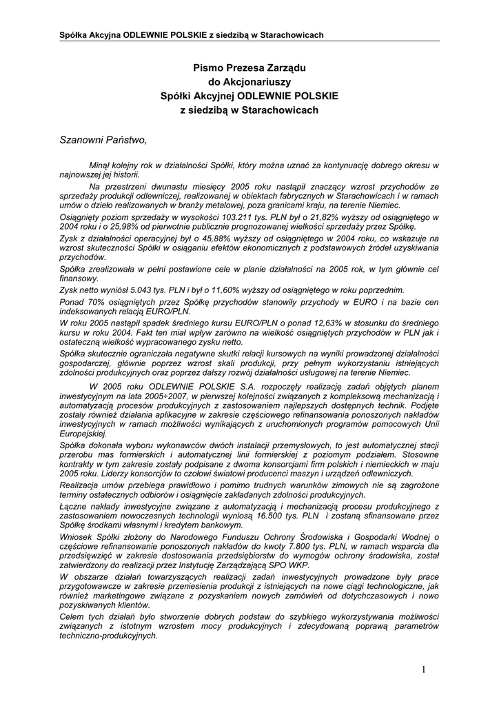 Spółka Akcyjna ODLEWNIE POLSKIE z siedzibą w Starachowicach Pismo Prezesa Zarządu do Akcjonariuszy Spółki Akcyjnej ODLEWNIE POLSKIE z siedzibą w Starachowicach Szanowni Państwo, Minął kolejny rok w działalności Spółki, który można uznać za kontynuację dobrego okresu w najnowszej jej historii. Na przestrzeni dwunastu miesięcy 2005 roku nastąpił znaczący wzrost przychodów ze sprzedaży produkcji odlewniczej, realizowanej w obiektach fabrycznych w Starachowicach i w ramach umów o dzieło realizowanych w branży metalowej, poza granicami kraju, na terenie Niemiec. Osiągnięty poziom sprzedaży w wysokości 103.211 tys. PLN był o 21,82% wyższy od osiągniętego w 2004 roku i o 25,98% od pierwotnie publicznie prognozowanej wielkości sprzedaży przez Spółkę. Zysk z działalności operacyjnej był o 45,88% wyższy od osiągniętego w 2004 roku, co wskazuje na wzrost skuteczności Spółki w osiąganiu efektów ekonomicznych z podstawowych źródeł uzyskiwania przychodów. Spółka zrealizowała w pełni postawione cele w planie działalności na 2005 rok, w tym głównie cel finansowy. Zysk netto wyniósł 5.043 tys. PLN i był o 11,60% wyższy od osiągniętego w roku poprzednim. Ponad 70% osiągniętych przez Spółkę przychodów stanowiły przychody w EURO i na bazie cen indeksowanych relacją EURO/PLN. W roku 2005 nastąpił spadek średniego kursu EURO/PLN o ponad 12,63% w stosunku do średniego kursu w roku 2004. Fakt ten miał wpływ zarówno na wielkość osiągniętych przychodów w PLN jak i ostateczną wielkość wypracowanego zysku netto. Spółka skutecznie ograniczała negatywne skutki relacji kursowych na wyniki prowadzonej działalności gospodarczej, głównie poprzez wzrost skali produkcji, przy pełnym wykorzystaniu istniejących zdolności produkcyjnych oraz poprzez dalszy rozwój działalności usługowej na terenie Niemiec. W 2005 roku ODLEWNIE POLSKIE S.A. rozpoczęły realizację zadań objętych planem inwestycyjnym na lata 2005÷2007, w pierwszej kolejności związanych z kompleksową mechanizacją i automatyzacją procesów produkcyjnych z zastosowaniem najlepszych dostępnych technik. Podjęte zostały również działania aplikacyjne w zakresie częściowego refinansowania ponoszonych nakładów inwestycyjnych w ramach możliwości wynikających z uruchomionych programów pomocowych Unii Europejskiej. Spółka dokonała wyboru wykonawców dwóch instalacji przemysłowych, to jest automatycznej stacji przerobu mas formierskich i automatycznej linii formierskiej z poziomym podziałem. Stosowne kontrakty w tym zakresie zostały podpisane z dwoma konsorcjami firm polskich i niemieckich w maju 2005 roku. Liderzy konsorcjów to czołowi światowi producenci maszyn i urządzeń odlewniczych. Realizacja umów przebiega prawidłowo i pomimo trudnych warunków zimowych nie są zagrożone terminy ostatecznych odbiorów i osiągnięcie zakładanych zdolności produkcyjnych. Łączne nakłady inwestycyjne związane z automatyzacją i mechanizacją procesu produkcyjnego z zastosowaniem nowoczesnych technologii wyniosą 16.500 tys. PLN i zostaną sfinansowane przez Spółkę środkami własnymi i kredytem bankowym. Wniosek Spółki złożony do Narodowego Funduszu Ochrony Środowiska i Gospodarki Wodnej o częściowe refinansowanie ponoszonych nakładów do kwoty 7.800 tys. PLN, w ramach wsparcia dla przedsięwzięć w zakresie dostosowania przedsiębiorstw do wymogów ochrony środowiska, został zatwierdzony do realizacji przez Instytucję Zarządzającą SPO WKP. W obszarze działań towarzyszących realizacji zadań inwestycyjnych prowadzone były prace przygotowawcze w zakresie przeniesienia produkcji z istniejących na nowe ciągi technologiczne, jak również marketingowe związane z pozyskaniem nowych zamówień od dotychczasowych i nowo pozyskiwanych klientów. Celem tych działań było stworzenie dobrych podstaw do szybkiego wykorzystywania możliwości związanych z istotnym wzrostem mocy produkcyjnych i zdecydowaną poprawą parametrów techniczno-produkcyjnych. 1 Spółka Akcyjna ODLEWNIE POLSKIE z siedzibą w Starachowicach Rok 2006 będzie kolejnym ważnym okresem w działalności gospodarczej i inwestycyjnej Spółki. Spółka prognozuje dalszy wzrost przychodów do poziomu 116.200 tys. PLN, co oznacza ponad 12% ich zwiększenie w stosunku do osiągniętych w 2005 roku, a ich ostateczna wysokość będzie uzależniona od wykorzystania możliwości wynikających ze wzrostu zdolności produkcyjnych, związanego z zakończeniem w terminie do 30 czerwca 2006 roku pierwszego etapu realizowanych inwestycji. Niemniej jednak dopiero rok 2007 będzie pierwszym okresem, w którym Spółka w pełnym zakresie wykorzystywać będzie w działalności produkcyjnej efekty uzyskane z realizacji inwestycji w obszarze automatyzacji i mechanizacji procesów produkcyjnych. W 2006 roku Spółka realizować będzie zadania inwestycyjne objęte drugim etapem planu inwestycyjnego na lata 2005÷2007 w zakresie wdrożenia programu zintegrowanego systemu topienia i obróbki pozapiecowej stopów żelaza. Szacunkowe nakłady zamkną się kwotą 9.300 tys. PLN i będą finansowane środkami własnymi i w niewielkim zakresie kredytem bankowym. Spółka aplikuje o ich częściowe refinansowanie do kwoty 2.700 tys. PLN w ramach wsparcia dla przedsiębiorstw dokonujących nowych inwestycji. Inwestycje tego etapu zostaną zakończone w pierwszym kwartale 2007 roku. Ponadto Spółka realizować będzie inwestycje towarzyszące w obszarze technologicznym i wsparcia biznesu. Nakłady w tym zakresie wyniosą 5.200 tys. PLN. Łączne nakłady Spółki na realizację programu inwestycyjnego w latach 2005÷2007 wyniosą 31.000 tys. PLN. Równolegle z rozwojem działalności produkcyjnej w kraju, Spółka będzie rozwijać swoją działalność w ramach umów o dzieło realizowanych poza granicami kraju na terenie Niemiec, z możliwością ich terytorialnego rozszerzenia na i