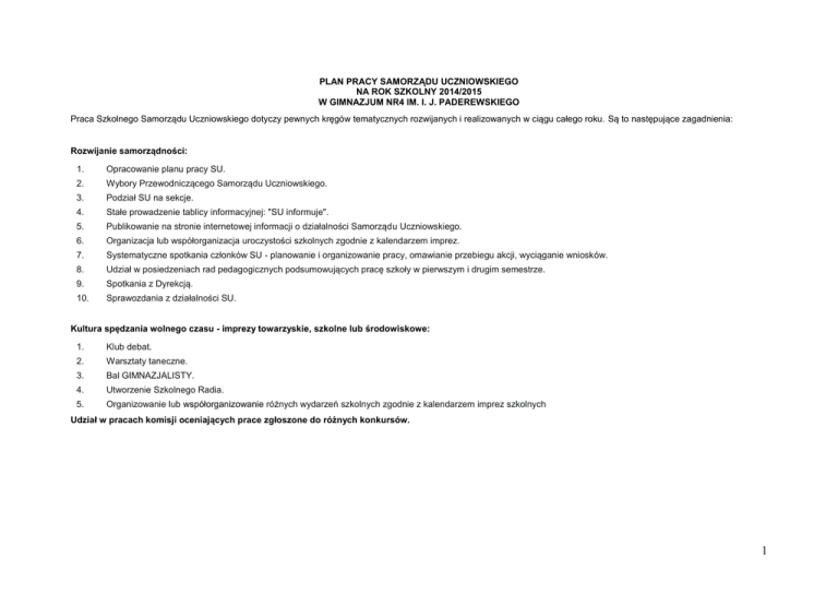 PLAN PRACY SAMORZĄDU UCZNIOWSKIEGO NA ROK SZKOLNY 2014/2015 W GIMNAZJUM NR4 IM. I. J. PADEREWSKIEGO Praca Szkolnego Samorządu Uczniowskiego dotyczy pewnych kręgów tematycznych rozwijanych i realizowanych w ciągu całego roku. Są to następujące zagadnienia: Rozwijanie samorządności: 1. Opracowanie planu pracy SU. 2. Wybory Przewodniczącego Samorządu Uczniowskiego. 3. Podział SU na sekcje. 4. Stałe prowadzenie tablicy informacyjnej: "SU informuje". 5. Publikowanie na stronie internetowej informacji o działalności Samorządu Uczniowskiego. 6. Organizacja lub współorganizacja uroczystości szkolnych zgodnie z kalendarzem imprez. 7. Systematyczne spotkania członków SU - planowanie i organizowanie pracy, omawianie przebiegu akcji, wyciąganie wniosków. 8. Udział w posiedzeniach rad pedagogicznych podsumowujących pracę szkoły w pierwszym i drugim semestrze. 9. Spotkania z Dyrekcją. 10. Sprawozdania z działalności SU. Kultura spędzania wolnego czasu - imprezy towarzyskie, szkolne lub środowiskowe: 1. Klub debat. 2. Warsztaty taneczne. 3. Bal GIMNAZJALISTY. 4. Utworzenie Szkolnego Radia. 5. Organizowanie lub współorganizowanie różnych wydarzeń szkolnych zgodnie z kalendarzem imprez szkolnych Udział w pracach komisji oceniających prace zgłoszone do różnych konkursów. 1 HARMONOGRAM IMPREZ SAMORZĄDU UCZNIOWSKIEGO 2014/2015 TERMIN ZADANIA WRZESIEŃ Wybór do SU FORMY REALIZACJI UWAGI wybory przedstawicieli do samorządu przez poszczególne klasy kampania wyborcza debata wybory do samorządu podział samorządu na sekcje Opracowanie Uczniowskiego planu pracy Samorządu zebranie samorządu wpisywanie propozycji zgłaszanych przedstawicieli do planu pracy przez ustalenie harmonogramu zadań i określenie terminów ich realizacji oraz osób odpowiedzialnych za ich wykonanie przedstawienie planu pracy SU Dyrekcji Szkoły skład Samorządu Uczniowskiego Zagospodarowanie tablicy SU szczęśliwy numerek Opracowanie regulaminu Konkurs o miano "Super Klasy" Przyjęcie pierwszoklasistów gimnazjalistów Dzień chłopaka do grona organizacja imprezy Konkurs "Gimnazjum nr 4 - gimnazjum męskim" - dziewczęta przebierają się za chłopców. 2 Dzień bez odpytywania chłopców. przygotowanie apelu PAŹDZIERNIK Obchody Dnia Edukacji Narodowej LISTOPADA Góra grosza GRUDZIEŃ Mikołajki Mikołaj w naszej szkole oraz słodkie upominki STYCZEŃ Wybory Miss i Mistera Gimnazjum nr 4 Wybory Miss i Mistera w poszczególnych klasach Zbiórka pieniędzy której, celem jest zebranie funduszy na pomoc dzieciom wychowującym się poza własną rodziną, w tym na tworzenie i dofinansowanie domów dla dzieci, rodzinnych domów dziecka, pogotowi rodzinnych, zawodowych rodzin zastępczych oraz najbardziej potrzebujących domów dziecka, które realizują prorodzinne programy wychowawcze. Dyktando dla laureatów w poszczególnych klasach bo jak wiadomo miss i mister oprócz urody, powinni mieć też coś w głowie. LUTY Walentynki - Dzień Zakochanych Poczta walentynkowa MARZEC Międzynarodowy Dzień Kobiet Konkurs "Gimnazjum nr 4 - Gimnazjum damskim" - chłopcy przebierają się za dziewczęta. Dzień bez pytania dziewcząt. Pierwszy dzień wiosny Zorganizowanie warsztatów tanecznych Projekt Sejm Dzieci i Młodzieży Zorganizowanie 4 debat plenarnych Drzwi Otwarte Pomoc w przygotowaniu części artystycznej Pomoc w sprawach organizacyjnych 3 KWIECIEŃ/ MAJ ZBIÓRKI makulatury nakrętek zużytych baterii CZERWIEC Dzień Dziecka - Mecz Uczniowie - Nauczyciele Współorganizacja meczu Festiwal projektów edukacyjnych Prace w projekty Bal gimnazjalny Zorganizowanie części artystycznej oraz krótka przemowa przewodniczącego SU komisji oceniającej poszczególne Powyższy plan zawiera ogólne propozycje pracy S.S.U. w ciągu całego roku szkolnego, przedstawione projekty mogą ulec zmianie, co zostanie uwzględnione w sprawozdaniu rocznym z pracy S.S.U. Gimnazjum nr 4 w Pile 4