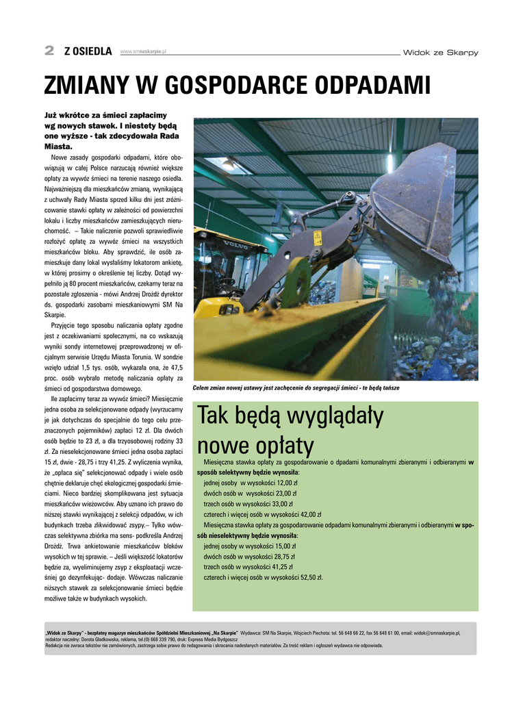 2 z osiedla www.smnaskarpie.pl Widok ze Skarpy Zmiany w gospodarce odpadami Już wkrótce za śmieci zapłacimy wg nowych stawek. I niestety będą one wyższe - tak zdecydowała Rada Miasta. Nowe zasady gospodarki odpadami, które obowiązują w całej Polsce narzucają również większe opłaty za wywóz śmieci na terenie naszego osiedla. Najważniejszą dla mieszkańców zmianą, wynikającą z uchwały Rady Miasta sprzed kilku dni jest zróżnicowanie stawki opłaty w zależności od powierzchni lokalu i liczby mieszkańców zamieszkujących nieruchomość. – Takie naliczenie pozwoli sprawiedliwie rozłożyć opłatę za wywóz śmieci na wszystkich mieszkańców bloku. Aby sprawdzić, ile osób zamieszkuje dany lokal wysłaliśmy lokatorom ankietę, w której prosimy o określenie tej liczby. Dotąd wypełniło ją 80 procent mieszkańców, czekamy teraz na pozostałe zgłoszenia - mówi Andrzej Drożdż dyrektor ds. gospodarki zasobami mieszkaniowymi SM Na Skarpie. Przyjęcie tego sposobu naliczania opłaty zgodne jest z oczekiwaniami społecznymi, na co wskazują wyniki sondy internetowej przeprowadzonej w oficjalnym serwisie Urzędu Miasta Torunia. W sondzie wzięło udział 1,5 tys. osób, wykazała ona, że 47,5 proc. osób wybrało metodę naliczania opłaty za śmieci od gospodarstwa domowego. Ile zapłacimy teraz za wywóz śmieci? Miesięcznie jedna osoba za selekcjonowane odpady (wyrzucamy je jak dotychczas do specjalnie do tego celu przeznaczonych pojemników) zapłaci 12 zł. Dla dwóch osób będzie to 23 zł, a dla trzyosobowej rodziny 33 zł. Za nieselekcjonowane śmieci jedna osoba zapłaci 15 zł, dwie - 28,75 i trzy 41,25. Z wyliczenia wynika, że „opłaca się” selekcjonować odpady i wiele osób chętnie deklaruje chęć ekologicznej gospodarki śmieciami. Nieco bardziej skomplikowana jest sytuacja mieszkańców wieżowców. Aby uznano ich prawo do niższej stawki wynikającej z selekcji odpadów, w ich budynkach trzeba zlikwidować zsypy.– Tylko wówczas selektywna zbiórka ma sens- podkreśla Andrzej Drożdż. Trwa ankietowanie mieszkańców bloków wysokich w tej sprawie. – Jeśli większość lokatorów będzie za, wyeliminujemy zsyp z eksploatacji wcześniej go dezynfekując- dodaje. Wówczas naliczanie niższych stawek za selekcjonowanie śmieci będzie możliwe także w budynkach wysokich. Celem zmian nowej ustawy jest zachęcenie do segregacji śmieci - te będą tańsze Tak będą wyglądały nowe opłaty Miesięczna stawka opłaty za gospodarowanie o dpadami komunalnymi zbieranymi i odbieranymi w sposób selektywny będzie wynosiła: jednej osoby w wysokości 12,00 zł dwóch osób w wysokości 23,00 zł trzech osób w wysokości 33,00 zł czterech i więcej osób w wysokości 42,00 zł Miesięczna stawka opłaty za gospodarowanie odpadami komunalnymi zbieranymi i odbieranymi w sposób nieselektywny będzie wynosiła: jednej osoby w wysokości 15,00 zł dwóch osób w wysokości 28,75 zł trzech osób w wysokości 41,25 zł czterech i więcej osób w wysokości 52,50 zł. „Widok ze Skarpy” - bezpłatny magazyn mieszkańców Spółdzielni Mieszkaniowej „Na Skarpie” Wydawca: SM Na Skarpie, Wojciech Piechota: tel. 56 648 66 22, fax 56 648 61 00, email: [email protected], redaktor naczelny: Dorota Gładkowska, reklama, tel.(0) 668 339 790, druk: Express Media Bydgoszcz Redakcja nie zwraca tekstów nie zamówionych, zastrzega sobie prawo do redagowania i skracania nadesłanych materiałów. Za treść reklam i ogłoszeń wydawca nie odpowiada.