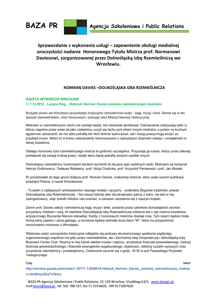 BAZA PR Agencja Szkoleniowa i Public Relations Sprawozdanie z wykonania usługi – zapewnienie obsługi medialnej uroczystości nadania Honorowego Tytułu Mistrza prof. Normanowi Daviesowi, zorganizowanej przez Dolnośląską Izbę Rzemieślniczą we Wrocławiu. NORMAN DAVIES –DOLNOŚLĄSKA IZBA RZEMIEŚLNICZA GAZETA WYBORCZA WROCŁAW 1/ 7.12.2012 Lucyna Róg - Historyk Norman Davies zostanie rzemieślniczym mistrzem . Brytyjski pisarz we Wrocławiu przywdzieje tradycyjne rzemieślnicze szaty - togę, kryzę i biret. Stanie się w ten sposób rzemieślnikiem, choć honorowym, zyskując tytuł Mistrza Narracji Historycznej Mistrzem w rzemieślniczym cechu nie zostaje każdy, kto rzemiosła spróbował. Odznaczenie zdobywają tylko ci, którzy najpierw przez wiele lat jako czeladnicy uczyli się fachu pod okiem innych mistrzów, a potem na trudnym egzaminie udowodnili, że nie tylko potrafią ten fach dobrze wykonywać, ale i swoją pracą mogą służyć za przykład innym. Mistrz to w końcu odznaczenie równoznaczne z najwyższym stopniem wiedzy i umiejętności w danej dziedzinie. Dlatego honorowy tytuł rzemieślniczego mistrza to godność szczególna. Przyznają go ludzie, którzy przez dekady poświęcali się swojej trudnej pracy i dzięki temu lepiej potrafią docenić wysiłek innych. Dolnośląscy rzemieślnicy honorowymi tytułami wyróżnili do tej pory pięć wybitnych osób. Mistrzami są kardynał Henryk Gulbinowicz, Tadeusz Różewicz, prof. Alicja Chybicka, prof. Krzysztof Penderecki i prof. Jan Miodek. W poniedziałek do tego grona dołączy prof. Norman Davies, znakomity historyk, który wiele swoich publikacji poświęcił Polsce, a nawet Wrocławiowi. - To jeden z najlepszych ambasadorów naszego miasta i ojczyzny - podkreśla Zbigniew Ładziński, prezes Dolnośląskiej Izby Rzemieślniczej. - Na naszą historię jako obcokrajowiec patrzy z boku, nie jest w nią zaangażowany, więc potrafi chłodno nas oceniać, a zarazem utożsamia się z naszym krajem. Zanim prof. Davies założy rzemieślniczą togę, kryzę i biret, zostanie przez członków dolnośląskich cechów przywitany chlebem i solą. W siedzibie Dolnośląskiej Izby Rzemieślniczej odbierze też z rąk mistrza kowalstwa artystycznego Ryszarda Mazura statuetkę. Każdy z honorowych mistrzów dostaje inną. Tym razem będzie miała formę karty papieru i pióra gęsiego, a na karcie będzie widniała duża litera "W", która ma przypominać honorowemu mistrzowi o Wrocławiu. Właściwa część uroczystości tradycyjnie odbędzie się podczas ekumenicznego spotkania wigilijnego organizowanego wspólnie nie tylko przez rzemieślników, ale i Zachodnią Izbę Gospodarczą i dolnośląską lożę Business Center Club. Wezmą w niej udział władze miasta i regionu, arcybiskup Kościoła prawosławnego, biskupi Kościoła greckokatolickiego i Kościoła ewangelicko-augsburskiego, dyplomaci, rektorzy uczelni wyższych oraz oczywiście rzemieślnicy i przedsiębiorcy. Ceremonia zacznie się o godz. 18.30 w auli Papieskiego Wydziału Teologicznego. Cały tekst: http://wroclaw.gazeta.pl/wroclaw/1,35771,13006616,Historyk_Norman_Davies_zostanie_rzemieslniczym_mistrze m.html#ixzz2Eq7VQHce BAZA PR Agencja Szkoleniowa i Public Relations, 52-129 Wrocław, Vivaldiego13/2, www.bazapr.pl, mail:[email protected], tel. 502 788 537, fax 71 319 8826, NIP 9171097620 BAZA PR 2/ Lucyna Róg 10.12.2012 Agencja Szkoleniowa i Public Relations - Jak Norman Davies został rzemieślnikiem. W którym cechu? Dolnośląscy rzemieślnicy wyróżnili wczoraj brytyjskiego pisarza swoim honorowym tytułem Mistrza Narracji Historycznej. Prof. Norman Davies przywdział rzemieślnicze tradycyjne szaty: togę, kryzę i biret. Dostał także akt nadania tytułu z pieczęcią lakową i statuetkę wykutą przez wrocławskiego mistrza kowalstwa artystycznego Ryszarda Mazura. W swojej prelekcji prof. Davies skupił się na swoich związkach z Polską, ale też z humorem opowiadał o rzemieślnikach. Podkreślał, że cechy rzemieślnicze często działają charytatywnie, a przede wszystkim kształcą młodych ludzi. - Sam nie wiem, do jakiego cechu należę - śmiał się prof. Davies, odnosząc się do świeżo zdobytego rzemieślniczego tytułu. - Może do cechu kronikarzy, bo moim narzędziem jest pióro. Brytyjski pisarz i autor wielu publikacji o historii naszego kraju przyznał, że niewiele wiedział o dziejach rzemiosła, ale gdy przyjechał wiele lat temu do Wrocławia, jego uwagę zwróciło to, że wiele ulic ma tu nazwy od zawodów rzemieślniczych. - To uświadomiło mi, jak wielkie znaczenie dla Wrocławia miało rzemiosło - mówił. Odniósł się także do ostatnich wypowiedzi prezesa PiS Jarosława Kaczyńskiego: - Wielu ludzi mówi, że Polska nie jest suwerennym krajem, że się nie budzi, że nie ma tu wolności. Proszę otworzyć oczy, jak tu naprawdę jest. Kiedy byłem tu kilkadziesiąt lat temu, wtedy nie była suwerennym krajem. Teraz widzę państwo, które ma dużo energii, sporo wspaniałych młodych ludzi i wielką miłość do narzekania. Prof. Davies jest szóstym honorowym rzemieślniczym mistrzem. W poprzednich latach tę godność przyjmowali kardynał Henryk Gulbinowicz, Tadeusz Różewicz, prof. Alicja Chybicka, prof. Krzysztof Penderecki i prof. Jan Miodek. Przyznanie tytułu tradycyjnie już odbyło się w auli Papieskiego Wydziału Teologicznego na ekumenicznym BAZA PR Agencja Szkoleniowa i Public Relations, 52-129 Wrocław, Vivaldiego13/2, www.bazapr.pl, mail:[email protected], tel. 502 788 537, fax 71 319 8826, NIP 9171097620 BAZA PR Agencja Szkoleniowa i Public Relations spotkaniu wigilijnym organizowanym wspólnie przez Dolnośląską Izbę Rzemieślniczą, Zachodnią Izbę Gospodarczą i lożę dolnośląską Business Center Club. Cały tekst: http://wroclaw.gazeta.pl/wroclaw/1,35771,13026686,Jak_Norman_Davies_zostal_rzemieslnikiem__W_ktorym.ht ml#ixzz2EqA5xOlI POLSKA AGENCJA PRASOWA 1/ 10.12.2012 Pols