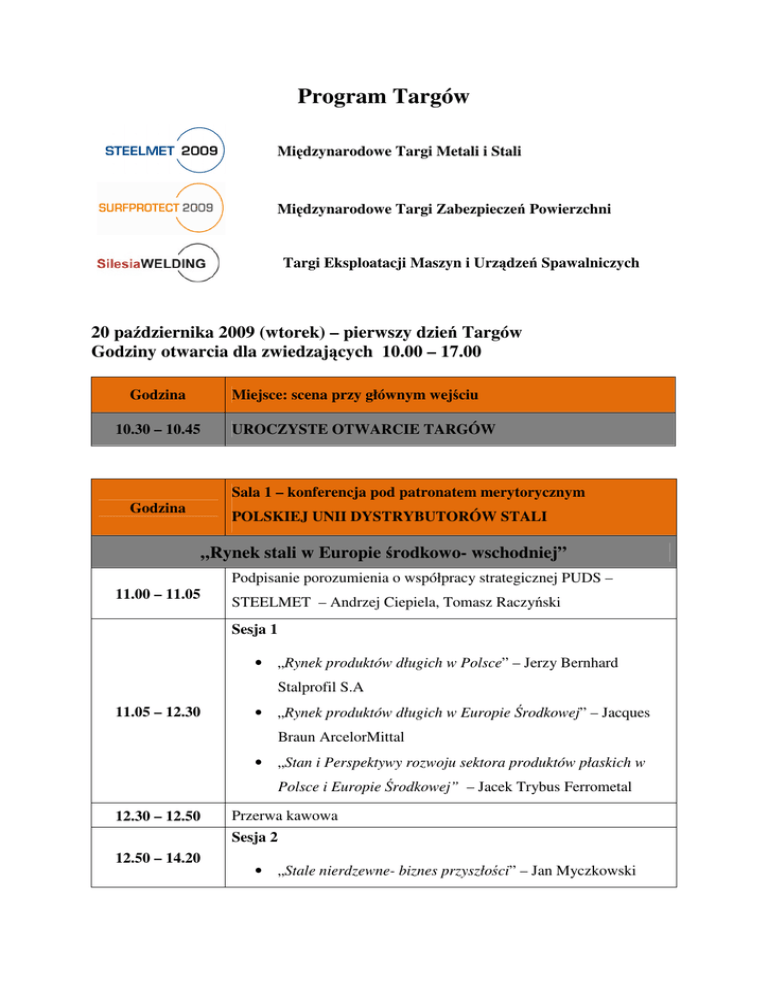 Program Targów Międzynarodowe Targi Metali i Stali Międzynarodowe Targi Zabezpieczeń Powierzchni Targi Eksploatacji Maszyn i Urządzeń Spawalniczych 20 października 2009 (wtorek) – pierwszy dzień Targów Godziny otwarcia dla zwiedzających 10.00 – 17.00 Godzina 10.30 – 10.45 Miejsce: scena przy głównym wejściu UROCZYSTE OTWARCIE TARGÓW Sala 1 – konferencja pod patronatem merytorycznym Godzina POLSKIEJ UNII DYSTRYBUTORÓW STALI „Rynek stali w Europie środkowo- wschodniej” Podpisanie porozumienia o współpracy strategicznej PUDS – 11.00 – 11.05 STEELMET – Andrzej Ciepiela, Tomasz Raczyński Sesja 1 • „Rynek produktów długich w Polsce” – Jerzy Bernhard Stalprofil S.A 11.05 – 12.30 • „Rynek produktów długich w Europie Środkowej” – Jacques Braun ArcelorMittal • „Stan i Perspektywy rozwoju sektora produktów płaskich w Polsce i Europie Środkowej” – Jacek Trybus Ferrometal 12.30 – 12.50 Przerwa kawowa Sesja 2 12.50 – 14.20 • „Stale nierdzewne- biznes przyszłości” – Jan Myczkowski • „Stal konstrukcyjna w świetle sytuacji na rynku budowlanym w Polsce” – Andrzej Ciepiela PUDS • „Wschodnie rynki stalowe po kryzysie – jaka przyszłość?” – Svetlana Dealamure MetalExpert Godzina Sala 3 – Prezentacja firmy Kirschstein & Partner „Zarządzanie Świadomością – motywacja do zachowania zgodnego z 11.00 Godzina 12.30 – 13.30 Godzina 13.00 Godzina 15.15 – 18.00 zasadami bezpieczeństwa” Sala 2 – Prezentacja Urzędu Miasta Sosnowiec „ENTER – Obszary działalności gospodarczej i otoczenie biznesu” Sala 3 – Prezentacja firmy Przemysłowy Instytut Automatyki i Pomiarów „Nowości w robotyzacji spawania” Sala 2 – Polska Unia Dystrybucji Stali Posiedzenie Zarządu Polskiej Unii Dystrybutorów Stali 21 października 2009 (środa) – drugi dzień Targów Godziny otwarcia dla zwiedzających 10.00 – 17.00 Sala 1 – konferencja pod patronatem merytorycznym Godzina HUTNICZEJ IZBY PRZEMYSŁOWO –HANDLOWEJ „Stal i cement w infrastrukturze” Powitanie uczestników – Romuald Talarek, Hutnicza Izba 10.30 – 10.35 Przemysłowo - Handlowa „Program realizacji waŜniejszych projektów infrastrukturalnych do 10.35 – 11.00 2012r.” – Ministerstwo Infrastruktury „Sytuacja w przemyśle stalowym na Świecie i w Polsce. Stal 11.00 – 11.20 tworzywem bazowym w produkcji dóbr inwestycyjnych i konsumpcyjnych” – Romuald Talarek, HIPH i Roger Manser, SBB „Protekcjonizm na rynku stalowym” („Steel market protectionism)” – 11.20 – 11.40 Karl Tachelet EUROFER „Sytuacja w przemyśle cementowym w Polsce i udział cementu w 11.40 – 12.00 realizacji projektów infrastrukturalnych” – Jan Deja, Stowarzyszenie Producentów Cementu „Innowacyjne realizacje infrastrukturalne Huty Pokój S.A” – Robert 12.00 – 12.20 12.20 – 12.40 Drachal, Huta Pokój S.A Przerwa kawowa „Plany i realizacja rozbudowy dróg i autostrad w Województwie 12.40 – 13.00 Śląskim” – Krzysztof Raj, Generalna Dyrekcja Dróg Krajowych i Autostrad „Betonowe nawierzchnie autostradowe i drogowe- technicznie i 13.00 – 13.20 ekonomicznie uzasadnione rozwiązanie” – Stowarzyszenie Producentów Cementu 13.20 – 13.40 13.40 Dyskusja, zakończenie Konferencji Poczęstunek Sala 1 – seminarium pod patronatem merytorycznym Godzina INSTYTUTU METALI NIEśELAZNYCH „Nowoczesne technologie w przeróbce rud i metali nieŜelaznych” „Maszyny flotacyjne do wzbogacania surowców mineralnych oraz 14.00 – 14.15 14.15 – 14.30 automatyczne układy ich regulacji” – A. Wiśniewski, M. Woch „Technologia przerobu pyłów stalowniczych w Bolesław Recycling Sp. z o.o.” – J. Czarnecki i in. „Recycling złomu akumulatorów niklowo-wodorkowych 14.30 – 14.45 i litowo- jonowych” – A. Chmielarz, K. Becker „Mokra metoda wapniakowi odsiarczania gazów w przemyśle metali 14.45 – 15.00 nieŜelaznych” – J. Mrozowski „Metody produkcji spektralnych certyfikowanych materiałów 15.00 – 15.30 odniesienia dla metali kolorowych i ich stopów” – E. Muller, B. Bolibrzuch Sala 2 – seminarium pod patronatem merytorycznym Godzina POLITECHNIKI ŚLĄSKIEJ „Technologie powierzchni w ochronie przed korozją elementów konstrukcji, maszyn i urządzeń” „Współczesna technologia i kierunki zastosowania cynkowania 10.00 – 16.00 zanurzeniowego” – Piotr Liberski, Henryk Kania, Paweł Podolski, Adam Tatarek „Odporne na korozję i zuŜycie ścierne powłoki otrzymywane w procesach natryskiwania cieplnego” – Bolesław Formanek, Krzysztof Szymański, Beniamin Kuczowitz „Azotowanie antykorozyjne z utlenianiem i impregnowaniem warstw inhibitorami korozji i jego zastosowanie przemysłowe” – Piotr Wach, Jerzy Michalski, Jan Tacikowski „Odporność na korozję wysokotemperaturową faz międzymetalicznych z układu Fe-Al” – Bolesław Formanek, BoŜena Szczucka-Lasota, Adam Hernas „Aktualne problemy wytwarzania powłok typu duplex na podłoŜach ocynkowanych zanurzeniowo” – Marzena Nowicka-Nowak, Małgorzata Zubielewicz „Odporność korozyjna stali austenityczno-ferrytycznej typu duplex w środowisku wilgotnego H2S” – Maria Sozańska „Odporność na utlenianie powłok Ŝaroodpornych typu TiAlSi + NiCoCrAlY na stopie międzymetalicznym TiAlCrNb” – Grzegorz Moskal, Marek Góral, Lucjan Swadźba, Bogusław Mendala, Wacław Supernak „Zastosowanie metody rysy i Kulotestera do oceny jakości cienkich powłok odpornych na zuŜycie tribologiczne i utlenianie wysokotemperaturowe” – Marek Betiuk, Irena Pokorska „Odporność korozyjna bezniklowej stali austenitycznej Cr-Mn w atmosferze utleniającej zawierającej tlenki węgla i parę wodną” – Roman Przeliorz „Natryskiwane cieplnie powłoki odporne na zuŜycie erozyjno – korozyjne stosowane na elementach urządzeń energetycznych” – Bolesław Formanek, Krzysztof Szymański „Odporność korozyjna po