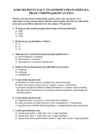 KOKURS DOTYCZĄCY ZNAJOMOŚCI PRAW DZIECKA, PRAW I OBOWIĄZKÓW UCZNIA Poniższy test jest testem wielokrotnego wyboru, może więc się zdarzyć, że w odpowiedzi na dane pytanie będzie należało wybrać jedną, dwie lub trzy odpowiedzi, może także prawidłowa odpowie dź nie być podana. Powodzenia! 1. W którym roku została przyjęta Konwencja o Prawach Dziecka? a) 2000 b) 1989 c) 1999 2. Do ilu lat jest się dzieckiem w Polsce? a) 13 b) 16 c) 18 3. Jakie ma być w myśl Konwencji nauczanie podstawowe? a) nieobowiązkowe i bezpłatne b) obowiązkowe i bezpł atne c) obowiązkowe i częściowo refundowane 4. Państwa-Strony Konwencji chcą zlikwidować na świecie: a) integrację b) tolerancję c) analfabetyzm 5. Uczeń szkoły ma prawo do: a) informacji na temat zakresu wymagań oraz metod nauczania b) tajnej i nie umotywowanej oceny p ostępów w nauce i zachowaniu c) poznania Zarządzenia Ministra Edukacji Narodowej w sprawie zasad oceniania, klasyfikowania i promowania oraz przeprowadzania egzaminów sprawdzających i klasyfikacyjnych 6. Uczeń szkoły ma prawo do: a) znajomości praw zawartych w Konwencji Praw Dziecka b) pełnej niewiedzy na temat kryteriów ocen z przedmiotów i z zachowania c) tygodniowego rozkładu lekcji niezgodnego z zasadami higieny pracy umysłowej 7. Liczba sprawdzianów jest: a) ograniczona (jeden w ciągu dnia, trzy w ciągu tygodnia), b) ograniczona (dwa w ciągu dnia, trzy w ciągu tygodnia), c) ograniczonej liczby sprawdzianów (jeden w ciągu dnia, cztery w ciągu tygodnia) autor: Bożena Sławińska 8. Uczeń szkoły ma prawo do: a) rozwijania zainteresowań, zdolności i talentów b) swobody wyrażania myśli i przekonań, o ile nie na ruszają one dobra osobistego osób trzecich c) pomocy ze strony nauczycieli w przypadku trudności w nauce 9. Uczeń szkoły ma obowiązek : a) przestrzegać postanowień zawartych w Statucie Szkoły b) systematycznie i biernie uczestniczyć w zajęciach lekcyjnych c) dbać o wspólnie o nieporządek w szkole, 10. Uczeń szkoły ma obowiązek : a) dbać o honor i tradycję szkoły b) podporządkować się zaleceniom i zarządzeniom dyrektora szkoły, Rady Pedagogicznej oraz ustaleniom Samorządu Uczniowskiego c) okazywać szacunek nauczycielom, wyc howawcom, pracownikom szkoły i ludziom starszym poprzez społecznie akceptowane formy 11. Uczeń może otrzymywać nagrody i wyróżnienia za: a) prace na rzecz szkoły i środowiska b) wrażliwość na krzywdę i pomoc potrzebującym c) dzielność i odwagę 12. Kto przyznaje nagrody? a) Dyrektor Szkoły b) Rada Rodziców c) Rada Pedagogiczna 13. Jakie są możliwe nagrody? a) dyplom b) nagrody rzeczowe c) wpis do kroniki szkolnej 14. Za co karany jest uczeń? a) zakłócenia toku zajęć edukacyjnych b) wybitne osiągnięcia, w nauce i sporcie c) lekceważenie obowiązków szkolny ch, szczególnie ucieczka z lekcji, wagary 15. Jakie są możliwe kary? a) pisemne powiadomienie rodziców o niewłaściwym zachowaniu ucznia, b) zakaz udziału w imprezach i wycieczkach szkolnych, c) zakaz reprezentowania szkoły na zewnątrz. autor: Bożena Sławińska