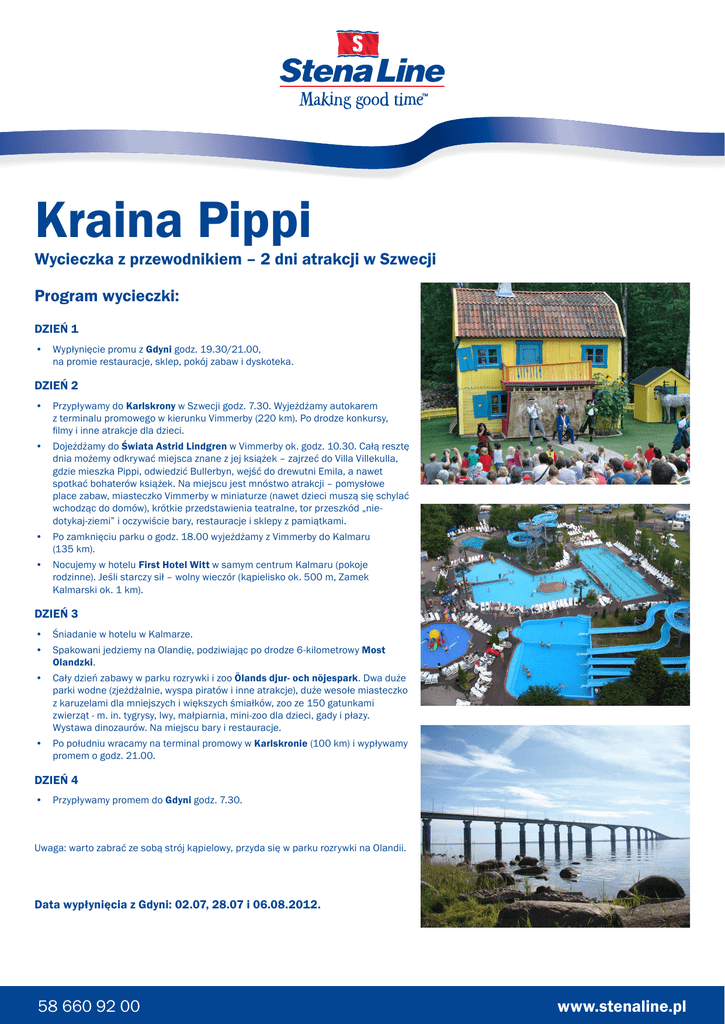 Kraina Pippi Wycieczka z przewodnikiem – 2 dni atrakcji w Szwecji Program wycieczki: DZIEŃ 1 • Wypłynięcie promu z Gdyni godz. 19.30/21.00, na promie restauracje, sklep, pokój zabaw i dyskoteka. DZIEŃ 2 • Przypływamy do Karlskrony w Szwecji godz. 7.30. Wyjeżdżamy autokarem z terminalu promowego w kierunku Vimmerby (220 km). Po drodze konkursy, filmy i inne atrakcje dla dzieci. • Dojeżdżamy do Świata Astrid Lindgren w Vimmerby ok. godz. 10.30. Całą resztę dnia możemy odkrywać miejsca znane z jej książek – zajrzeć do Villa Villekulla, gdzie mieszka Pippi, odwiedzić Bullerbyn, wejść do drewutni Emila, a nawet spotkać bohaterów książek. Na miejscu jest mnóstwo atrakcji – pomysłowe place zabaw, miasteczko Vimmerby w miniaturze (nawet dzieci muszą się schylać wchodząc do domów), krótkie przedstawienia teatralne, tor przeszkód „niedotykaj-ziemi” i oczywiście bary, restauracje i sklepy z pamiątkami. • Po zamknięciu parku o godz. 18.00 wyjeżdżamy z Vimmerby do Kalmaru (135 km). • Nocujemy w hotelu First Hotel Witt w samym centrum Kalmaru (pokoje rodzinne). Jeśli starczy sił – wolny wieczór (kąpielisko ok. 500 m, Zamek Kalmarski ok. 1 km). DZIEŃ 3 • Śniadanie w hotelu w Kalmarze. • Spakowani jedziemy na Olandię, podziwiając po drodze 6-kilometrowy Most Olandzki. • Cały dzień zabawy w parku rozrywki i zoo Ölands djur- och nöjespark. Dwa duże parki wodne (zjeżdżalnie, wyspa piratów i inne atrakcje), duże wesołe miasteczko z karuzelami dla mniejszych i większych śmiałków, zoo ze 150 gatunkami zwierząt - m. in. tygrysy, lwy, małpiarnia, mini-zoo dla dzieci, gady i płazy. Wystawa dinozaurów. Na miejscu bary i restauracje. • Po południu wracamy na terminal promowy w Karlskronie (100 km) i wypływamy promem o godz. 21.00. DZIEŃ 4 • Przypływamy promem do Gdyni godz. 7.30. Uwaga: warto zabrać ze sobą strój kąpielowy, przyda się w parku rozrywki na Olandii. Data wypłynięcia z Gdyni: 02.07, 28.07 i 06.08.2012. 58 660 92 00 •www.stenaline.pl
