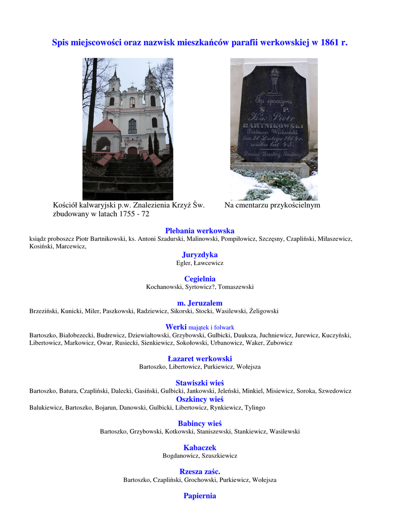 Spis miejscowości oraz nazwisk mieszkańców parafii werkowskiej w 1861 r. Kościół kalwaryjski p.w. Znalezienia Krzyż Św. zbudowany w latach 1755 - 72 Na cmentarzu przykościelnym Plebania werkowska ksiądz proboszcz Piotr Bartnikowski, ks. Antoni Szadurski, Malinowski, Pompiłowicz, Szczęsny, Czapliński, Miłaszewicz, Kosiński, Marcewicz, Juryzdyka Egler, Ławcewicz Cegielnia Kochanowski, Syrtowicz?, Tomaszewski m. Jeruzalem Brzeziński, Kunicki, Miler, Paszkowski, Radziewicz, Sikorski, Stocki, Wasilewski, Żeligowski Werki majątek i folwark Bartoszko, Białobezecki, Budrewicz, Dziewiałtowski, Grzybowski, Gulbicki, Dauksza, Juchniewicz, Jurewicz, Kuczyński, Libertowicz, Markowicz, Owar, Rusiecki, Sienkiewicz, Sokołowski, Urbanowicz, Waker, Zubowicz Łazaret werkowski Bartoszko, Libertowicz, Purkiewicz, Wołejsza Stawiszki wieś Bartoszko, Batura, Czapliński, Dalecki, Gasiński, Gulbicki, Jankowski, Jeleński, Minkiel, Misiewicz, Soroka, Szwedowicz Oszkincy wieś Balukiewicz, Bartoszko, Bojarun, Danowski, Gulbicki, Libertowicz, Rynkiewicz, Tylingo Babincy wieś Bartoszko, Grzybowski, Kotkowski, Staniszewski, Stankiewicz, Wasilewski Kabaczek Bogdanowicz, Szuszkiewicz Rzesza zaśc. Bartoszko, Czapliński, Grochowski, Purkiewicz, Wołejsza Papiernia Aleszkiewicz, Borkowski, Kołyszko, Lipniewicz, Ordyniec, Piotrowski, Pozniak, Rynkiewicz, Szynkowski, Wojciechowicz Krzyżaki zaśc. Jakubcewicz, Jankowski, Kotkowski, Rynkiewicz, Sokołowski, Stankiewicz, Szwed Dworzyszcze zaśc. Bartoszko, Kowalewski, Rodzewicz, Zdanowicz wieś Fabianiszki Bartoszko, Batura, Bienkowski, Jurewicz, Kołaszewski, Kononowicz, Matarewicz, Mickiewicz, Mieczkowski, Rusakiewicz, Stankiewicz, Tołoczko, Tomaszewski. Bondary wieś Bartoszko, Bernatowicz, Bujnowski, Januszewicz, Kononowicz, Kułakowski, Matulewicz, Mieczkowski, Mikulewicz, Ower, Pszczołowski, Sananowicz, Sinkiewicz, Sokołowski, Stankiewicz, Szałkowski, Tomaszewski, Wojtkiewicz Skiersini wieś Grzybowski, Jurewicz, Pietkiewicz, Siejun Krempla zaśc. Jurewicz, Szołkowski Trynopol okolica Biełuński, Jurewicz, Kozłowski, Miłaszewicz, Rynkiewicz, Urbanowicz, Wiszniewski Bołtupie wieś Borysewicz, Dubicki, Kiziniewicz, Klimowicz, Kotkowski, Latecki, Lewandowski, Markiewicz, Możejko, Siwicki, Strzałkowski Nowosiołki wieś Kiziniewicz, Palczewski, Popławski, Siwicki Bołtupie folw. Dubicki, Klimowicz, Poda, Stankiewicz Ponaryszki zaśc. Łunkiewicz, Olechnowicz Szaszkinia Góra wieś Kiziniewicz, Siwicki, Strzałkowski, Uzielewicz Wanaginia zaśc. Chmielewski, Jałowiecki, Jastrzębski, Kwiatkowski, Rogowski, Romanowski, Rynkiewicz, Tomaszewicz Gulbiny wieś Aleksandrowicz, Apalewicz, Baranowski, Batura, Chmielewski, Czernis, Czerwski?, Daszkiewicz, Ejdziukiewicz, Gajlan, Jankiewicz, Januszewicz, Kozłowski, Mackiewicz, Oleszkiewicz, Płatkowski, Pradziadowicz, Rypiński, Sawrycki?, Stankiewicz, Witkowski, Zawadzki, Żebrowski Krzyżaki folw. Czyż Krzyżaki wieś Garasimowicz, Gierasimowicz, Stankiewicz, Saulewicz Podjeziory zaśc. Rynkiewicz Raj krzyżacki zaśc. Butkiewicz, Darasewicz, Zaniewski Rzesza Kapitulna folw. Jeliński, Łoszakiewicz, Sadowski, Sienkiewicz, Urbanowicz Etmincy wieś Butkiewicz, Garasimowicz, Kiwiński, Szarski, Stankiewicz Polesie wieś Gorski, Łukaszewicz, Malinowski, Piotrowski, Rynkiewicz, Symonowicz Czymboryszki zaśc. Hermanowicz Zarowcy zaśc. Bojarun, Korzeniewski, Olechnowicz Podwilańcy zaśc. Bulgierd, Dubicki, Szydłowski, Wołejsza, Zacharewicz, Żukowski Zadworańcy zaśc. Czyrko, Żukowski Giedwidzie zaśc. Wołejsza Awiżenie zaśc. Bogdziewicz, Czyrko, Gadomski, Mackiewicz, Ogonowski, Rakowski, Romanowski, Skibiniewski, Szynkiewicz, Urbanowicz, Zapolski Taranda wieś Dziatłowski, Kamiński, Ordyniec, Szyrwiński, Zacharewicz, Żukowski Zabłocie zaśc. Andrzejewicz, Bykowski, Jagieło, Kociełowicz, Stankiewicz, Sualewicz, Wołkonowski Poguba Krzyżacka zaśc. Żyliński, Lachowicz, Oleszkiewicz, Butkiewicz Bukiszki Radziwiłowskie dwór Matusewicz, Naborowski, Rachwiłowicz ?, Sienkiewicz Wasiliszki zaśc. Jurkiewicz, Iwaszkiewicz Poczta Baniewicz, Cwirko, Galewicz, Karmazyn, Marcinkiewicz, Michałowski, Stankiewicz, Werkowski Gudeli wieś Chodkiewicz, Linkiewicz, Olechnowicz, Rynkiewicz, Sawicki, Wołosewicz, Żukowski Gajłaszy zaśc. Szumski Żudziszki zaśc. Aleksandrowicz, Briżis, Dauksza, Kiwiński, Sobolewski, Stankiewicz, Tracewicz, Schoryński, Werkowski Rzesza dwór (Kostrowickich) Buczyński, Januszewski, Łokiejsza, Michałowski, Pietrowski, Rodziewicz, Stankiewicz, Wasilewski Miedzichowszczyzna folw. Jagiełowicz, Niechwiadowicz Miedzichowszczyzna wieś Filipowicz, Stankiewicz, Gorecki Szuksztule wieś Sualewicz, Marcinkiewicz, Sosnowski, Strutyński, Zajkiewicz Tymińszczyzna zaścianek Sinkiewicz, Stankiewicz Rostyniszki Gliński, Borys Klonówka zaśc. Subotkowski Bondary zaśc. Żołkowski, Romanowski, Użdel Warlinka zaśc. Krukowski Bondary Górne wieś Izocki, Krukowski, Karmazyn, Klementowicz, Lipiński, Maciejewicz, Maculewicz, Marcienkiewicz, Plewako, Rymsza, Siemaszko, Wąsewicz, Subotkowski, Szołkowski Rzesz Mała Filipowicz, Baranowicz, Monkiewicz, Ciesiun Buda zaśc. Kowalewski Russaki Górne zaśc. Werkowski, Kowalewski, Mazurkiewicz, Mazura Russaki Dolne wieś Proko...?, Symonowicz, Połsiuk, Olechnowicz, Łukaszewicz Rzesza dwór Sadowski Augusta zaśc. Sienkiewicz, Zaniewski Lindziszki wieś Bartoszewicz, Dombrowski, Dowejka, Jastrzembski, Karmazyn, Łosionok, Markowski, Morawski, Symonowicz, Prokopowicz, Szyłowicz, Pawłowicz, Słupecki, Pietrowski, Tomaszewski, Zapolski, Żebrowski Magazynek Białous Zwieraliszki wieś Bandarewicz, Bogdanowicz, Żebrowski, Szerwiński, Januszkiewicz, Karmazyn, Korzeniewski, Łysionok, Malinowski, Woronowicz, Pietrowski, Roszyński, Taraszkiewicz Rzesza miasteczko Bydrak, Rakowski, Hermanowicz, Kłusewicz, Kondratowicz, Kulinkowski, Mazurkiewicz, Wasilewski, Wolewicz, Kalwiński Młyn rzeszański Jasiewicz, Wolejszo Jadw