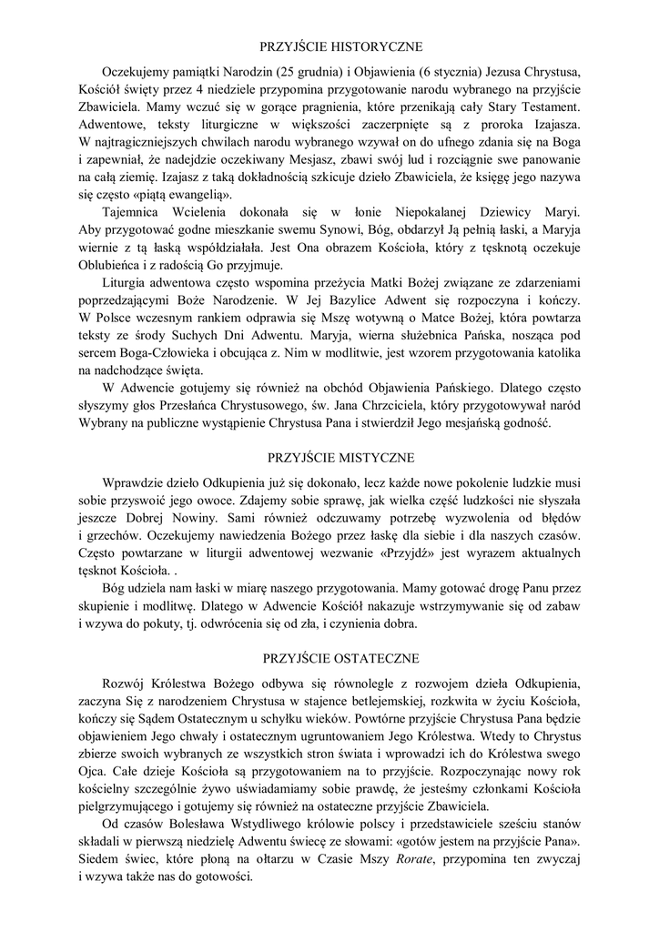 PRZYJŚCIE HISTORYCZNE Oczekujemy pamiątki Narodzin (25 grudnia) i Objawienia (6 stycznia) Jezusa Chrystusa, Kościół święty przez 4 niedziele przypomina przygotowanie narodu wybranego na przyjście Zbawiciela. Mamy wczuć się w gorące pragnienia, które przenikają cały Stary Testament. Adwentowe, teksty liturgiczne w większości zaczerpnięte są z proroka Izajasza. W najtragiczniejszych chwilach narodu wybranego wzywał on do ufnego zdania się na Boga i zapewniał, że nadejdzie oczekiwany Mesjasz, zbawi swój lud i rozciągnie swe panowanie na całą ziemię. Izajasz z taką dokładnością szkicuje dzieło Zbawiciela, że księgę jego nazywa się często «piątą ewangelią». Tajemnica Wcielenia dokonała się w łonie Niepokalanej Dziewicy Maryi. Aby przygotować godne mieszkanie swemu Synowi, Bóg, obdarzył Ją pełnią łaski, a Maryja wiernie z tą łaską współdziałała. Jest Ona obrazem Kościoła, który z tęsknotą oczekuje Oblubieńca i z radością Go przyjmuje. Liturgia adwentowa często wspomina przeżycia Matki Bożej związane ze zdarzeniami poprzedzającymi Boże Narodzenie. W Jej Bazylice Adwent się rozpoczyna i kończy. W Polsce wczesnym rankiem odprawia się Mszę wotywną o Matce Bożej, która powtarza teksty ze środy Suchych Dni Adwentu. Maryja, wierna służebnica Pańska, nosząca pod sercem Boga-Człowieka i obcująca z. Nim w modlitwie, jest wzorem przygotowania katolika na nadchodzące święta. W Adwencie gotujemy się również na obchód Objawienia Pańskiego. Dlatego często słyszymy głos Przesłańca Chrystusowego, św. Jana Chrzciciela, który przygotowywał naród Wybrany na publiczne wystąpienie Chrystusa Pana i stwierdził Jego mesjańską godność. PRZYJŚCIE MISTYCZNE Wprawdzie dzieło Odkupienia już się dokonało, lecz każde nowe pokolenie ludzkie musi sobie przyswoić jego owoce. Zdajemy sobie sprawę, jak wielka część ludzkości nie słyszała jeszcze Dobrej Nowiny. Sami również odczuwamy potrzebę wyzwolenia od błędów i grzechów. Oczekujemy nawiedzenia Bożego przez łaskę dla siebie i dla naszych czasów. Często powtarzane w liturgii adwentowej wezwanie «Przyjdź» jest wyrazem aktualnych tęsknot Kościoła. . Bóg udziela nam łaski w miarę naszego przygotowania. Mamy gotować drogę Panu przez skupienie i modlitwę. Dlatego w Adwencie Kościół nakazuje wstrzymywanie się od zabaw i wzywa do pokuty, tj. odwrócenia się od zła, i czynienia dobra. PRZYJŚCIE OSTATECZNE Rozwój Królestwa Bożego odbywa się równolegle z rozwojem dzieła Odkupienia, zaczyna Się z narodzeniem Chrystusa w stajence betlejemskiej, rozkwita w życiu Kościoła, kończy się Sądem Ostatecznym u schyłku wieków. Powtórne przyjście Chrystusa Pana będzie objawieniem Jego chwały i ostatecznym ugruntowaniem Jego Królestwa. Wtedy to Chrystus zbierze swoich wybranych ze wszystkich stron świata i wprowadzi ich do Królestwa swego Ojca. Całe dzieje Kościoła są przygotowaniem na to przyjście. Rozpoczynając nowy rok kościelny szczególnie żywo uświadamiamy sobie prawdę, że jesteśmy członkami Kościoła pielgrzymującego i gotujemy się również na ostateczne przyjście Zbawiciela. Od czasów Bolesława Wstydliwego królowie polscy i przedstawiciele sześciu stanów składali w pierwszą niedzielę Adwentu świecę ze słowami: «gotów jestem na przyjście Pana». Siedem świec, które płoną na ołtarzu w Czasie Mszy Rorate, przypomina ten zwyczaj i wzywa także nas do gotowości.