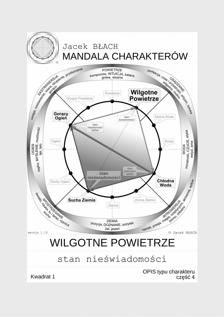 Jacek BŁACH MANDALA CHARAKTERÓW WILGOTNE POWIETRZE stan nieświadomości wersja 1 Kwadrat 1 OPIS typu charakteru – część 4 Copyright © 2013 Jacek BŁACH MANDALA CHARAKTERÓW wersja 1 Opracowanie graficzne Jacek Błach Grafika na okładce Jacek Błach Wszelkie prawa zastrzeżone. Nieautoryzowane rozpowszechnianie całości lub fragmentu niniejszej publikacji w jakiejkolwiek postaci jest zabronione. Wykonywanie kopii metodą kserograficzną, fotograficzną, a także kopiowanie książki na nośniku filmowym, magnetycznym lub innym powoduje naruszenie praw autorskich niniejszej publikacji. Wszystkie znaki występujące w tekście są zastrzeżonymi znakami firmowymi bądź towarowymi ich właścicieli. Autor dołożył wszelkich starań, by zawarte w tej książce informacje były kompletne i rzetelne. Nie bierze jednak żadnej odpowiedzialności ani za ich wykorzystanie, ani za związane z tym ewentualne naruszenie praw patentowych lub autorskich. Autor nie ponosi również żadnej odpowiedzialności za ewentualne szkody wynikłe z wykorzystania informacji zawartych w książce. Jacek BŁACH e-mail: [email protected] WWW: http://www.mandalacharakterow.pl Drogi Czytelniku! Zapraszam do oceniania i komentowania niniejszej publikacji oraz innych publikacji opisujących „Mandalę Charakterów” na stronie: http://www.mandalacharakterow.pl Możesz tam wpisać swoje uwagi, spostrzeżenia, recenzję oraz zapoznawać się na bieżąco z najnowszymi publikacjami o „Mandali Charakterów”. © Jacek BŁACH MANDALA CHARAKTERÓW WILGOTNE POWIETRZE – stan nieświadomości str. 4 Stan nieświadomości Wilgotnego Powietrza W swoim stanie nieświadomości typ Wilgotne Powietrze przechodzi do miejsca na naszej mandali charakterów, gdzie znajduje się punkt oznaczony jako Sucha Ziemia. Miejsce to znajduje się dokładnie naprzeciwko stanu świadomości Wilgotnego Powietrza i jest ono od niego najbardziej oddalone. Takie rozmieszczenie stanu świadomości i stanu nieświadomości w symboliczny sposób oddaje to, że świadomie mamy na stan nieświadomości najmniejszy wpływ. Analogicznie można też powiedzieć, że kiedy przebywamy w stanie nieświadomości, nasza typowa świadomość jest najbardziej od nas oddalona i mamy z nią najmniejszy kontakt. © Jacek BŁACH MANDALA CHARAKTERÓW WILGOTNE POWIETRZE – stan nieświadomości str. 5 Dla Wilgotnego Powietrza więc jego stan nieświadomości znajduje się w miejscu Suchej Ziemi. W symbolicznym sensie Sucha Ziemia zaczyna mieć wtedy przeważający wpływ na Wilgotne Powietrze. Zastanówmy się zatem nad tym, co może się kryć za zwrotem – Sucha Ziemia – żeby lepiej zrozumieć, co dzieje się z Wilgotnym Powietrzem w jego stanie nieświadomości? Zacznijmy może od słowa – Ziemia. Ziemia to przede wszystkim coś konkretnego, coś, czego można dotknąć, co jest namacalne, coś, co można poczuć, na czym można się oprzeć, stanąć itd. Ziemia więc może w ży ciu reprezentować takie spawy jak np.: rozsądek, zasadniczość, stawianie i opieranie się konkretach. Dalej mogą to być sprawy i rzeczy, które są: wyraźne, praktyczne, cielesne, fizyczne, materialne, nieabstrakcyjne, ściśle określone, niepodlegające dyskusji, pozbawione wątpliwości, ustalone, przebywające na swoim miejscu, znające swoje miejsce, zajmujące dogodną pozycję itp. Ziemia w życiu oznacza zatem kierowanie się pewnymi i sprawdzonymi sposobami. Takimi, które zapewnią sukces i zaprowadzą prosto do celu. Ziemia więc nierozerwalnie jest powiązana z takimi zasadami życiowymi, które, mówiąc w przenośni, są jak ziarna, które po zasadzaniu ich w ziemi i wydadzą możliwie obfite plony. Od bardzo dawna Ziemia symbolicznie jest też określana jako – Matka Ziemia, głównie ze względu na to, że zapewnia nam pożywienie. Daje Ona nam również schronienie oraz ubiera nas i ogólnie mówiąc, zaspokaja nasze podstawowe potrzeby. W psychologicznym sensie Matka Ziemia daje nam jeszcze nasze miejsce na Ziemi, do którego możemy się odnosić, i do którego zawsze możemy powracać. Powracać, zarówno w dosłownym sensie, jak i przenośnym. Jeśli chodzi o sens przenośny, to mówi się np. „powracać do czegoś myślami”. Dajmy na to „powracać myślami do domu rodzinnego”. W naszej psychice zatem kierowanie się Ziemią będzie oznaczać to, że jeśli nasze postępowanie jest jak Ziemia, to powinno ono „rodzić” różnorakie plony. Oczywiście trzeba przy tym jeszcze wykazać się odpowiednim postępowaniem i należy spełnić różne warunki, czyli warto odpowiednio zadbać o nasze „Ziemskie działanie”, żeby przynosiło ono zadowalające nas plony. Powinniśmy więc dbać o plony naszego działania, podobnie jak matka dba o swoje dzieci, gdyż po prostu, jeśli dobrze ona o nie dba, wówczas będzie miała z nich pociechę. Skoro mowa o ludzkiej matce, czyli matce swoich dzieci, to daje im ona odpowiednie wychowanie. Wychowaniem tym są np. różne zasady postępowania i współżycia z innymi ludźmi. Ludzka matka daje nam więc, jak to się mówi – „wartości wyniesione z domu”. Wartości te zaś stanowią podstawę naszego postępowania, jakim kierujemy się w życiu. Ta podstawa postępowania zaś w pewnym sensie jest naszym miejscem na Ziemi. Miejscem, które stanowi podstawowy punkt odniesienia w naszym życiu. Ludzka matka daje nam zatem również miejsce na naszej Matce Ziemi. Jest to miejsce, które może być rzeczywiste, dajmy na to w postaci naszego domu rodzinnego lub miejscowości, regionu czy kraju, z którego pochodzimy, gdzie dorastaliśmy i z którym się utożsamiamy. Przede wszystkim jednak jest to miejsce znajdujące się w naszej psychice, do którego ciągle wracamy wspomnieniami i co rusz się do niego odnosimy w ciągu naszego życia. Oprócz powyższych znaczeń Ziemi, może ona również symbolicznie wyrażać odbieranie otoczenia wokół nas za pomocą naszych zmysłów. Chodzi mi