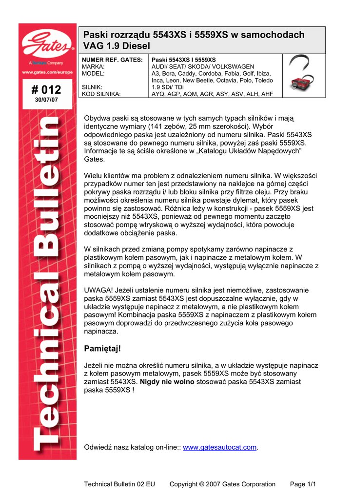 Paski rozrządu 5543XS i 5559XS w samochodach VAG 1.9 Diesel NUMER REF. GATES: MARKA: MODEL: # 012 30/07/07 SILNIK: KOD SILNIKA: Paski 5543XS I 5559XS AUDI/ SEAT/ SKODA/ VOLKSWAGEN A3, Bora, Caddy, Cordoba, Fabia, Golf, Ibiza, Inca, Leon, New Beetle, Octavia, Polo, Toledo 1.9 SDi/ TDi AYQ, AGP, AQM, AGR, ASY, ASV, ALH, AHF Obydwa paski są stosowane w tych samych typach silników i mają identyczne wymiary (141 zębów, 25 mm szerokości). Wybór odpowiedniego paska jest uzależniony od numeru silnika. Paski 5543XS są stosowane do pewnego numeru silnika, powyżej zaś paski 5559XS. Informacje te są ściśle określone w „Katalogu Układów Napędowych” Gates. Wielu klientów ma problem z odnalezieniem numeru silnika. W większości przypadków numer ten jest przedstawiony na naklejce na górnej części pokrywy paska rozrządu i/ lub bloku silnika przy filtrze oleju. Przy braku możliwości określenia numeru silnika powstaje dylemat, który pasek powinno się zastosować. Różnica leży w konstrukcji - pasek 5559XS jest mocniejszy niż 5543XS, ponieważ od pewnego momentu zaczęto stosować pompę wtryskową o wyższej wydajności, która powoduje dodatkowe obciążenie paska. W silnikach przed zmianą pompy spotykamy zarówno napinacze z plastikowym kołem pasowym, jak i napinacze z metalowym kołem. W silnikach z pompą o wyższej wydajności, występują wyłącznie napinacze z metalowym kołem pasowym. UWAGA! Jeżeli ustalenie numeru silnika jest niemożliwe, zastosowanie paska 5559XS zamiast 5543XS jest dopuszczalne wyłącznie, gdy w układzie występuje napinacz z metalowym, a nie plastikowym kołem pasowym! Kombinacja paska 5559XS z napinaczem z plastikowym kołem pasowym doprowadzi do przedwczesnego zużycia koła pasowego napinacza. Pamiętaj! Jeżeli nie można określić numeru silnika, a w układzie występuje napinacz z kołem pasowym metalowym, pasek 5559XS może być stosowany zamiast 5543XS. Nigdy nie wolno stosować paska 5543XS zamiast paska 5559XS ! Odwiedź nasz katalog on-line:: www.gatesautocat.com. Technical Bulletin 02 EU Copyright © 2007 Gates Corporation Page 1/1