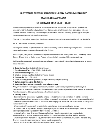 III OTWARTE ZAWODY JEŹDZIECKIE „PONY GAMES & LEAD LINE” STAJNIA LEŚNA POLANA 17 CZERWIEC 2012 12.00 – 16.00 Pony Games pojawiły się w Wielkiej Brytanii pod koniec lat 50-tych. Natychmiast spotkały się z uznaniem i odniosły całkowity sukces. Pony Games uczą sztuki jeździectwa bazując na zabawie i zarazem zdrowej rywalizacji. Dzieci uczą się jeździectwa poprzez zabawę , pozostając w związku z koniem dopasowanym do swojego wzrostu. Obecnie ta dyscyplina sportu jest bardzo rozpowszechniona i ma swoich oddanych zwolenników m. in.: we Francji, Włoszech, Hiszpanii. Nauka jazdy konnej z wykorzystaniem elementów Pony Games stanowi pewną nowość i zdobywa coraz większe grono zwolenników także i w Polsce. Nasza stajnia jako jedna z pierwszych rozpowszechnia ta formę nauki już od 2 lat , a zawody Pony Games & Lead Line w Stajni Leśna Polana w Sopocie to 3 zawody , które organizujemy. Swój udział w zawodach potwierdzają zawodnicy z innych stajni, które również prowadzą tą formę nauki dla dzieci. 1. Organizator: Stajnia Leśna Polana Sopot 2. Termin zawodów: 17.06.2012 r. (Niedziela) 3. Godzina rozpoczęcia: 12:00 4. Miejsce zawodów: Stajnia Leśna Polana Sopot 5. Zgłoszenia: do 11.06.2012, 6. Konkursy rozgrywane zgodnie z przepisami załączonymi poniżej. 7. Opłata organizacyjna: 30 złotych 8. Nagrody: floo, puchary, medale, nagrody rzeczowe Wszyscy zawodnicy startujący w zawodach proszeni są do uroczystej dekoracji po każdym z konkursów. W konkursie Lead Line i Pony Games z asystą dekoracja odbędzie się pieszo, w konkursie Pony Games samodzielnym dekoracja odbędzie się konno. 9. Sprawy różne: - Za ewentualne kradzieże, wypadki, szkody i zdarzenia losowe powstałe w trakcie trwania zawodów lub podczas transportu przed i po zawodach organizator nie ponosi odpowiedzialności. - Zawodnicy niepełnoletni muszą posiadać pisemną zgodę rodziców lub opiekunów prawnych na start w zawodach. - We wszystkich konkursach zawodników obowiązuje ochronne nakrycie głowy - w konkursach Pony Games a asystą wymagane jest sprawne poruszenie się na koniu w kłusie. Dzieci początkujące zapraszamy do konkursu Lead Line - zgłaszać należy całą drużynę. Dopuszczalne jest również zgłaszanie się zawodników indywidualnych, którzy zostaną przydzieleni do której z drużyn w miarę wolnych miejsc. - Drużyny powinny wyróżniać się jakimś elementem stroju (kolor koszulek, szarfa na ręce itp.), drużyny mogą też zaproponować nazwę swojego zespołu - wzrost konia w konkursach nie może przekraczać 140 cm Przeprowadzone zostaną konkursy dla: 1) Pony Games samodzielne w grupach wiekowych: grupa A – 8-14 lat ;maksymalna liczba osób w danej grupie to 4 zawodników. Maksymalnie 1 drużyna 2) Pony Games z asekuracją: Grupa A – 4- 7 lat / 2 drużyny po 4 osoby/ Grupa B – 8- 12 lat / 2 drużyny po 4 osoby/ Grupa C – 13 – 15 lat / 1 drużyna 4 osobowa/ Maksymalna liczba zawodników w każdej drużynie to 4 . W grupie A i B maksymalnie może wystartować z każdej stajni 8 zawodników po 4 zawodników w drużynie. W grupie C może wystartować z każdej stajni 1 drużyna 4 osobowa. W każdej konkurencji równolegle startują drużyny z poszczególnych stajni w swojej grupie wiekowej. Zostaną rozegrane 2 konkursy oraz 3 rozstrzygający w przypadku remisu. 3) Lead Line przy muzyce dla grupy wiekowej 2- 6 lat – maksymalna liczba grupy z to 6 zawodników. Preferowane przebrania dla uczestników w poszczególnych drużynach. PROGRAM ZAWODÓW Konkursy mogą zostać rozegrane +/- 30 minut od planu Godz 12.00 Konkurs nr 1 – PONY GAMES SAMODZIELNE OBOWIĄZKOWE KAMIZELKI OCHRONNE DLA WSZYSTKICH ZAWODNIKÓW!!! Pony Games samodzielne - w konkursie startują równolegle cztery drużyny złożone z 3-4 zawodników w swojej grupie wiekowej. Rozegrane zostaną 3 konkurencje. Do finału przechodzą 2 drużyny z najlepszymi wynikami i rozgrywają 2 konkurencje / w przypadku remisu dojdzie kolejna konkurencja rozstrzygająca zwycięstwo/ Dekoracja : 1,2,3,4 miejsce, nagrody dla wszystkich uczestników Godz. 13.00 Konkurs nr 2 – PONY GAMES Z ASEKURACJĄ 1 część I Pony Games z asekuracją dla Grupy A / 4- 7 lat/- w konkursie startują równolegle cztery drużyny z różnych stajni złożone z 4 zawodników w swojej grupie wiekowej. Każda z grup rozgrywa 2 konkurencje, z których zostanie wyłonione 1, 2, 3, 4 miejsce / w przypadku remisu dojdzie kolejna konkurencja rozstrzygająca zwycięstwo/ w danej grupie wiekowej. Dekoracja : 1,2,3,4 miejsce, nagrody dla wszystkich uczestników II Pony Games z asekuracją dla Grupy A / 4- 7 lat/- w konkursie startują równolegle cztery drużyny z różnych stajni złożone z 4 zawodników w swojej grupie wiekowej. Każda z grup rozgrywa 2 konkurencje, z których zostanie wyłonione 1, 2, 3, 4 miejsce / w przypadku remisu dojdzie kolejna konkurencja rozstrzygająca zwycięstwo/ w danej grupie wiekowej. Dekoracja : 1,2,3,4 miejsce, nagrody dla wszystkich uczestników I Pony Games z asekuracją dla Grupy B / 8- 12 lat/- w konkursie startują równolegle cztery drużyny z różnych stajni złożone z 4 zawodników w swojej grupie wiekowej. Każda z grup rozgrywa 2 konkurencje, z których zostanie wyłonione 1, 2, 3, 4 miejsce / w przypadku remisu dojdzie kolejna konkurencja rozstrzygająca zwycięstwo/ w danej grupie wiekowej. Godz. 14.00 – przerwa propozycja: „Pokazy Psów Ratowniczych z OSP Gdańsk” Godz. 14.15 - Konkurs nr 2 – PONY GAMES Z ASEKURACJĄ -2 część II Pony Games z asekuracją dla Grupy B / 8- 12 lat/- w konkursie startują równolegle cztery drużyny z różnych stajni złożone z 4 zawodników w swojej grupie wiekowej. Każda z grup rozgrywa 2 konkurencje, z których zostanie wyłonione 1, 2, 3, 4 miejsce / w przypadku remisu dojdzie kolejna konkurencja rozstrzygająca zwycięstwo/ w danej grupie wiekowej. Dekoracja : 1,2,3,4 miejsce, nagrody dla wszystkich uczestników I Pony Games 