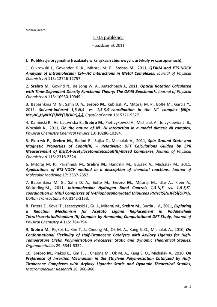 6. Mitoraj M. P., Parafiniuk M., Srebro M., Handzlik M., Buczek A., Michalak M., 2011,