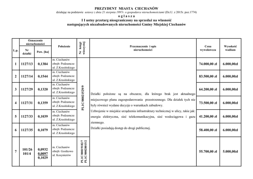 PREZYDENT MIASTA CIECHANÓW działając na podstawie ustawy z dnia 21 sierpnia 1997r. o gospodarce nieruchomościami (Dz.U. z 2015r. poz.1774) Nr działki Pow. [ha] 1 1127/13 0,1384 2 1127/14 0,1544 3 1127/29 0,1320 4 5 1127/31 1127/33 Położenie m. Ciechanów obręb: Podzamcze ul. Z.Krasińskiego m. Ciechanów obręb: Podzamcze ul. Z.Krasińskiego m. Ciechanów obręb: Podzamcze ul. Z.Krasińskiego 0,1359 m. Ciechanów obręb: Podzamcze ul. Z.Krasińskiego 0,1039 m. Ciechanów obręb: Podzamcze ul. Z.Krasińskiego m. Ciechanów obręb: Podzamcze ul. Z.Krasińskiego 6 1127/35 0,1079 7 101/26 101/4 0,0932 0,0097 0,1029 m. Ciechanów obręb: Gostkowo ul. Kosynierów PL1C/00021529/9 L.p. Przeznaczenie i opis nieruchomości Cena wywoławcza Wysokość wadium 74.000,00 zł 6.000,00zł 83.500,00 zł 6.000,00zł 64.200,00 zł 6.000,00zł 73.500,00 zł 6.000,00zł 41.200,00 zł 6.000,00zł 58.400,00 zł 6.000,00zł 55.700,00 zł 5.000,00zł Działki położone są na obszarze, dla którego brak jest aktualnego miejscowego planu zagospodarowania przestrzennego. Dla działek tych nie były również wydane decyzje o warunkach zabudowy. Uzbrojenie w miejskie urządzenia infrastruktury technicznej w ulicy, takie jak: energia elektryczna, sieć telekomunikacyjna, sieć wodociągowa i gazu ziemnego. Działki posiadają dostęp do drogi publicznej. PL1C/00019182/7 PL1C/00028015/2 Oznaczenie nieruchomości Nr księgi wieczystej ogłasza I I ustny przetarg nieograniczony na sprzedaż na własność następujących niezabudowanych nieruchomości Gminy Miejskiej Ciechanów 10 11 12 PL1C/00031309/4 0,0742 0,0621 m. Ciechanów obręb: Gostkowo ul. Komunalna 20/5 0,0692 m. Ciechanów obręb: Gostkowo ul. Komunalna 1646/2 1647 0,0286 0,0450 0,0736 m. Ciechanów obręb: Śmiecin ul. K. Pułaskiego PL1C/00010798/5 9 20/2 582/8 601/3 860/17 861/18 1649 0,0109 0,0004 0,0037 0,0050 0,0492 0,0692 m. Ciechanów obręb: Śmiecin ul. K. Pułaskiego PL1C/00010800/3 8 m. Ciechanów obręb: Gostkowo ul. Komunalna 20/4 Zgodnie z miejscowym planem zagospodarowania przestrzennego „Wiejska” w Ciechanowie przedmiotowa nieruchomość położona jest na terenie oznaczonym symbolem „1 MN – zabudowa mieszkaniowa jednorodzinna o niskim wskazaniu intensywności”. Uzbrojenie w miejskie urządzenia infrastruktury technicznej w ulicy, takie jak: energia elektryczna i sieć wodociągowa. Działki posiadają dostęp do drogi publicznej. Według miejscowego planu zagospodarowania przestrzennego dzielnicy „PŁOCKA” zatwierdzonego uchwałą nr 71/VI/2003 Rady Miasta Ciechanów z dnia 27.03.2003 r., przedmiotowa nieruchomość położona jest na terenie oznaczonym symbolem „5MNU – zabudowa mieszkaniowa jednorodzinna i usługi wbudowane w budynku mieszkalnym, tylko w parterach budynku.” Nieruchomość znajduje się w zasięgu sieci uzbrojenia zlokalizowanego w ulicy K.Szymanowskiego, takiego jak: sieć energetyczna, telekomunikacyjna, wodociągowa, kanalizacji sanitarnej i deszczowej oraz gazu ziemnego. Nieruchomość posiada dostęp do drogi publicznej. 42.435,00 zł 3.000,00zł 35.547,00 zł 3.000,00zł 39.606,00 zł 3.000,00zł 93.603,00 zł 7.000,00zł 82.902,00 zł 7.000,00zł 14 15 16 17 54/1 54/2 54/4 54/5 54/6 0,1094 83.394,00 zł 6.000,00zł 0,1624 m. Ciechanów obręb: Krubin ul. Ludowa 123.738,00 zł 10.000,00zł 0,2187 m. Ciechanów obręb: Krubin ul. Krucza 0,2324 m. Ciechanów obręb: Krubin ul. Krucza 0,0997 m. Ciechanów obręb: Krubin ul. Krucza 18 54/7 0,0999 m. Ciechanów obręb: Krubin ul. Krucza 19 54/8 0,1239 m. Ciechanów obręb: Krubin ul. Krucza PL1C/00043502/4 13 m. Ciechanów obręb: Krubin ul. Ludowa Wg miejscowego planu zagospodarowania przestrzennego „Krubin II”, zatwierdzonego uchwałą Nr 280/XXIX/08 Rady Miasta Ciechanów z dnia 140.466,00 zł 30.12.2008 r. przedmiotowa nieruchomość położona jest na terenie oznaczonym symbolem „4MN – teren pod zabudowę mieszkaniową jednorodzinną i mieszkaniowo-usługową; usługi na działkach inwestycyjnych z jednorodzinną zabudową mieszkaniową mogą być 149.322,00 zł realizowane w formie: lokali wbudowanych w budynkach mieszkalnych, kubatur zblokowanych z budynkami mieszkalnymi lub obiektów wolnostojących, o powierzchni 100 m2.” Działki nieuzbrojone, ale położone w zasięgu technicznych możliwości uzbrojenia w energię elektryczną, sieć wodociągową, kanalizację sanitarną i sieć gazu ziemnego. Działki mają dostęp do drogi publicznej. 10.000,00zł 10.000,00zł 60.885,00 zł 6.000,00zł 63.837,00 zł 6.000,00zł 79.581,00 zł 6.000,00zł 21 22 23 24 25 54/10 54/11 54/12 54/13 54/14 54/15 0,1031 0,1023 m. Ciechanów obręb: Krubin ul. Krucza 0,1314 m. Ciechanów obręb: Krubin ul. Krucza 0,1032 m. Ciechanów obręb: Krubin ul. Krucza 0,1025 m. Ciechanów obręb: Krubin ul. Krucza 0,1375 m. Ciechanów obręb: Krubin ul. Krucza PL1C/00043502/4 20 m. Ciechanów obręb: Krubin ul. Krucza Wg miejscowego planu zagospodarowania przestrzennego „Krubin II”, zatwierdzonego uchwałą Nr 280/XXIX/08 Rady Miasta Ciechanów z dnia 30.12.2008 r. przedmiotowa nieruchomość położona jest na terenie oznaczonym symbolem „5MN – teren pod zabudowę mieszkaniową jednorodzinną; przeznaczenie uzupełniające – obiekty usług ogólnospołecznych i konsumpcyjnych z zastrzeżeniem, że usługi na działkach inwestycyjnych z jednorodzinną zabudową mieszkaniową realizowane mogą być w formie lokali wbudowanych w budynkach mieszkalnych, kubatur zblokowanych z budynkami mieszkalnymi lub obiektów wolnostojących, o powierzchni użytkowej nie przekraczającej 100 m2.” Działki nieuzbrojone, ale położone w zasięgu technicznych możliwości uzbrojenia w energie elektryczną, sieć wodociągową, kanalizację sanitarną i sieć gazu ziemnego. Działki mają dostęp do drogi publicznej. 62.976,00 zł 6.000,00zł 65.436,00 zł 6.000,00zł 84.501,00 zł 6.000,00zł 59.655,00 zł 6.000,00zł 61.008,00 zł 6.000,00zł 86.100,00 zł 6.0
