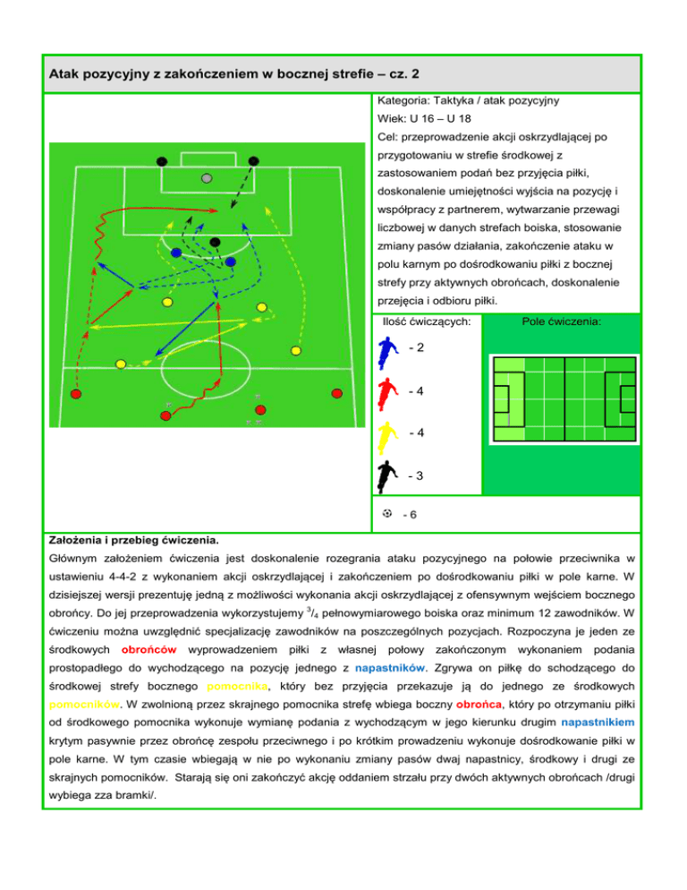 Atak pozycyjny z zakończeniem w bocznej strefie – cz. 2 Kategoria: Taktyka / atak pozycyjny Wiek: U 16 – U 18 Cel: przeprowadzenie akcji oskrzydlającej po przygotowaniu w strefie środkowej z zastosowaniem podań bez przyjęcia piłki, doskonalenie umiejętności wyjścia na pozycję i współpracy z partnerem, wytwarzanie przewagi liczbowej w danych strefach boiska, stosowanie zmiany pasów działania, zakończenie ataku w polu karnym po dośrodkowaniu piłki z bocznej strefy przy aktywnych obrońcach, doskonalenie przejęcia i odbioru piłki. Ilość ćwiczących: Pole ćwiczenia: -2 -4 -4 -3 -6 Założenia i przebieg ćwiczenia. Głównym założeniem ćwiczenia jest doskonalenie rozegrania ataku pozycyjnego na połowie przeciwnika w ustawieniu 4-4-2 z wykonaniem akcji oskrzydlającej i zakończeniem po dośrodkowaniu piłki w pole karne. W dzisiejszej wersji prezentuję jedną z możliwości wykonania akcji oskrzydlającej z ofensywnym wejściem bocznego 3 obrońcy. Do jej przeprowadzenia wykorzystujemy /4 pełnowymiarowego boiska oraz minimum 12 zawodników. W ćwiczeniu można uwzględnić specjalizację zawodników na poszczególnych pozycjach. Rozpoczyna je jeden ze środkowych obrońców wyprowadzeniem piłki z własnej połowy zakończonym wykonaniem podania prostopadłego do wychodzącego na pozycję jednego z napastników. Zgrywa on piłkę do schodzącego do środkowej strefy bocznego pomocnika, który bez przyjęcia przekazuje ją do jednego ze środkowych pomocników. W zwolnioną przez skrajnego pomocnika strefę wbiega boczny obrońca, który po otrzymaniu piłki od środkowego pomocnika wykonuje wymianę podania z wychodzącym w jego kierunku drugim napastnikiem krytym pasywnie przez obrońcę zespołu przeciwnego i po krótkim prowadzeniu wykonuje dośrodkowanie piłki w pole karne. W tym czasie wbiegają w nie po wykonaniu zmiany pasów dwaj napastnicy, środkowy i drugi ze skrajnych pomocników. Starają się oni zakończyć akcję oddaniem strzału przy dwóch aktywnych obrońcach /drugi wybiega zza bramki/. Wskazówki: - po zakończeniu akcji kolejne powtórzenie wykonywane jest w przeciwnym pasie działania, - w przypadku większej ilości zawodników następuje ich zmiana na poszczególnych pozycjach, - po każdym powtórzeniu następuje zmiana obrońców, - akcję można kończyć oddaniem strzału w różnych ustawieniach w równowadze /tylko napastnicy/, bądź przewadze liczbowej /3 x 2, 4 x 2/, - akcję w strefie środkowej przygotowujemy z zastosowaniem podań bez przyjęcia, - podczas jej przygotowywania wysunięty obrońca działa pasywnie /daje rozegrać akcję/, - drugi obrońca wybiega zza bramki i przejmuje krycie podczas prowadzenia piłki przez bocznego obrońcę, - każde podanie musi być poprzedzone wyjściem na pozycję /także zmianą pasów działania/, - do podania prostopadłego wychodzi napastnik nie kryty przez obrońcę, - dwaj obrońcy działając w polu karnym wykonują krycie strefowe, - zwracamy uwagę na zachowanie tempa rozegrania akcji. www.footballtrening.pl
