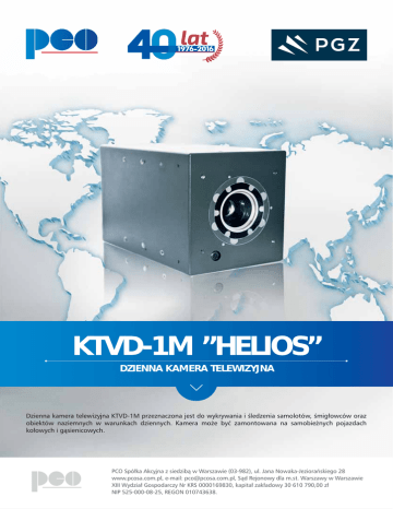 KTVD-1M ”HELIOS” DZIENNA KAMERA TELEWIZYJNA Dzienna kamera telewizyjna KTVD-1M przeznaczona jest do wykrywania i śledzenia samolotów, śmigłowców oraz obiektów naziemnych w warunkach dziennych. Kamera może być zamontowana na samobieżnych pojazdach kołowych i gąsienicowych. PCO Spółka Akcyjna z siedzibą w Warszawie (03-982), ul. Jana Nowaka-Jeziorańskiego 28 www.pcosa.com.pl, e-mail: [email protected], Sąd Rejonowy dla m.st. Warszawy w Warszawie XIII Wydział Gospodarczy Nr KRS 0000169830, kapitał zakładowy 30 610 790,00 zł NIP 525-000-08-25, REGON 010743638. KTVD-1M ”HELIOS” Dane Techniczne Kamera telewizyjna KTVD -1M przewidziana jest do zastosowania w głowicy śledząco - celowniczej samobieżnego przeciwlotniczego zestawu rakietowego bardzo krótkiego zasięgu POPRAD. Detektor 1/3” Pole widzenia 2.0° x 1.5° wąskie 7.5° x 5.5° szerokie Wyjściowy sygnał video Standard CCIR PAL Wymiary 225/120/130 mm Zakres temperatur pracy -35°C ÷ + 50°C Zasilanie 18÷32 V Waga 3,5 kg
