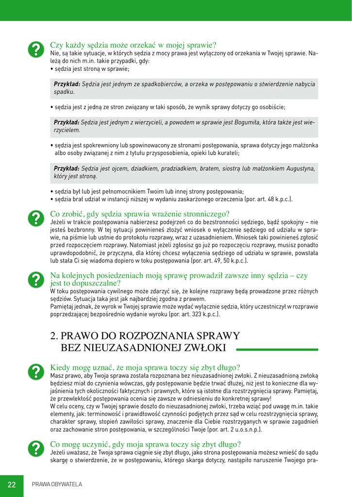 Czy każdy sędzia może orzekać w mojej sprawie? Nie, są takie sytuacje, w których sędzia z mocy prawa jest wyłączony od orzekania w Twojej sprawie. Należą do nich m.in. takie przypadki, gdy: • s ędzia jest stroną w sprawie; Przykład: Sędzia jest jednym ze spadkobierców, a orzeka w postępowaniu o stwierdzenie nabycia spadku. • s ędzia jest z jedną ze stron związany w taki sposób, że wynik sprawy dotyczy go osobiście; Przykład: Sędzia jest jednym z wierzycieli, a powodem w sprawie jest Bogumiła, która także jest wierzycielem. • s ędzia jest spokrewniony lub spowinowacony ze stronami postępowania, sprawa dotyczy jego małżonka albo osoby związanej z nim z tytułu przysposobienia, opieki lub kurateli; Przykład: Sędzia jest ojcem, dziadkiem, pradziadkiem, bratem, siostrą lub małżonkiem Augustyna, który jest stroną. • s ędzia był lub jest pełnomocnikiem Twoim lub innej strony postępowania; • s ędzia brał udział w instancji niższej w wydaniu zaskarżonego orzeczenia (por. art. 48 k.p.c.). Co zrobić, gdy sędzia sprawia wrażenie stronniczego? Jeżeli w trakcie postępowania nabierzesz podejrzeń co do bezstronności sędziego, bądź spokojny – nie jesteś bezbronny. W tej sytuacji powinieneś złożyć wniosek o wyłączenie sędziego od udziału w sprawie, na piśmie lub ustnie do protokołu rozprawy, wraz z uzasadnieniem. Wniosek taki powinieneś zgłosić przed rozpoczęciem rozprawy. Natomiast jeżeli zgłosisz go już po rozpoczęciu rozprawy, musisz ponadto uprawdopodobnić, że przyczyna, dla której chcesz wyłączenia sędziego od udziału w sprawie, powstała lub stała Ci się wiadoma dopiero w toku postępowania (por. art. 49, 50 k.p.c.). Na kolejnych posiedzeniach moją sprawę prowadził zawsze inny sędzia – czy jest to dopuszczalne? W toku postępowania cywilnego może zdarzyć się, że kolejne rozprawy będą prowadzone przez różnych sędziów. Sytuacja taka jest jak najbardziej zgodna z prawem. Pamiętaj jednak, że wyrok w Twojej sprawie może wydać wyłącznie sędzia, który uczestniczył w rozprawie poprzedzającej bezpośrednio wydanie wyroku (por. art. 323 k.p.c.). 2. PRAWO DO ROZPOZNANIA SPRAWY BEZ NIEUZASADNIONEJ ZWŁOKI Kiedy mogę uznać, że moja sprawa toczy się zbyt długo? Masz prawo, aby Twoja sprawa została rozpoznana bez nieuzasadnionej zwłoki. Z nieuzasadnioną zwłoką będziesz miał do czynienia wówczas, gdy postępowanie będzie trwać dłużej, niż jest to konieczne dla wyjaśnienia tych okoliczności faktycznych i prawnych, które są istotne dla rozstrzygnięcia sprawy. Pamiętaj, że przewlekłość postępowania ocenia się zawsze w odniesieniu do konkretnej sprawy! W celu oceny, czy w Twojej sprawie doszło do nieuzasadnionej zwłoki, trzeba wziąć pod uwagę m.in. takie elementy, jak: terminowość i prawidłowość czynności podjętych przez sąd w celu rozstrzygnięcia sprawy, charakter sprawy, stopień zawiłości sprawy, znaczenie dla Ciebie rozstrzyganych w sprawie zagadnień oraz zachowanie stron postępowania, w szczególności Twoje (por. art. 2 u.o.s.n.p.). Co mogę uczynić, gdy moja sprawa toczy się zbyt długo? Jeżeli uważasz, że Twoja sprawa ciągnie się zbyt długo, jako strona postępowania możesz wnieść do sądu skargę o stwierdzenie, że w postępowaniu, którego skarga dotyczy, nastąpiło naruszenie Twojego pra- 22 PRAWA OBYWATELA wa do rozpoznania sprawy bez nieuzasadnionej zwłoki, zwaną skargą o stwierdzenie przewlekłości postępowania. Skargę taką możesz złożyć jedynie w toku postępowania w sprawie, do sądu, przed którym toczy się postępowanie (por. art. 5 u.o.s.n.p.). Sąd, uznając Twoją skargę za zasadną, stwierdzi, że w postępowaniu nastąpiła jego przewlekłość, ponadto może zlecić sądowi rozpoznającemu Twoją sprawę podjęcie określonych czynności w wyznaczonym terminie, a na Twoje żądanie przyzna Ci odpowiednią sumę pieniężną (por. art. 12 u.o.s.n.p.). Jak powinna wyglądać skarga o stwierdzenie przewlekłości postępowania? Skarga o stwierdzenie przewlekłości postępowania powinna zawierać: • tytuł pisma (skarga o stwierdzenie przewlekłości postępowania); • Twoje dane (imię, nazwisko, miejsce zamieszkania); • oznaczenie sądu, do którego pismo wnosisz; • żądanie stwierdzenia przewlekłości postępowania w sprawie, której skarga dotyczy; • przytoczenie okoliczności uzasadniających żądanie; • e wentualnie – żądanie wydania sądowi rozpoznającemu sprawę zalecenia podjęcia w wyznaczonym terminie odpowiednich czynności; • e wentualnie – żądanie zasądzenia odpowiedniej sumy pieniężnej na wypadek uwzględnienia skargi, od 2000 do 20 000 zł; • Twój podpis, ewentualnie podpis Twojego pełnomocnika; • załączniki. Skargę musisz opłacić opłatą stałą w wysokości 100 zł. Opłata ta zostanie Ci zwrócona w przypadku uwzględnienia lub odrzucenia skargi (por. art. 17 u.o.s.n.p.). Czy skargę o stwierdzenie przewlekłości postępowania mogę składać kilka razy? Masz możliwość złożenia nowej skargi w tej samej sprawie, jednak nie wcześniej niż po upływie 12 miesięcy od daty wydania przez sąd orzeczenia, w którym uwzględnił lub oddalił Twoją skargę (por. art. 14 u.o.s.n.p.). Co mogę zrobić, jeśli w toku postępowania nie złożyłem skargi o stwierdzenie jego przewlekłości? Jeżeli w toku postępowania nie złożyłeś skargi o stwierdzenie jego przewlekłości, a z tego tytułu została Ci wyrządzona szkoda, po prawomocnym zakończeniu postępowania w Twojej sprawie masz prawo do żądania odszkodowania od Skarbu Państwa. W tym celu powinieneś skierować do sądu powszechnego (wydział cywilny) odpowiedni pozew (por. art. 16 u.o.s.n.p.). 3. PRAWO DO DWUINSTANCYJNEGO POSTĘPOWANIA Jakie orzeczenia w mojej sprawie może wydać sąd cywilny? Sąd w trakcie postępowania wydaje szereg orzeczeń: wyroki (w tym wyroki zaoczne), postan