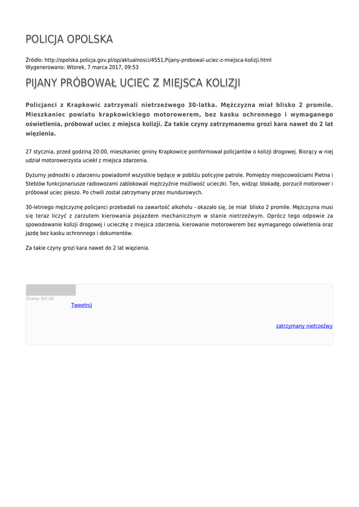 POLICJA OPOLSKA Źródło: http://opolska.policja.gov.pl/op/aktualnosci/4551,Pijany-probowal-uciec-z-miejsca-kolizji.html Wygenerowano: Wtorek, 7 marca 2017, 09:53 PIJANY PRÓBOWAŁ UCIEC Z MIEJSCA KOLIZJI Policjanci z Krapkowic zatrzymali nietrzeźwego 30-latka. Mężczyzna miał blisko 2 promile. Mieszkaniec powiatu krapkowickiego motorowerem, bez kasku ochronnego i wymaganego oświetlenia, próbował uciec z miejsca kolizji. Za takie czyny zatrzymanemu grozi kara nawet do 2 lat więzienia. 27 stycznia, przed godziną 20:00, mieszkaniec gminy Krapkowice poinformował policjantów o kolizji drogowej. Biorący w niej udział motorowerzysta uciekł z miejsca zdarzenia. Dyżurny jednostki o zdarzeniu powiadomił wszystkie będące w pobliżu policyjne patrole. Pomiędzy miejscowościami Pietna i Steblów funkcjonariusze radiowozami zablokowali mężczyźnie możliwość ucieczki. Ten, widząc blokadę, porzucił motorower i próbował uciec pieszo. Po chwili został zatrzymany przez mundurowych. 30-letniego mężczyznę policjanci przebadali na zawartość alkoholu - okazało się, że miał blisko 2 promile. Mężczyzna musi się teraz liczyć z zarzutem kierowania pojazdem mechanicznym w stanie nietrzeźwym. Oprócz tego odpowie za spowodowanie kolizji drogowej i ucieczkę z miejsca zdarzenia, kierowanie motorowerem bez wymaganego oświetlenia oraz jazdę bez kasku ochronnego i dokumentów. Za takie czyny grozi kara nawet do 2 lat więzienia. Ocena: 0/5 (0) Tweetnij zatrzymany nietrzeźwy