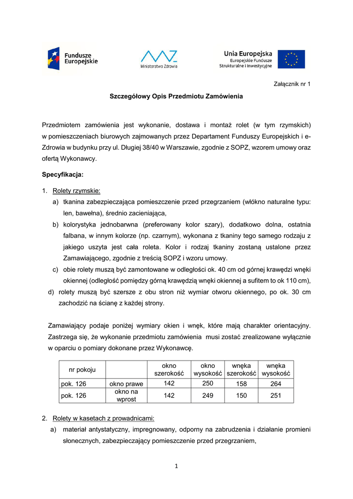 Załącznik nr 1 Szczegółowy Opis Przedmiotu Zamówienia Przedmiotem zamówienia jest wykonanie, dostawa i montaż rolet (w tym rzymskich) w pomieszczeniach biurowych zajmowanych przez Departament Funduszy Europejskich i eZdrowia w budynku przy ul. Długiej 38/40 w Warszawie, zgodnie z SOPZ, wzorem umowy oraz ofertą Wykonawcy. Specyfikacja: 1. Rolety rzymskie: a) tkanina zabezpieczająca pomieszczenie przed przegrzaniem (włókno naturalne typu: len, bawełna), średnio zacieniająca, b) kolorystyka jednobarwna (preferowany kolor szary), dodatkowo dolna, ostatnia falbana, w innym kolorze (np. czarnym), wykonana z tkaniny tego samego rodzaju z jakiego uszyta jest cała roleta. Kolor i rodzaj tkaniny zostaną ustalone przez Zamawiającego, zgodnie z treścią SOPZ i wzoru umowy. c) obie rolety muszą być zamontowane w odległości ok. 40 cm od górnej krawędzi wnęki okiennej (odległość pomiędzy górną krawędzią wnęki okiennej a sufitem to ok 110 cm), d) rolety muszą być szersze z obu stron niż wymiar otworu okiennego, po ok. 30 cm zachodzić na ścianę z każdej strony. Zamawiający podaje poniżej wymiary okien i wnęk, które mają charakter orientacyjny. Zastrzega się, że wykonanie przedmiotu zamówienia musi zostać zrealizowane wyłącznie w oparciu o pomiary dokonane przez Wykonawcę. okno szerokość nr pokoju pok. 126 pok. 126 okno prawe okno na wprost okno wnęka wnęka wysokość szerokość wysokość 142 250 158 264 142 249 150 251 2. Rolety w kasetach z prowadnicami: a) materiał antystatyczny, impregnowany, odporny na zabrudzenia i działanie promieni słonecznych, zabezpieczający pomieszczenie przed przegrzaniem, 1 b) kolorystyka jednobarwna, kolor i rodzaj tkaniny zostaną ustalone przez Zamawiającego, zgodnie z treścią SOPZ i wzoru umowy. c) rolety muszą być zamontowane do ściany, d) kasety i prowadnice muszą być metalowe i w kolorze białym. Zamawiający podaje poniżej wymiary okien i wnęk, które mają charakter orientacyjny. Zastrzega się, że wykonanie przedmiotu zamówienia musi zostać zrealizowane wyłącznie w oparciu o pomiary dokonane przez Wykonawcę. okno szerokość nr pokoju okno wnęka wnęka wysokość szerokość wysokość pok. 128 pok. 127 B pok. 127 C pok. 125 pok. 124 okno okno okno okno okno 141 140 142 141 142 250 250 250 250 250 151 150 151 150 150 251 251 252 250 250 pok. 126 (przejściowy) okno 141 250 150 250 Harmonogram realizacji zamówienia 1. W dniu zawarcia umowy Wykonawca przedstawi Zamawiającemu próbki minimum 5 propozycji kolorów i minimum 3 propozycje tkanin dla każdego rodzaju rolety, z których wykonane będą rolety. Wykonawca w ofercie przedstawi wykaz kolorów (wg palety RGB) i rodzajów tkanin (z podaniem składu surowcowego), które proponuje do realizacji zamówienia. 2. W terminie do 5 dni roboczych od dnia zawarcia umowy, Zamawiający dokona ostatecznego wyboru kolorów i rodzajów tkanin, z których będą zrobione poszczególne rolety, spośród próbek przedstawionych przez Wykonawcę. 3. Wykonawca w terminie do 5 dni roboczych od dnia zawarcia umowy, dokona pomiaru w siedzibie Zamawiającego, który umożliwi przygotowanie rolet zgodnie z treścią SOPZ i wzoru umowy. 4. Po dokonaniu przez Zamawiającego ostatecznego wyboru kolorów i rodzajów tkanin, z których będą zrobione poszczególne rolety, spośród propozycji przedstawionych przez Wykonawcę oraz dokonaniu pomiarów przez Wykonawcę, Wykonawca przedstawi Zamawiającemu do akceptacji wizualizację projektu przedmiotu zamówienia (min. jednej rolety w kasetach z prowadnicami i min. jednej rolety rzymskiej), zawierającą opis sposobu montażu tych rolet i ich wygląd ostateczny po montażu. 2 5. Wykonawca w terminie do 15 dni roboczych od dnia zawarcia umowy wykona, dostarczy i dokona montażu poszczególnych rolet, w budynku przy ul. Długiej 38/40 w Warszawie, w lokalizacji wskazanej w pkt 1 SOPZ. Wymagania dodatkowe, dotyczące współpracy pomiędzy Zamawiającym i Wykonawcą 1. Wykonawca realizuje przedmiot zamówienia wyłącznie na podstawie pomiarów dokonanych przez siebie, zgodnie z treścią SOPZ i wzoru umowy. 2. Montaż rolet i dokonanie pomiarów przez Wykonawcę będzie odbywać się w dni robocze (tj. od poniedziałku do piątku z wyłączeniem dni wolnych od pracy), w godzinach od 9.00 do 16.00. 3. Wykonawca udzieli gwarancji na przedmiot zamówienia, na warunkach określonych we wzorze umowy, na okres zgodny z treścią oferty Wykonawcy, wynoszący co najmniej 24 miesiące, od dnia podpisania przez Zamawiającego protokołu odbioru przedmiotu umowy. 3