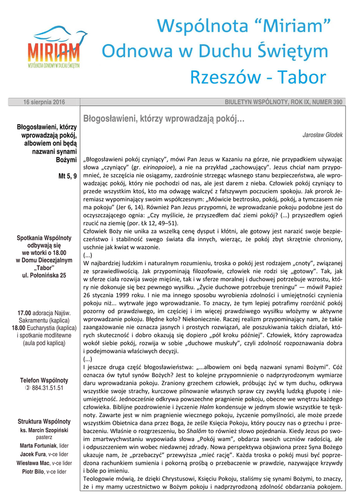 16 sierpnia 2016 BIULETYN WSPÓLNOTY, ROK IX, NUMER 390 Błogosławieni, którzy wprowadzają pokój… Błogosławieni, którzy Jarosław Głodek wprowadzają pokój, albowiem oni będą nazwani synami Bożymi „Błogosławieni pokój czyniący”, mówi Pan Jezus w Kazaniu na górze, nie przypadkiem używając słowa „czyniący” (gr. eirinopoioe), a nie na przykład „zachowujący”. Jezus chciał nam przypomnieć, że szczęścia nie osiągamy, zazdrośnie strzegąc własnego stanu bezpieczeństwa, ale wproMt 5, 9 wadzając pokój, który nie pochodzi od nas, ale jest darem z nieba. Człowiek pokój czyniący to przede wszystkim ktoś, kto ma odwagę walczyć z fałszywym poczuciem spokoju. Jak prorok Jeremiasz wypominający swoim współczesnym: „Mówicie beztrosko, pokój, pokój, a tymczasem nie ma pokoju” (Jer 6, 14). Również Pan Jezus przypomni, że wprowadzanie pokoju podobne jest do oczyszczającego ognia: „Czy myślicie, że przyszedłem dać ziemi pokój? (...) przyszedłem ogień rzucić na ziemię (por. Łk 12, 49–51). Człowiek Boży nie unika za wszelką cenę dysput i kłótni, ale gotowy jest narazić swoje bezpieSpotkania Wspólnoty czeństwo i stabilność swego świata dla innych, wierząc, że pokój zbyt skrzętnie chroniony, odbywają się uschnie jak kwiat w wazonie. we wtorki o 18.00 (...) w Domu Diecezjalnym W najbardziej ludzkim i naturalnym rozumieniu, troska o pokój jest rodzajem „cnoty”, związanej „Tabor” ze sprawiedliwością. Jak przypominają filozofowie, człowiek nie rodzi się „gotowy”. Tak, jak ul. Połonińska 25 w sferze ciała rozwija swoje mięśnie, tak i w sferze moralnej i duchowej potrzebuje wzrostu, który nie dokonuje się bez pewnego wysiłku. „Życie duchowe potrzebuje treningu” — mówił Papież 26 stycznia 1999 roku. I nie ma innego sposobu wyrobienia zdolności i umiejętności czynienia pokoju niż... wytrwałe jego wprowadzanie. To znaczy, że tym lepiej potrafimy rozróżnić pokój pozorny od prawdziwego, im częściej i im więcej prawdziwego wysiłku włożymy w aktywne 17.00 adoracja Najśw. wprowadzanie pokoju. Błędne koło? Niekoniecznie. Raczej realizm przypominający nam, że takie Sakramentu (kaplica) 18.00 Eucharystia (kaplica) zaangażowanie nie oznacza jasnych i prostych rozwiązań, ale poszukiwania takich działań, których skuteczność i dobro okazują się dopiero „pół kroku później”. Człowiek, który zaprowadza i spotkanie modlitewne (aula pod kaplicą) wokół siebie pokój, rozwija w sobie „duchowe muskuły”, czyli zdolność rozpoznawania dobra i podejmowania właściwych decyzji. (...) I jeszcze druga część błogosławieństwa: „...albowiem oni będą nazwani synami Bożymi”. Cóż oznacza ów tytuł synów Bożych? Jest to kolejne przypomnienie o nadprzyrodzonym wymiarze Telefon Wspólnoty daru wprowadzania pokoju. Zraniony grzechem człowiek, próbując żyć w tym duchu, odkrywa 884.31.51.51 wszystkie swoje strachy, kurczowe pilnowanie własnych spraw czy zwykłą ludzką głupotę i nieumiejętność. Jednocześnie odkrywa powszechne pragnienie pokoju, obecne we wnętrzu każdego człowieka. Biblijne pozdrowienie i życzenie Halm kondensuje w jednym słowie wszystkie te tęsknoty. Zawarte jest w nim pragnienie wiecznego pokoju, życzenie pomyślności, ale może przede Struktura Wspólnoty wszystkim Obietnica dana przez Boga, że ześle Księcia Pokoju, który pouczy nas o grzechu i przeks. Marcin Szopiński baczeniu. Właśnie o rozgrzeszeniu, bo Shalôm to również słowo pojednania. Kiedy Jezus po swopasterz im zmartwychwstaniu wypowiada słowa „Pokój wam”, obdarza swoich uczniów radością, ale Marta Fortuniak, lider i odpuszczeniem win wobec niedawnej zdrady. Nowa perspektywa objawiona przez Syna Bożego Jacek Fura, v-ce lider ukazuje nam, że „przebaczyć” przewyższa „mieć rację”. Każda troska o pokój musi być poprzedzona rachunkiem sumienia i pokorną prośbą o przebaczenie w prawdzie, nazywające krzywdy Wiesława Mac, v-ce lider i bóle po imieniu. Piotr Bilo, v-ce lider Teologowie mówią, że dzięki Chrystusowi, Księciu Pokoju, staliśmy się synami Bożymi, to znaczy, że i my mamy uczestnictwo w Bożym pokoju i nadprzyrodzoną zdolność obdarzania pokojem. Animatorzy diakonii Alicja Smalarz diakonia adoracyjna Marta Fortuniak diakonia nauczania i prorocka Jolanta Skotnicka diakonia uwielbienia Maciej Mierzejewski diakonia prowadzenia spotkań Piotr Bilo diakonia ewangelizacyjna Jacek Fura diakonia modlitwy wstawienniczej i uwolnienia Maria Bassara diakonia modlitwy osłonowej Paweł Kobosz diakonia modlitwy w nagłych potrzebach Maria Hubert diakonia modlitwy za kapłanów Marek Wiśniewski diakonia liturgiczna Ewa Kruczek diakonia miłosierdzia Klaudia Winiarska diakonia medialna Wiesława Mac diakonia organizacyjna Paweł Wiśniowski diakonia technicznoporządkowa Modlitwy wstawiennicze odbywają się we wtorki o 17.15 – zgłoszenia przez stronę www.miriam.rzeszow.pl Modlitwy uwolnienia Jakbyśmy przez chrzest otrzymali specjalne okulary, które pozwalają nam widzieć świat z Bożej perspektywy, nie na różowo, ale wyraźniej, ostrzej, z większą zdolnością do rozpoznawania godności drugiego człowieka. Słowo Boże do medytacji − − − − − − − śr. – Mt 20, 1-16a Przypowieść o robotnikach w winnicy czw. – Mt 22, 1-14 Przypowieść o zaproszonych na ucztę pt .– Mt 22, 34-40 Największe przykazanie sob. – Mt 23, 1-12 Kto się wywyższa, będzie poniżony niedz. – Łk 13, 22–30 Królestwo Boże dostępne dla wszystkich narodów pn. – Łk 1, 26-38 Bóg da Jezusowi tron Dawida wt. – Mt 23, 23-26 Biada obłudnikom Intencje do modlitwy W intencji Ojca Świętego Franciszka o światło Ducha Świętego i siły fizyczne potrzebne do prowadzenia Kościoła, o zdrowie i błogosławieństwo Boże dla Benedykta XVI i ks. bpa Jana Wątroby. W intencji wszystkich kapłanów posługu