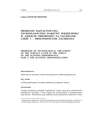 5-2015 TRIBOLOGIA 133 Łukasz WOJCIECHOWSKI * PROBLEMY KSZTAŁTOWANIA TECHNOLOGICZNEJ WARSTWY WIERZCHNIEJ W ASPEKCIE ODPORNOŚCI NA ZACIERANIE. CZĘŚĆ 1 – PROGNOZOWANIE ZACIERANIA PROBLEMS OF TECHNOLOGICAL TREATMENT OF THE SURFACE LAYER IN THE ASPECT OF THE SCUFFING PERFORMANCE. PART I: THE SCUFFING PROGNOSTICATION Słowa kluczowe: odporność na zacieranie, smarowanie graniczne, modele prognostyczne Key words: scuffing performance, boundary lubrication, prognostic models Streszczenie Artykuł przedstawia przegląd współczesnej wiedzy dotyczącej mechanizmów inicjujących zacieranie i ocenę stopnia jej wykorzystania w prognozowaniu tego procesu. Wyróżniono pięć podstawowych parametrów/właściwości, które * Instytut Maszyn Roboczych i Pojazdów Samochodowych, Politechnika Poznańska, ul. Piotrowo 3, 60-965 Poznań, Polska, tel. +48 61 665 23 76, e-mail: [email protected]. 134 TRIBOLOGIA 5-2015 mogą determinować odporność warstwy wierzchniej na ten typ katastroficznego zużywania. Analiza zebranych informacji pozwoliła na stwierdzenie, że w zależności od indywidualnych cech tribosystemu (materiały pary trącej, rodzaj środka smarowego i reżim, w jakim pracuje, środowisko) modele przewidujące początek zacierania mogą bazować na innych przesłankach. Opierając się na takim podejściu do zagadnienia, zaproponowano topologiczną koncepcję kształtowania warstwy wierzchniej o podwyższonej odporności na zacieranie. WPROWADZENIE Zacieranie należy niewątpliwie do najbardziej niebezpiecznych oraz kosztownych form zużywania tribologicznego. Wiąże się to przede wszystkim z jego gwałtownym zapoczątkowaniem i bardzo dynamicznym przebiegiem, który w krótkim czasie prowadzi do awaryjnego unieruchomienia węzła tarcia (zatarcia). Ze względu na swoją złożoność problematyka czynników decydujących o inicjacji tego procesu nie została precyzyjnie wyjaśniona. Ma to także odzwierciedlenie w braku uniwersalnej, jednoznacznej definicji charakteryzującej zacieranie. Szczegółowej analizy literaturowej w tym aspekcie dokonał Nosal [L. 1], który proponuje rozpatrywać zacieranie jako patologiczne następstwo zużywania adhezyjnego, które określa jako oddzielanie cząstek materiału wskutek sczepiania adhezyjnego na elementarnych powierzchniach styku. Należy jednak zaznaczyć, że zużywanie to jest zlokalizowane tylko w obrębie pojedynczych nierówności, ma zatem charakter „powierzchniowy”, zachodzi ze stałą intensywnością i towarzyszy mu stabilne tarcie. Osiągnięcie przez obszar sczepiania pewnego wymiaru krytycznego (powstają tzw. ogniska zacierania) prowadzi do destabilizacji warunków tarcia, jego propagacji w głąb warstwy wierzchniej, a w konsekwencji do dynamicznego rozwoju makroskopowych uszkodzeń w jej obrębie. Biorąc pod uwagę taki mechanizm inicjacyjny, zacieranie można zdefiniować jako uszkadzanie warstwy wierzchniej trących się elementów ze zwiększającą się szybkością spowodowane przeniesieniem tarcia w głąb warstwy wierzchniej wskutek powstawania i niszczenia ognisk zacierania adhezyjnego [L. 1]. W podobny sposób efekty zacierania określa definicja przedstawiona w normie amerykańskiej ASTM G40-13, która charakteryzuje ten proces jako formę zużywania pojawiającą się w niedostatecznie smarowanych systemach tribologicznych, o makroskopowo obserwowalnych zmianach w teksturze, odpowiadających zwykle kierunkowi ruchu elementów węzła tarciowego [L. 2]. Podkreślając aspekt makroskopowości zużywania, warto zwrócić uwagę także na „operacyjną” (a przez to i nieco kolokwialną) definicję zaproponowaną przez Blau’a [L. 3], który fakt inicjacji zacierania wiąże właśnie z możliwością jego wzrokowego potwierdzenia (cyt. ang. „I’ll know it when I see it”). 5-2015 TRIBOLOGIA 135 Dokładna synteza literaturowa została przeprowadzona także w pracy [L. 4] (Markov i Kelly), w której autorzy przedstawiają rys historyczny związany z używaniem pojęcia „zacieranie”. Określane jako wstępny etap do katastroficznego zużywania, zacieranie w myśl dokonanej analizy wiąże się z nagłym przerwaniem filmu olejowego w warunkach ekstremalnych wymuszeń zewnętrznych (głównie obciążenie i/lub prędkość). Kryterium wymuszeń zewnętrznych (iloczyn obciążenia i prędkości), znany pod akronimem „pV” znajduje szerokie zastosowanie praktyczne. Najchętniej wykorzystywany jest w przemyśle łożyskowym, gdzie stosuje się go do określania granic stosowalności różnych konfiguracji par tarcia w aspekcie zarówno materiałowym, jak i warunków kinematycznych i tribologicznych (smarowanie). W pracy [L. 5] znaleźć można zestawienie danych na temat kryterium „pV” dla różnych kombinacji materiałowych i warunków smarowania w przemyśle łożyskowym. Rozpatrując zagadnienie zacierania, warto także zwrócić uwagę na zestawienie pewnych zwrotów, często wykorzystywanych zdaniem autorów pracy [L. 4] przy charakterystyce tego procesu: „zużycie katastroficzne” (ang. catastrophic wear), „zużycie adhezyjne” (ang. adhesive wear), „bezwzględne uszkodzenie” (ang. gross damage), „zespawanie” (ang. solid-phase welding). Semantyka tych zwrotów pozwala na pewne dwa podstawowe spostrzeżenia: prawdopodobnie adhezyjną etiologię procesu zacierania oraz jego spektakularne, zdecydowanie niszczące efekty. Obok bardzo ogólnych definicji można doszukać się również prac, w których próbowano nieco uszczegółowić mechanizm zacierania. Przykładowo Ludema [L. 6] zacieranie określa jako proces niszczenia powierzchni przez płynięcie plastyczne, któremu towarzyszy ubytek lub transfer materiału. Rozpatrując aspekt terminologiczny, należy zwrócić uwagę także na problem samego nazewnictwa procesu zacierania w języku angielskim. Na przestrzeni ostatnich kilkudziesięciu lat w literaturze naukowej pojawiło się przynajmniej pięć terminów, które char