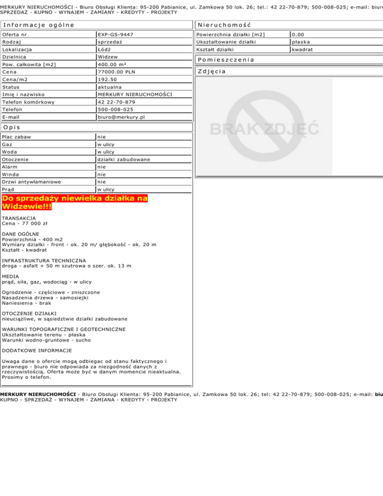 MERKURY NIERUCHOMOŚCI - Biuro Obsługi Klienta: 95-200 Pabianice, ul. Zamkowa 50 lok. 26; tel.: 42 22-70-879; 500-008-025; e-mail: biuro SPRZEDAŻ - KUPNO - WYNAJEM - ZAMIANY - KREDYTY - PROJEKTY Informacje ogólne Nieruchomość Oferta nr EXP-GS-9447 Powierzchnia działki [m2] 0.00 Rodzaj sprzedaż Ukształtowanie działki płaska Lokalizacja Łódź Kształt działki kwadrat Dzielnica Widzew Pow. całkowita [m2] 400.00 m² Cena 77000.00 PLN Cena/m2 192.50 Status aktualna Imię i nazwisko MERKURY NIERUCHOMOŚCI Telefon komórkowy 42 22-70-879 Telefon 500-008-025 E-mail [email protected] Pomieszczenia Zdjęcia Opis Plac zabaw nie Gaz w ulicy Woda w ulicy Otoczenie działki zabudowane Alarm nie Winda nie Drzwi antywłamaniowe nie Prąd w ulicy Do sprzedaży niewielka działka na Widzewie!!! TRANSAKCJA Cena - 77 000 zł DANE OGÓLNE Powierzchnia - 400 m2 Wymiary działki - front - ok. 20 m/ głębokość - ok. 20 m Kształt - kwadrat INFRASTRUKTURA TECHNICZNA droga - asfalt + 50 m szutrowa o szer. ok. 13 m MEDIA prąd, siła, gaz, wodociąg - w ulicy Ogrodzenie - częściowe - zniszczone Nasadzenia drzewa - samosiejki Naniesienia - brak OTOCZENIE DZIAŁKI nieuciążliwe, w sąsiedztwie działki zabudowane WARUNKI TOPOGRAFICZNE I GEOTECHNICZNE Ukształtowanie terenu - płaska Warunki wodno-gruntowe - sucho DODATKOWE INFORMACJE Uwaga dane o ofercie mogą odbiegac od stanu faktycznego i prawnego - biuro nie odpowiada za niezgodność danych z rzeczywistością. Oferta może być w danym momencie nieaktualna. Prosimy o telefon. MERKURY NIERUCHOMOŚCI - Biuro Obsługi Klienta: 95-200 Pabianice, ul. Zamkowa 50 lok. 26; tel: 42 22-70-879; 500-008-025; e-mail: biu KUPNO - SPRZEDAŻ - WYNAJEM - ZAMIANA - KREDYTY - PROJEKTY