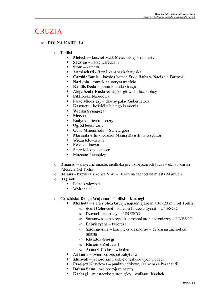 Wybrane interesujące miejsca w Gruzji Opracowali: Joanna Zapęcka i Cyprian Pawlaczyk GRUZJA • DOLNA KARTLIA o Tbilisi Metechi – kościół M.B. Metechskiej + monastyr Saczino – Pałac DaredŜani Sioni – katedra Anczischati - Bazylika Anczischatyjska Carskie Banie – łaźnie (Roman Style Baths w Nacikola Fortress) Narikala – zamek na starym mieście Kartlis Deda – pomnik matki Gruzji Aleja Szoty Rustaweliego – główna ulica stolicy Biblioteka Narodowa Pałac MłodzieŜy – dawny pałac Gubernatora Kaszueti – kościół z białego kamienia Wielka Synagoga Meczet Budynki – teatru, opery Ogród botaniczny Góra Mtacminda - Święta góra Mamadawitis - Kościół Mama Dawiti na wzgórzu WieŜa telewizyjna Kolejka linowa Stare Miasto – spacer Muzeum Pieniędzy. o Dmanisi – antyczne miasto, siedliska prehistorycznych ludzi – ok. 90 km na Pd-Zach. Od Tbilis o Bolnisi – bazylika z końca V w. – 10 km na zachód od miasta Marnueli o Bagineti Pałac królewski Wykopaliska o Gruzińska Droga Wojenna – Tbilisi – Kazbegi Mccheta – stara stolica Gruzji, najładniejsze miasto (20 min od Tbilisi) • Sveti Cchoweci – katedra (drzewo Ŝycia) – UNESCO • DŜwari – monastyr – UNESCO • Samtawro – nekropolia + zespół architektoniczny – UNESCO • Bebriscyche – twierdza • Sziomgwime – kompleks klasztorny – 12 km na zachód od miasta • Klasztor Giorgi • Klasztor Zedazeni • Armazi Ciche - twierdza Ananuri – twierdza, zespół zabytków Zhinvali – jezioro śinwalskie o turkusowych wodach Przełęcz KrzyŜowa – punkt widokowy (za wioską Pasanauri) Dolina Sono – wolnostojące baszty Kazbegi – miasteczko u stop góry - wulkanu Kazbek Strona 1 z 4 Wybrane interesujące miejsca w Gruzji Opracowali: Joanna Zapęcka i Cyprian Pawlaczyk • Stepantsmida – zamek, klasztor, dzwonnica Gergeti – wioska u stóp góry Tziminala 2170 m.n.p.m. + kościół na szczycie + lodowiec Gergeti Cminda Sameba – kościół Świętej Trójcy – 2 km na zachód od miasta Kazbegi Wąwóz Darialski – u wejścia do wąwozu stoją ruiny gruzińskiego zamku KARTLIA WEWNĘTRZNA o Uplisciche – największe miasto skalne w Gruzji (gruzińska Petra) o Gori GoridŜwari – kościół Twierdza Muzeum Stalina o Borjomi (BordŜomi) Zielony klasztor Romanov palace – w sąsiedztwie Likani Źródła wody mineralnej • IMERETIA o Sataplia Rezerwat Sataplijski – odciski dinozaurów Jaskinia + wulkan o Kutaisi Bagrati – katedra – UNESCO Gelati – monastyr – UNESCO – 11 km na Pł.-Wsch. Od Kutaisi Bazary Jaskinie w wapiennych skałach • KACHETIA o \ o Dawid GaredŜa – kompleks klasztorny, skalne miasto o Sihnahi – stare miasto, mury obronne – drugi co do wielkości mur po chińskim o Bodbe – monastyr o Malownicza droga między Tbilisi a Telawi o Telawi Dzweligdawani – zamek – twierdza Batoniscyche – pałac – rezydencja królewska Okolice: • Alawerdi – monastyr i katedra, pałac Chanów - 18 km na Pół.Zach. Od Telawi • Cinandali – pałac i ogrody • Ikalto – monastyr – 4 km na Pół.-Wsch. Od Telawi • Szuamta – klasztor – 7 km na Pd.-Zach. Od Telawi Strona 2 z 4 Wybrane interesujące miejsca w Gruzji Opracowali: Joanna Zapęcka i Cyprian Pawlaczyk o Gremi – ruiny dawnej stolicy, Mtawar Angelozi – cerkiew Tarsa Galawani – cerkiew cytadela o UdŜarma – twierdza o Kwareli – klasztor o Kwetera – Pałac, kościół, mury obronne – okolice miasta Achmeta o P.N. Lagodechii • ADśARIA o Batumi Ogród botaniczny Akwarium Muzeum Stalina Kościół NMP Plantacje herbaty i cytrusów poprzeplatane ze staroŜytnymi ruinami Synagoga o Gonio – twierdza o Sarpi – plaŜe o Dandalo – 1000 letni most o Machuntesi – 1000 letni most • CHEWSURETIA i TUSZETIA o o o o o o o • Chachabo – wioska złoŜona z baszt mieszkalnych Muco –warowne budowle Szatili – wieś twierdza Darto – wioska z mieszkalnymi basztami Omalo – baszty obronno-mieszkalne Chachmaty Udani SWANETIA o Uszguli – najwyŜej połoŜona osada (UNESCO) o Mestia – średniowieczne baszty mieszkalne (UNESCO) – powyŜej Mestia moŜna zobaczyć wszystkie najwyŜsze szczyty w Gruzji • RACZA o Nikorcmida – katedra – okolice miasta Ambrolauri o Oni – synagoga Strona 3 z 4 Wybrane interesujące miejsca w Gruzji Opracowali: Joanna Zapęcka i Cyprian Pawlaczyk • SAMCCHE - DZAWACHETIA o o o o o o o o o o • Achalciche – twierdza Chertwisi – 30 km na Pd.-Wsch. Od miasta Zarzma – monastyr + dzwonnica (czaszki mnichów w krypcie) Sapara – cerkiew, monastyr, wieŜa zegarowa Wardzia – miasto – klasztor wydrąŜone w skale, ciekawy system wodny Kumurdo – ruiny wielkiego monastyru P.N. BorŜomi – Karagawli – góry, trasy wycieczkowe, ptactwo Timotesubani – monastyr Ackuri – ruiny twierdzy Wanis Kwawebi – klasztor w zboczu kanionu Tmogwi – malownicze ruiny twierdzy – 2 km na Pół. Od Wardzie INNE o Nokalakewi – ruiny staroŜytnego miasta, okolice miasta Senaki o śebota – dwa kościółki – 2 km na Pół.-Wsch. Od miasta Tianeti Opracowali: Joanna Zapęcka Cyprian Pawlaczyk Strona 4 z 4