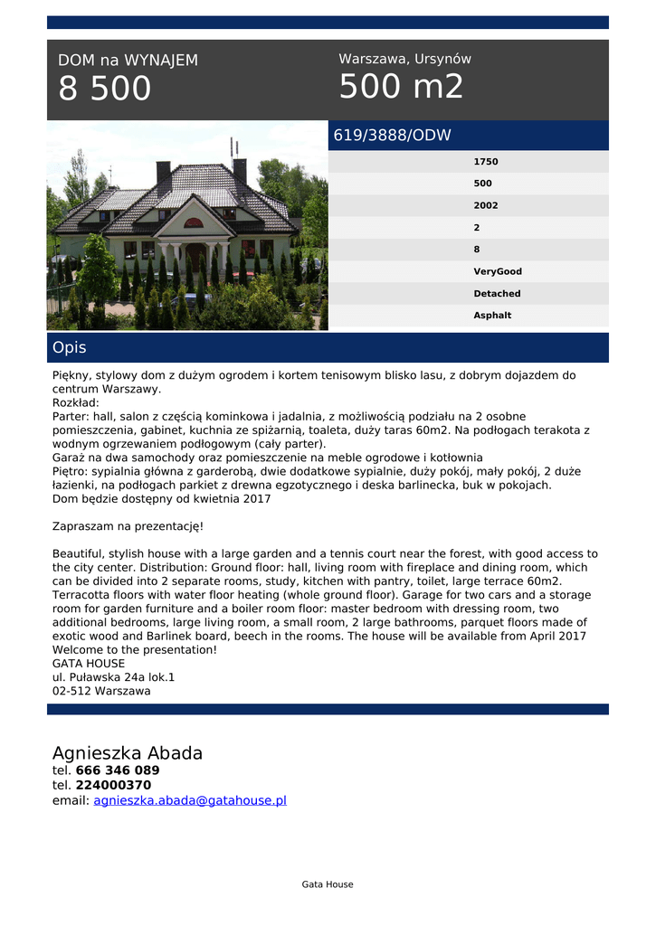 DOM na WYNAJEM 8 500 Warszawa, Ursynów 500 m2 619/3888/ODW 1750 500 2002 2 8 VeryGood Detached Asphalt Opis Piękny, stylowy dom z dużym ogrodem i kortem tenisowym blisko lasu, z dobrym dojazdem do centrum Warszawy. Rozkład: Parter: hall, salon z częścią kominkowa i jadalnia, z możliwością podziału na 2 osobne pomieszczenia, gabinet, kuchnia ze spiżarnią, toaleta, duży taras 60m2. Na podłogach terakota z wodnym ogrzewaniem podłogowym (cały parter). Garaż na dwa samochody oraz pomieszczenie na meble ogrodowe i kotłownia Piętro: sypialnia główna z garderobą, dwie dodatkowe sypialnie, duży pokój, mały pokój, 2 duże łazienki, na podłogach parkiet z drewna egzotycznego i deska barlinecka, buk w pokojach. Dom będzie dostępny od kwietnia 2017 Zapraszam na prezentację! Beautiful, stylish house with a large garden and a tennis court near the forest, with good access to the city center. Distribution: Ground floor: hall, living room with fireplace and dining room, which can be divided into 2 separate rooms, study, kitchen with pantry, toilet, large terrace 60m2. Terracotta floors with water floor heating (whole ground floor). Garage for two cars and a storage room for garden furniture and a boiler room floor: master bedroom with dressing room, two additional bedrooms, large living room, a small room, 2 large bathrooms, parquet floors made of exotic wood and Barlinek board, beech in the rooms. The house will be available from April 2017 Welcome to the presentation! GATA HOUSE ul. Puławska 24a lok.1 02-512 Warszawa Agnieszka Abada tel. 666 346 089 tel. 224000370 email: [email protected] Gata House Powered by TCPDF (www.tcpdf.org)