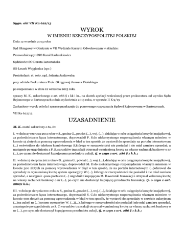 Sygn. akt VII Ka 622/13 WYROK W IMIENIU RZECZYPOSPOLITEJ POLSKIEJ Dnia 12 września 2013 roku Sąd Okręgowy w Olsztynie w VII Wydziale Karnym Odwoławczym w składzie: Przewodniczący: SSO Karol Radaszkiewicz Sędziowie: SO Dorota Lutostańska SO Leszek Wojgienica (spr.) Protokolant: st. sekr. sąd. Jolanta Jankowska przy udziale Prokuratora Prok. Okręgowej Janusza Płońskiego po rozpoznaniu w dniu 12 września 2013 roku sprawy M. K., oskarżonego z art. 286 § 1 kk i in., na skutek apelacji wniesionej przez prokuratora od wyroku Sądu Rejonowego w Bartoszycach z dnia 23 kwietnia 2013 roku, w sprawie II K 9/13 Zaskarżony wyrok uchyla i sprawę przekazuje do ponownego rozpoznania Sądowi Rejonowemu w Bartoszycach. VII Ka 622/13 UZASADNIENIE M. K. został oskarżony o to, że: I. w dniu 27 czerwca 2011 roku w S., gmina G., powiat (...), woj. (...), działając w celu osiągnięcia korzyści majątkowej, za pośrednictwem łącza internetowego, doprowadził P. S.do niekorzystnego rozporządzenia własnym mieniem w kwocie 15 złotych za pomocą wprowadzenia w błąd w ten sposób, że wystawił do sprzedaży na portalu internetowym (...) wyświetlacz do telefonu komórkowego S.którego w rzeczywistości nie posiadał i nie miał zamiaru sprzedać, a następnie po uzgodnieniu z P. S.warunków transakcji otrzymał wymienioną kwotę na własny rachunek bankowy o nr (...), po czym nie dostarczył kupującemu przedmiotu aukcji, tj. o czyn z art. 286 § 1 k.k.; II. w dniu 19 sierpnia 2011 roku w S., gmina G., powiat (...), woj. (...), działając w celu osiągnięcia korzyści majątkowej, za pośrednictwem łącza internetowego, doprowadził M. D.do niekorzystnego rozporządzenia własnym mieniem w kwocie 300 złotych za pomocą wprowadzenia w błąd w ten sposób, że na portalu internetowym (...)oferował do sprzedaży za wymienioną kwotę system operacyjny W.(...), którego w rzeczywistości nie posiadał i nie miał zamiaru sprzedać, a następnie -poza portalem (...) uzgodnił z kupującym M. D.warunki transakcji i otrzymał wskazaną kwotę na własny rachunek bankowy o nr (...), po czym nie dostarczył kupującej przedmiotu transakcji, tj. o czyn z art. 286§1 k.k.; III. w dniu 31 sierpnia 2011 roku w S., gmina G., powiat (...), woj. (...), działając w celu osiągnięcia korzyści majątkowej, za pośrednictwem łącza internetowego, doprowadził S. C.do niekorzystnego rozporządzania własnym mieniem w kwocie 300 złotych za pomocą wprowadzenia w błąd w ten sposób, że wystawił do sprzedaży w serwisie aukcyjnym (...)na aukcji nr (...)system operacyjny W. (...)(...), którego w rzeczywistości nie posiadał i nie miał zamiaru sprzedać, a następnie po uzgodnieniu ze S. C.warunków transakcji otrzymał wymienioną kwotę na własny rachunek bankowy o nr (...), po czym nie dostarczył kupującemu przedmiotu aukcji, tj. o czyn z art. 286 § 1 k.k.; IV. w dniu 22 października 2011 roku w S., gmina G., powiat (...), woj. (...), w celu osiągnięcia korzyści majątkowej, za pośrednictwem łącza internetowego, usiłował doprowadzić K. W. (1)do niekorzystnego rozporządzenia własnym mieniem w kwocie 400 złotych, za pomocą wprowadzenia w błąd w ten sposób, że używając specjalistycznego oprogramowania na portalu aukcyjnym (...)przejął konto należące do R. K., po czym podsz5avając się za wymienionego utworzył aukcję o nr (...)na której oferował do sprzedania system operacyjny W. (...)(...)(...), którego w rzeczywistości nie posiadał i nie miał zamiaru sprzedać, który wylicytował K. W. (1), lecz zamierzonego skutku nie osiągnął z uwagi na to, że pokrzywdzony zorientował się do oszukańczego zamiaru i w konsekwencji nie zapłacił pieniędzy za wylicytowany towar, tj. o czyn z art. 13§1 k.k. w zw. z art. 286§1 k.k.; V. w dniu 23 października 2011 roku w S., gmina G., powiat (...), woj. (...), działając w celu osiągnięcia korzyści majątkowej, za pośrednictwem łącza internetowego, doprowadził B. P.do niekorzystnego rozporządzenia własnym mieniem w kwocie 400 złotych za pomocą wprowadzenia w błąd w ten sposób, że używając specjalistycznego oprogramowania na portalu aukcyjnym (...) przejął konto należące do R. K., po czym podszywając się za wymienionego utworzył aukcję o nr (...)na której oferował do sprzedania system operacyjny W. (...)(...)(...), którego w rzeczywistości nie posiadał i nie miał zamiaru sprzedać, a system ten został zakupiony przez B. P.za kwotę 400 zł., który wskazaną kwotę przelał na jego rachunek bankowy, tj. o czyn z art. 286§1 k.k.; VI. w dniu 07 listopada 2011 roku w S., gmina G., powiat (...), woj. (...), działając w celu osiągnięcia korzyści majątkowej, za pośrednictwem łącza internetowego, doprowadził A. K.do niekorzystnego rozporządzenia własnym mieniem w kwocie 800 złotych za pomocą wprowadzenia w błąd w ten sposób, że na portalu internetowym (...)na aukcji o nr (...)oferował do sprzedaży za wymienioną kwotę telefon komórkowy S.(...), którego w rzeczywistości nie posiadał i nie miał zamiaru sprzedać, a następnie -poza portalem (...) uzgodnił z kupującym A. K.warunki transakcji i otrzymał wskazaną kwotę na własny rachunek bankowy o nr (...), po czym nie dostarczył kupującej przedmiotu transakcji, tj. o czyn z art. 286§1 k.k.; VII. w dniu 25 listopada 2011 roku w S., gmina G., powiat (...), woj. (...), działając w celu osiągnięcia korzyści majątkowej, za pośrednictwem łącza internetowego, doprowadził P. M.do niekorzystnego rozporządzenia własnym mieniem w kwocie 970 złotych za pomocą wprowadzenia w błąd w ten sposób, że wystawił do sprzedaży w serwisie aukcyjnym (...) na aukcji nr (...)telefon komórkowy S.którego w rzeczywistości nie posiadał i nie miał zamiaru sprzedać, a następnie po uzgodnieniu z P. M.warunków transakcji otrzymał wymienioną kwotę na własny rachunek bankowy o nr (...), po czym nie dostarczył k
