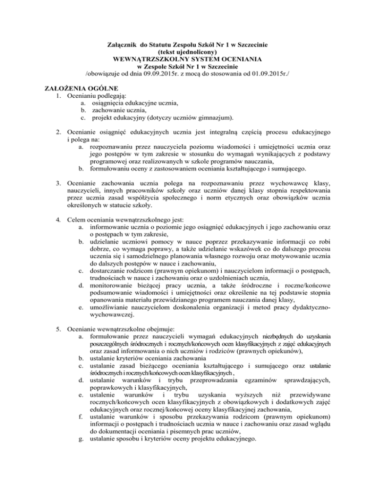 Załącznik do Statutu Zespołu Szkół Nr 1 w Szczecinie (tekst ujednolicony) WEWNĄTRZSZKOLNY SYSTEM OCENIANIA w Zespole Szkół Nr 1 w Szczecinie /obowiązuje od dnia 09.09.2015r. z mocą do stosowania od 01.09.2015r./ ZAŁOŻENIA OGÓLNE 1. Ocenianiu podlegają: a. osiągnięcia edukacyjne ucznia, b. zachowanie ucznia, c. projekt edukacyjny (dotyczy uczniów gimnazjum). 2. Ocenianie osiągnięć edukacyjnych ucznia jest integralną częścią procesu edukacyjnego i polega na: a. rozpoznawaniu przez nauczyciela poziomu wiadomości i umiejętności ucznia oraz jego postępów w tym zakresie w stosunku do wymagań wynikających z podstawy programowej oraz realizowanych w szkole programów nauczania, b. formułowaniu oceny z zastosowaniem oceniania kształtującego i sumującego. 3. Ocenianie zachowania ucznia polega na rozpoznawaniu przez wychowawcę klasy, nauczycieli, innych pracowników szkoły oraz uczniów danej klasy stopnia respektowania przez ucznia zasad współżycia społecznego i norm etycznych oraz obowiązków ucznia określonych w statucie szkoły. 4. Celem oceniania wewnątrzszkolnego jest: a. informowanie ucznia o poziomie jego osiągnięć edukacyjnych i jego zachowaniu oraz o postępach w tym zakresie, b. udzielanie uczniowi pomocy w nauce poprzez przekazywanie informacji co robi dobrze, co wymaga poprawy, a także udzielanie wskazówek co do dalszego procesu uczenia się i samodzielnego planowania własnego rozwoju oraz motywowanie ucznia do dalszych postępów w nauce i zachowaniu, c. dostarczanie rodzicom (prawnym opiekunom) i nauczycielom informacji o postępach, trudnościach w nauce i zachowaniu oraz o uzdolnieniach ucznia, d. monitorowanie bieżącej pracy ucznia, a także śródroczne i roczne/końcowe podsumowanie wiadomości i umiejętności oraz określenie na tej podstawie stopnia opanowania materiału przewidzianego programem nauczania danej klasy, e. umożliwianie nauczycielom doskonalenia organizacji i metod pracy dydaktycznowychowawczej. 5. Ocenianie wewnątrzszkolne obejmuje: a. formułowanie przez nauczycieli wymagań edukacyjnych niezbędnych do uzyskania poszczególnych śródrocznych i rocznych/końcowych ocen klasyfikacyjnych z zajęć edukacyjnych oraz zasad informowania o nich uczniów i rodziców (prawnych opiekunów), b. ustalanie kryteriów oceniania zachowania c. ustalanie zasad bieżącego oceniania kształtującego i sumującego oraz ustalanie śródrocznych i rocznych/końcowych ocen klasyfikacyjnych , d. ustalanie warunków i trybu przeprowadzania egzaminów sprawdzających, poprawkowych i klasyfikacyjnych, e. ustalenie warunków i trybu uzyskania wyższych niż przewidywane rocznych/końcowych ocen klasyfikacyjnych z obowiązkowych i dodatkowych zajęć edukacyjnych oraz rocznej/końcowej oceny klasyfikacyjnej zachowania, f. ustalanie warunków i sposobu przekazywania rodzicom (prawnym opiekunom) informacji o postępach i trudnościach ucznia w nauce i zachowaniu oraz zasad wglądu do dokumentacji oceniania i pisemnych prac uczniów, g. ustalanie sposobu i kryteriów oceny projektu edukacyjnego. 6. Na początku roku szkolnego wychowawca informuje ustnie uczniów i rodziców (prawnych opiekunów) o WSO funkcjonującym w szkole, a w szczególności o kryteriach oceniania zachowania oraz o warunkach i trybie otrzymania wyższej niż przewidywana rocznej/końcowej oceny klasyfikacyjnej zachowania: a. uczniowie informowani są na pierwszej godzinie lekcyjnej z wychowawcą, b. rodzice (prawni opiekunowie) informowani są na pierwszym zebraniu z rodzicami. 7. Uszczegółowienie WSO, dotyczące osiągnięć edukacyjnych ucznia zawarte jest w Przedmiotowych Systemach Oceniania (PSO), które opracowują nauczyciele prowadzący poszczególne zajęcia edukacyjne. Postanowienia PSO nie mogą być sprzeczne z WSO. 8. PSO obejmują w szczególności: a. wymagania edukacyjne niezbędne do uzyskania poszczególnych śródrocznych i rocznych/końcowych ocen klasyfikacyjnych (wymagania edukacyjne wynikają z podstawy programowej i realizowanego programu nauczania), z uwzględnieniem zindywidualizowanych wymagań wobec uczniów objętych pomocą psychologicznopedagogiczną w szkole, b. sposoby sprawdzania osiągnięć edukacyjnych uczniów oraz zasady ich oceniania (przy zastosowaniu strategii łączenia oceniania kształtującego i sumującego, które są wypracowywane indywidualnie przez nauczyciela i zależne od specyfiki nauczanego przedmiotu), c. warunki i tryb uzyskania wyższej niż przewidywana rocznej/końcowej oceny klasyfikacyjnej. 9. Na początku roku szkolnego nauczyciel przedmiotu informuje uczniów i rodziców (prawnych opiekunów) o PSO: a. uczniowie są informowani na pierwszej lekcji organizacyjnej, b. najważniejsze zasady PSO nauczyciel dyktuje uczniowi do zeszytu przedmiotowego, c. rodzice (prawni opiekunowie) uzyskują informację od ucznia lub na własną prośbę bezpośrednio u nauczyciela. 10. WSO znajduje się do wglądu w sekretariacie szkoły i bibliotece szkolnej, a PSO poszczególnych zajęć edukacyjnych znajdują się do wglądu u nauczycieli odpowiednich zajęć edukacyjnych. 11. Oceny są jawne dla ucznia i jego rodziców (prawnych opiekunów). 12. Ocena sumująca jest informacją, w jakim stopniu uczeń spełnił wymagania programowe postawione przez nauczyciela, nie jest karą ani nagrodą. Każda ocena sumująca, oprócz wymagań programowych, uwzględniać powinna możliwości ucznia, wkład pracy, systematyczność, predyspozycje psychiczne ucznia. Nauczyciel ustalający ocenę sumującą ma obowiązek ją uzasadnić. Uzasadnienie oceny zawiera informacje o tym, co uczeń zrobił dobrze, co i jak powinien poprawić i jak ma się dalej uczyć. Uzasadnienie powinno być sformułowane w sposób życzliwy dla ucznia, aby wspierać proces uczenia się i pozytywnie wpływać na jego motywację do nauki. W uzasadnieniu nauczyciel stosuje zasadę pierwszeństwa zalet. a. Oceny sumujące z ustnych form sprawdzania wiedzy i u