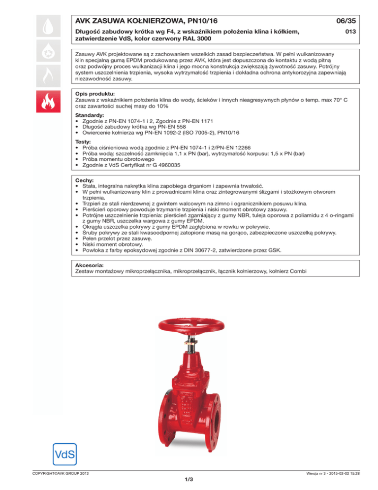AVK ZASUWA KOŁNIERZOWA, PN10/16 Długość zabudowy krótka wg F4, z wskaźnikiem położenia klina i kółkiem, zatwierdzenie VdS, kolor czerwony RAL 3000 06/35 013 Zasuwy AVK projektowane są z zachowaniem wszelkich zasad bezpieczeństwa. W pełni wulkanizowany klin specjalną gumą EPDM produkowaną przez AVK, która jest dopuszczona do kontaktu z wodą pitną oraz podwójny proces wulkanizacji klina i jego mocna konstrukcja zwiększają żywotność zasuwy. Potrójny system uszczelnienia trzpienia, wysoka wytrzymałość trzpienia i dokładna ochrona antykorozyjna zapewniają niezawodność zasuwy. Opis produktu: Zasuwa z wskaźnikiem położenia klina do wody, ścieków i innych nieagresywnych płynów o temp. max 70° C oraz zawartości suchej masy do 10% Standardy: • Zgodnie z PN-EN 1074-1 i 2, Zgodnie z PN-EN 1171 • Długość zabudowy krótka wg PN-EN 558 • Owiercenie kołnierza wg PN-EN 1092-2 (ISO 7005-2), PN10/16 Testy: • Próba ciśnieniowa wodą zgodnie z PN-EN 1074-1 i 2/PN-EN 12266 • Próba wodą: szczelność zamknięcia 1,1 x PN (bar), wytrzymałość korpusu: 1,5 x PN (bar) • Próba momentu obrotowego • Zgodnie z VdS Certyfikat nr G 4960035 Cechy: • Stała, integralna nakrętka klina zapobiega drganiom i zapewnia trwałość. • W pełni wulkanizowany klin z prowadnicami klina oraz zintegrowanymi ślizgami i stożkowym otworem trzpienia. • Trzpień ze stali nierdzewnej z gwintem walcowym na zimno i ogranicznikiem posuwu klina. • Pierścień oporowy powoduje trzymanie trzpienia i niski moment obrotowy zasuwy. • Potrójne uszczelnienie trzpienia: pierścień zgarniający z gumy NBR, tuleja oporowa z poliamidu z 4 o-ringami z gumy NBR, uszczelka wargowa z gumy EPDM. • Okrągła uszczelka pokrywy z gumy EPDM zagłębiona w rowku w pokrywie. • Śruby pokrywy ze stali kwasoodpornej zatopione masą na gorąco, zabezpieczone uszczelką pokrywy. • Pełen przelot przez zasuwę. • Niski moment obrotowy. • Powłoka z farby epoksydowej zgodnie z DIN 30677-2, zatwierdzone przez GSK. Akcesoria: Zestaw montażowy mikroprzełącznika, mikroprzełącznik, łącznik kołnierzowy, kołnierz Combi COPYRIGHT©AVK GROUP 2013 Wersja nr 3 - 2015-02-02 15:28 1/3 AVK ZASUWA KOŁNIERZOWA, PN10/16 06/35 Długość zabudowy krótka wg F4, z wskaźnikiem położenia klina i kółkiem, zatwierdzenie VdS, kolor czerwony RAL 3000 013 1 D 2 3 4 5 6 1 7 2 8 3 9 H3 H 4 10 5 11 6 12 7 13 8 14 15 L Wykaz elementów budowy: 1. Kółko ręczne Żeliwo szare, GJL-250 (GG-25) 2. Trzpień Stal z min. 13% zawartości chromu 3. Sworzeń Stal nierdzewna 4. Nakrętka wskaźnika Mosiądz odporny na odcynkowanie 5. Pierścień zgarniający Guma NBR 6. O-ring Guma NBR 7. Łożysko Poliamid 8. Pokrywa Żeliwo sferoidalne, GJS-500 (GGG-50) 9. Pierścień oporowy trzpienia Żeliwo sferoidalne, GJS-500 (GGG-50) 10. Uszczelka wargowa Guma EPDM 11. Śruby pokrywy Stal nierdzewna 1.4301, zatopione masą na gorąco 12. Uszczelka pokrywy Guma EPDM 13. Nakrętka klina Mosiądz odporny na odcynkowanie 14. Klin Żeliwo sferoidalne z gumą EPDM 15. Korpus Żeliwo sferoidalne, GJS-500 (GGG-50) Komponenty mogą być zastąpione materiałami takiej samej bądź wyższej klasy, bez wcześniejszego powiadomienia. Nr katalogowy i wymiary: Nr katalogowy DN mm Owiercenie kołnierzy L mm D mm H mm H3 mm Waga kg 06-050-35-01420 06-065-35-01420 06-080-35-01420 06-100-35-01420 06-125-35-01420 06-150-35-01420 06-200-35-00620 06-200-35-01620 06-250-35-00620 (1) 06-250-35-01620 (1) 06-300-35-00620 (1) 06-300-35-01620 (1) 50 65 80 100 125 150 200 200 250 250 300 300 PN10/16 PN10/16 PN10/16 PN10/16 PN10/16 PN10/16 PN10 PN16 PN10 PN16 PN10 PN16 150 170 180 190 200 210 230 230 250 250 270 270 180 225 225 280 320 320 360 360 500 500 500 500 329 355 382 414 461 540 688 688 780 780 855 855 412 448 482 524 501 683 858 858 980 980 1083 1083 13 16 20 27 36 51 71 71 108 108 116 116 Konstrukcja, materiały oraz warunki wykonania mogą ulec zmianie bez powiadomienia z powodu ciągłego rozwoju naszych produktów. Wersja nr 3 - 2015-02-02 15:28 2/3 Nr katalogowy DN mm Owiercenie kołnierzy L mm D mm H mm H3 mm Waga kg 06-350-35-00620 (1) 06-350-35-01620 (1) 06-400-35-00620 (1) 06-400-35-01620 (1) 350 350 400 400 PN10 PN16 PN10 PN16 290 290 310 310 640 640 640 640 930 930 940 960 1190 1190 1248 1248 203 203 240 240 (1) Bez zatwierdzenia VdS Konstrukcja, materiały oraz warunki wykonania mogą ulec zmianie bez powiadomienia z powodu ciągłego rozwoju naszych produktów. Wersja nr 3 - 2015-02-02 15:28 3/3
