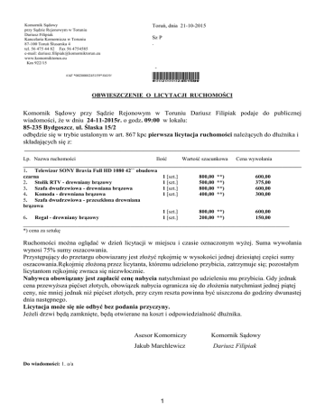 Komornik Sądowy przy Sądzie Rejonowym w Toruniu Dariusz Filipiak Kancelaria Komornicza w Toruniu 87-100 Toruń Ślusarska 4 tel. 56 475 44 82 Fax 56 4754585 e-mail: [email protected] www.komorniktorun.eu Km 922/15 #AF *0020000245159*/0419/ Toruń, dnia 21-10-2015 Sz P . *0020000245159* OBWIESZCZENIE O LICYTACJI RUCHOMOŚCI Komornik Sądowy przy Sądzie Rejonowym w Toruniu Dariusz Filipiak podaje do publicznej wiadomości, że w dniu 24-11-2015r. o godz. 09:00 w lokalu: 85-235 Bydgoszcz, ul. Ślaska 15/2 odbędzie się w trybie ustalonym w art. 867 kpc pierwsza licytacja ruchomości należących do dłużnika i składających się z: ____________________________________________________________________________________________________ Lp. Nazwa ruchomości Ilość Wartość szacunkowa Cena wywołania _____________________________________________________________________________________________________ 1. Telewizor SONY Bravia Full HD 1080 42`` obudowa czarna 1 [szt.] 800,00 **) 600,00 2. Stolik RTV - drewniany brązowy 1 [szt.] 500,00 **) 375,00 3. Szafa dwudrzwiowa - drewniana brązowa 1 [szt.] 800,00 **) 600,00 4. Komoda - drewniana brązowa 1 [szt.] 400,00 **) 300,00 5. Szafa dwudrzwiowa - przeszklona drewniana brązowa 1 [szt.] 800,00 **) 600,00 6. Regał - drewniany brązowy 1 [szt.] 200,00 **) 150,00 _______________________________________________________________________________________________________________________ *) cena za sztukę Ruchomości można oglądać w dzień licytacji w miejscu i czasie oznaczonym wyżej. Suma wywołania wynosi 75% sumy oszacowania. Przystępujący do przetargu obowiazany jest złożyć rękojmię w wysokości jednej dziesiątej części sumy oszacowania.Rękojmię złożoną przez licytanta, któremu udzielono przybicia, zatrzymuje się; pozostałym licytantom rejkojmię zwraca się niezwłocznie. Nabywca obowiązany jest zapłacić cenę nabycia natychmiast po udzieleniu mu przybicia. Gdy jednak cena przewyższa pięćset złotych, obowiązek nabycia ogranicza się do złożenia natychmiast jednej piątej ceny, nie mniej jednak niż pięćset złotych, przy czym reszta powinna być uiszczona do godziny dwunastej dnia następnego. Licytacja może się nie odbyć bez podania przyczyny. Jeżeli drzwi będą zamknięte, będą otwierane na koszt i odpowiedzialność dłużnika. Asesor Komorniczy Komornik Sądowy Jakub Marchlewicz Dariusz Filipiak Do wiadomości: 1. a/a 1