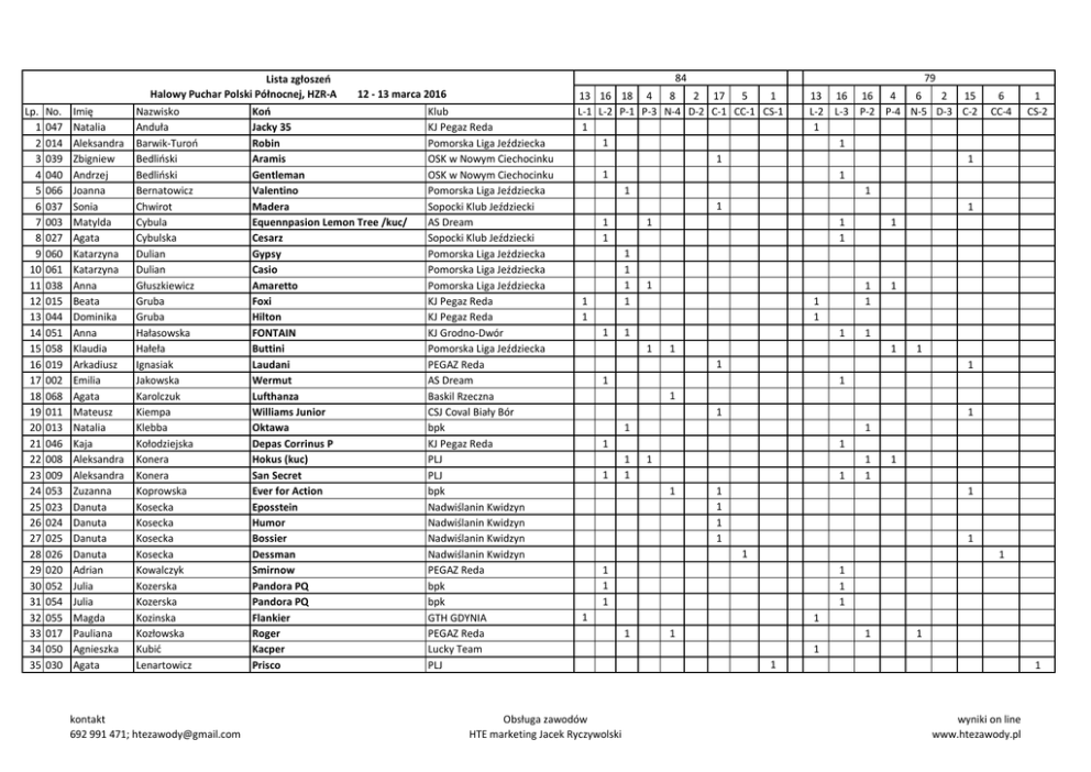 Lista zgłoszeo Halowy Puchar Polski Północnej, HZR-A Lp. 1 2 3 4 5 6 7 8 9 10 11 12 13 14 15 16 17 18 19 20 21 22 23 24 25 26 27 28 29 30 31 32 33 34 35 No. 047 014 039 040 066 037 003 027 060 061 038 015 044 051 058 019 002 068 011 013 046 008 009 053 023 024 025 026 020 052 054 055 017 050 030 Imię Natalia Aleksandra Zbigniew Andrzej Joanna Sonia Matylda Agata Katarzyna Katarzyna Anna Beata Dominika Anna Klaudia Arkadiusz Emilia Agata Mateusz Natalia Kaja Aleksandra Aleksandra Zuzanna Danuta Danuta Danuta Danuta Adrian Julia Julia Magda Pauliana Agnieszka Agata Nazwisko Anduła Barwik-Turoo Bedlioski Bedlioski Bernatowicz Chwirot Cybula Cybulska Dulian Dulian Głuszkiewicz Gruba Gruba Hałasowska Hałeła Ignasiak Jakowska Karolczuk Kiempa Klebba Kołodziejska Konera Konera Koprowska Kosecka Kosecka Kosecka Kosecka Kowalczyk Kozerska Kozerska Kozinska Kozłowska Kubid Lenartowicz kontakt 692 991 471; [email protected] 84 12 - 13 marca 2016 Koo Jacky 35 Robin Aramis Gentleman Valentino Madera Equennpasion Lemon Tree /kuc/ Cesarz Gypsy Casio Amaretto Foxi Hilton FONTAIN Buttini Laudani Wermut Lufthanza Williams Junior Oktawa Depas Corrinus P Hokus (kuc) San Secret Ever for Action Eposstein Humor Bossier Dessman Smirnow Pandora PQ Pandora PQ Flankier Roger Kacper Prisco Klub KJ Pegaz Reda Pomorska Liga Jeździecka OSK w Nowym Ciechocinku OSK w Nowym Ciechocinku Pomorska Liga Jeździecka Sopocki Klub Jeździecki AS Dream Sopocki Klub Jeździecki Pomorska Liga Jeżdziecka Pomorska Liga Jeżdziecka Pomorska Liga Jeździecka KJ Pegaz Reda KJ Pegaz Reda KJ Grodno-Dwór Pomorska Liga Jeździecka PEGAZ Reda AS Dream Baskil Rzeczna CSJ Coval Biały Bór bpk KJ Pegaz Reda PLJ PLJ bpk Nadwiślanin Kwidzyn Nadwiślanin Kwidzyn Nadwiślanin Kwidzyn Nadwiślanin Kwidzyn PEGAZ Reda bpk bpk GTH GDYNIA PEGAZ Reda Lucky Team PLJ 79 13 16 18 4 8 2 17 5 1 L-1 L-2 P-1 P-3 N-4 D-2 C-1 CC-1 CS-1 1 1 1 1 1 1 1 1 1 1 1 1 1 1 1 1 1 1 1 1 1 1 1 1 1 1 1 1 1 1 1 1 1 1 1 1 1 1 1 1 1 1 Obsługa zawodów HTE marketing Jacek Ryczywolski 13 16 16 4 6 2 15 L-2 L-3 P-2 P-4 N-5 D-3 C-2 1 1 1 1 1 1 1 1 1 1 1 1 1 1 6 CC-4 1 CS-2 1 1 1 1 1 1 1 1 1 1 1 1 1 1 1 1 1 1 1 1 1 1 1 1 1 wyniki on line www.htezawody.pl 36 37 38 39 40 41 42 43 44 45 46 47 48 49 50 51 52 53 54 55 56 57 58 59 60 61 62 63 64 65 66 67 68 032 033 016 010 012 056 057 035 021 041 045 028 042 029 022 048 006 007 062 059 036 005 063 067 064 065 043 049 018 034 001 004 031 Aleksandra Aleksandra Dorota Paula Paula Natalia Natalia magdalena Oliwia Agata Martyna Natalie Maura Wiktoria Agnieszka Julia Anna Anna Dominika Oliwia Klaudyna Natalia Alicja Anna Ann Ann Marta Katarzyna Klara Katarzyna Aniela Oliwia Dominika Lesner Lesner Lost Maoczak Maoczak Mańczak Mańczak michalonek Miotke Miś Ossowska Palacz Reszuta Sagan Sawicka Skołysz Skrzeszewska-Walter Skrzeszewska-Walter Słupek Strąk Swędzikiewicz Sznigier Trawioska Tyrkiel_Baranowska Van_den_Broeck Van_den_Broeck Wiśniewska Wojtyniak Woźnicka Wójcik Ziółkowska Ziółkowska Żygowska kontakt 692 991 471; [email protected] Wohlklang U Force Bartuś Fazz-Tetti Salvatore Ferragamo FILANO H URUGWAJ UBIERIENNYJ Cafe Hippis Amberville Chester Excess I Brando grand Centurion Heros Selam CH Tasillo I Valentijin Casio Eviano Vento Destino Diego Ramirez Don Corleone Lizy Pricness Salvatore Lathander N Candyman Eliot Hoormon's Jasper /kuc/ Unlimieted Ballantines KJ Pegaz Reda KJ Pegaz Reda PLJ CSJ Coval Biały Bór CSJ Coval Biały Bór CSJ Coval Biały Bór CSJ Coval Biały Bór bpk PEGAZ Reda OSK w Nowym Ciechocinku KJ Pegaz Reda Pony Club Bartoszewo Klub Jeździecki La Scalla PEGAZ Reda PEGAZ Reda Dolina Charlotty AS Dream AS Dream Pomorska Liga Jeżdziecka bpk Brak AS Dream bpk BPK POM UKJ Pony Club Płochocin UKJ Pony Club Płochocin BPK POM JKS Tornado Szczecin PEGAZ Reda bpk AS Dream AS Dream KJ ARPAV 1 1 1 1 1 1 1 1 1 1 1 1 1 1 1 1 1 1 1 1 1 1 1 1 1 1 1 1 1 1 1 1 1 1 1 1 1 1 1 1 1 1 1 1 1 1 1 1 1 1 1 1 1 1 1 1 1 1 1 1 1 1 1 1 1 1 1 1 1 1 1 1 1 Obsługa zawodów HTE marketing Jacek Ryczywolski 1 1 1 1 1 1 1 1 1 wyniki on line www.htezawody.pl