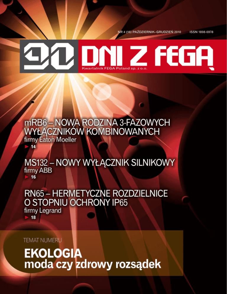 NR 4 (16) październik–grudzień 2010ISSN 1898-6978 Kwartalnik FEGA Poland sp. z o.o. mRB6 – nowa rodzina 3-fazowych wyłączników kombinowanych firmy Eaton Moeller V 14 MS132 – nowy wyłĄcznik silnikowy firmy ABB V 16 RN65 – hermetyczne rozdzielnice o stopniu ochrony IP65 firmy Legrand V 18 temat numeru Ekologia moda czy zdrowy rozsądek SIEDZIBA ul. Wagonowa 5-7 53-609 Wrocław tel. 71 37 60 900 fax 71 37 60 931 [email protected] oddziały ODDZIAŁ BYDGOSZCZ ul. Fordońska 393 85-766 Bydgoszcz tel. 52 32 06 450 fax 52 32 06 451 [email protected] ODDZIAŁ KATOWICE al. Roździeńskiego 170 40-203 Katowice tel. 32 35 83 740 fax 32 35 83 741 [email protected] ODDZIAŁ KRAKÓW ul. Dobrego Pasterza 120A 31-416 Kraków tel. 12 41 09 440 fax 12 41 09 441 [email protected] Magdalena Tomaś, redaktor naczelna Dwa lata temu, poniedziałek, 8:00 rano, odebram telefon: „Pani Magdo, wydaje mi się, że ten przecinek nie powinien być postawiony w tym miejscu…”. Jaki przecinek? Szybkie przebudzenie i mózg zlokalizował rozmówcę. „Panie Januszu, już idę”. W drodze przypominałam sobie zasady pisowni, a pod pachą targałam wszystkie dostępne słowniki… ODDZIAŁ ŁÓDŹ ul. Niciarniana 33/39 92-320 Łódź tel. 42 64 80 543 fax 42 64 80 541 [email protected] Trzy miesiące później już nie denerwowałam się tak, jak tamtego ranka. ODDZIAŁ POZNAŃ ul. Dąbrowskiego 399 60-425 Poznań tel. 61 84 98 800 fax 61 84 98 801 [email protected] Trafił w sedno, zaczepnie rzucał haczyk… ODDZIAŁ WARSZAWA ul. Instalatorów 9 02-237 Warszawa tel. 22 73 92 400 fax 22 73 92 410 [email protected] dzwonił. W ręku trzymałam kwartalnik bez śladów korekty – odczułam pustkę. ODDZIAŁ WAŁBRZYCH ul. Wrocławska 130 Wałbrzych 58-306 tel. 74 66 49 505 fax 74 66 54 054 [email protected] Czasami rację miał Pan Janusz, czasami ja. Chwilami pojawiało się we mnie uczucie irytacji, że bezsensownie tracimy kilka godzin na dysputach o przecinkach, kropkach, o błędach językowych. Dopiero później zrozumiałam, że Pan Janusz znalazł dobry sposób na mnie. W końcu zobaczyłam, ile te nasze kwartalne rozmowy wnosiły w rozwój kwartalnika, a przede wszystkim mój. I tak upłynęły dwa lata. Dawałam kwartalnik do zaopiniowania przed weekendem i czekałam na poniedziałkowy telefon, i oczywiście spotkanie. Niestety w pewien poniedziałek telefon o 8:00 nie zaPrzyzwyczajamy się do pewnych sytuacji i zapominamy, że życie kieruje się własnymi prawami. Dziś trzymacie Państwo w ręku drugi numer kwartalnika „90 dni z FEGĄ”, który nie został zatwierdzony przez Janusza Jaworskiego. Żałuję, że nie miał On okazji zobaczyć czasopisma w nowym layoucie oraz zmian wewnątrz. Żałuję, bo wiele tych zmian zrodziło się podczas naszych kwartalnych rozmów, więc to również dzieło Pana Janusza. W tym numerze prezentujemy Państwu sylwetkę Marioli Połetek, dyrektora finansowego. Już słyszę uszami wyobraźni żartobliwe utarczki słowne, które redakcja REDAKTOR NACZELNA Magdalena Tomaś tel. 71 37 60 914 REDAKTOR Anna Chrzanowska-Łysak DTP Karol Łotocki Lorem Ipsum Studio [email protected] Nr 4 (16) październik–grudzień 2010 r. Nakład 1000 egz. Uwagi i sugestie proszę kierować na adres [email protected] miałyby miejsce pomiędzy tymi dwiema charyzmatycznymi osobowościami: Panem Januszem i Panią Mariolą. Wciąż dźwięczą mi w uszach krzyki Pana Janusza, że mamy wspaniałych, w ykwalifikowanych pracowników, więc trzeba w końcu wykorzystać ich potencjał. Stąd pomysł na dział Temat numeru. Jako pierwsza Anna Chrzanowska-Łysak naświetli nam sytuację w kwestii ekologicznych źródłach światła. Pan Janusz zawsze powtarzał, że koniecznie trzeba więcej miejsca poświęcić produktom, które oferujemy oraz wydarzeniom w naszej branży. My zawsze mówiliśmy „nie ma miejsca”, „koszty”. Ten numer jednak jest dowodem, że chcieć to móc. Efektem są dwa rozszerzone działy: Aktualności rynkowe oraz Wydarzenia. Życzę przyjemnej lektury spis treści wywiad 3 4 6 8 Od strony finansowej... Rozmowa z Mariolą Połetek wydarzenia Janusz Jaworski Założyciela i dyrektora FEGA Poland sp. z o.o. wspomina Anna Chrzanowska-Łysak i Uwe Schaffitzel Świat w obiektywie FEGA Poland Rozstrzygnięcie konkursu fotograficznego Wydarzenia 10Aktualności rynkowe 12Ekologia – moda czy zdrowy rozsądek temat numeru Oświetlenie, cz. I 14 16MS132 – nowy wyłacznik silnikowy produkty mRB6 – nowa rodzina 3-fazowych wyłączników kombinowanych firmy Eaton Moeller firmy ABB 18RN65 – hermetyczne rozdzielnice o stopniu ochrony IP65 firmy Legrand 20Altivar 12 i Altivar 312 firmy Schneider Electric 22 Wyłączniki LZM firmy Eaton Moeller 24golf – nowe rozdzielnice VS/VF firmy Hager 25 System automatyzacji budynków firmy KOS Elektro System 26 CADDY® ROD LOCK firmy Erico 27 Oprawy z serii Acciaio Beghelli® 28Mufy i głowice kablowe firmy Radpol 30Rozwiązania oświetleniowe PROTEC.class rozmaitości 32 Czy wiesz, że… 32 Przygody Fegusia wywiad OD STRONY FINANSOWEJ... z nowym dyrektorem finansowym, Mariolą Połetek, rozmawia Magdalena Tomaś Magdalena Tomaś: Pani Mariolu, jak długo zajmuje się Pani finansami w branży elektrotechnicznej? Mariola Potełek: Dyrektorem finansowym w branży elektrotechnicznej jestem od 1999 r., czyli już 11 lat. Wcześniej pracowałam w dziale ekonomicznym, gdzie miałam okazję przejść całą ścieżkę rozwoju finansowego, od księgowej, poprzez analityka ekonomicznego, aż do głównej księgowej. MT: Jak ocenia Pani rok 2009? Czy spowolnienie gospodarcze miało istotny wpływ na wyniki finansowe spółek działających w tej branży? MP: Spowolnienie, a właściwie to już kryzys gospodarczy, oddziałuje na wszystkie sektory gospodarcze. W naszej branży kryzys dosięga firmy z lekkim opóźnieniem. Wynika to przede wszystkim z faktu, że elektryka to ostatni element procesu budowlanego. Tak naprawdę to dopier