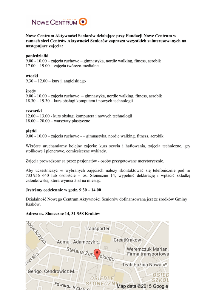 Nowe Centrum Aktywności Seniorów działające przy Fundacji Nowe Centrum w ramach sieci Centrów Aktywności Seniorów zaprasza wszystkich zainteresowanych na następujące zajęcia: poniedziałki 9.00 - 10.00 – zajęcia ruchowe – gimnastyka, nordic walking, fitness, aerobik 17.00 – 19.00 – zajęcia twórczo-medialne wtorki 9.30 – 12.00 – kurs j. angielskiego środy 9.00 - 10.00 – zajęcia ruchowe – gimnastyka, nordic walking, fitness, aerobik 18.30 – 19.30 – kurs obsługi komputera i nowych technologii czwartki 12.00 – 13.00 - kurs obsługi komputera i nowych technologii 18.00 – 20.00 – warsztaty plastyczne piątki 9.00 - 10.00 – zajęcia ruchowe - – gimnastyka, nordic walking, fitness, aerobik Wkrótce uruchamiamy kolejne zajęcia: kurs szycia i haftowania, zajęcia techniczne, gry stolikowe i plenerowe, comiesięczne wykłady. Zajęcia prowadzone są przez pasjonatów - osoby przygotowane merytorycznie. Aby uczestniczyć w wybranych zajęciach należy skontaktować się telefonicznie pod nr 733 956 640 lub osobiście – os. Słoneczne 14, wypełnić deklarację i wpłacić składkę członkowską, która wynosi 5 zł na miesiąc. Jesteśmy codziennie w godz. 9.30 – 14.00 Działalność Nowego Centrum Aktywności Seniorów dofinansowana jest ze środków Gminy Kraków. Adres: os. Słoneczne 14, 31-958 Kraków