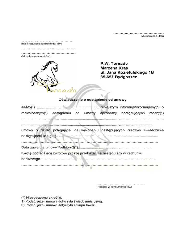 ........................................ Miejscowość, data …………………................ Imię i nazwisko konsumenta(-ów) ........................................... ........................................... Adres konsumenta(-ów) P.W. Tornado Marzena Kras ul. Jana Kozietulskiego 1B 85-657 Bydgoszcz Oświadczenie o odstąpieniu od umowy Ja/My(*) ............................................................. niniejszym informuję/informujemy(*) o moim/naszym(*) odstąpieniu od umowy sprzedaży następujących rzeczy(*) ............................................................................................................................................. .................................................................................................................................. umowy o dzieło polegającej na wykonaniu następujących rzeczy/o świadczenie następującej usługi(*)..................................................................................................... ………………………………………………………………………………………………….. Data zawarcia umowy1/odbioru2(*)......................................................................... Kwotę podlegającą zwrotowi proszę przekazać na następujący nr rachunku bankowego…………………………………………………………………………………… ………………………………………………………………………………………………….. ……………………………….. Podpis(-y) konsumenta(-ów) (*) Niepotrzebne skreślić. 1) Podać, jeżeli umowa dotyczyła świadczenia usług. 2) Podać, jeżeli umowa dotyczyła zakupu towaru.
