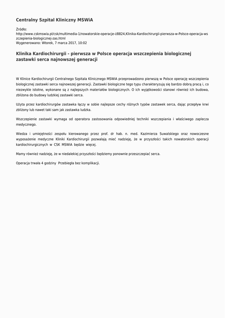 Centralny Szpital Kliniczny MSWiA Źródło: http://www.cskmswia.pl/csk/multimedia-1/nowatorskie-operacje-i/8824,Klinika-Kardiochirurgii-pierwsza-w-Polsce-operacja-ws zczepienia-biologicznej-zas.html Wygenerowano: Wtorek, 7 marca 2017, 10:02 Klinika Kardiochirurgii - pierwsza w Polsce operacja wszczepienia biologicznej zastawki serca najnowszej generacji W Klinice Kardiochirurgii Centralnego Szpitala Klinicznego MSWiA przeprowadzono pierwszą w Polsce operację wszczepienia biologicznej zastawki serca najnowszej generacji. Zastawki biologiczne tego typu charakteryzują się bardzo dobrą pracą i, co niezwykle istotne, wykonane są z najlepszych materiałów biologicznych. O ich wyjątkowości stanowi również ich budowa, zbliżona do budowy ludzkiej zastawki serca. Użyta przez kardiochirurgów zastawka łączy w sobie najlepsze cechy różnych typów zastawek serca, dając przepływ krwi zbliżony lub nawet taki sam jak zastawka ludzka. Wszczepienie zastawki wymaga od operatora zastosowania odpowiedniej techniki wszczepiania i właściwego zaplecza medycznego. Wiedza i umiejętności zespołu kierowanego przez prof. dr hab. n. med. Kazimierza Suwalskiego oraz nowoczesne wyposażenie medyczne Kliniki Kardiochirurgii pozwalają mieć nadzieję, że w przyszłości takich nowatorskich operacji kardiochirurgicznych w CSK MSWiA będzie więcej. Mamy również nadzieję, że w niedalekiej przyszłości będziemy ponownie przeszczepiać serca. Operacja trwała 4 godziny Przebiegła bez komplikacji. fot. Michał Niwicz fot. Michał Niwicz fot. Michał Niwicz Drukuj Generuj PDF Powiadom znajomego Wstecz
