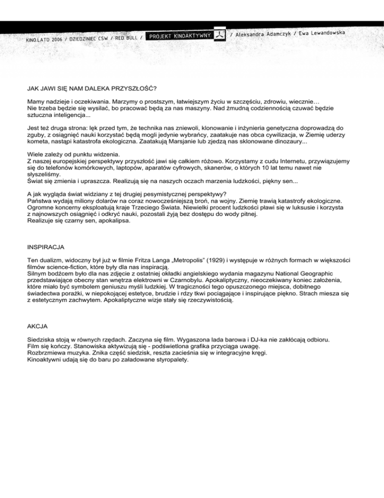 JAK JAWI SIĘ NAM DALEKA PRZYSZŁOŚĆ? Mamy nadzieje i oczekiwania. Marzymy o prostszym, łatwiejszym życiu w szczęściu, zdrowiu, wiecznie… Nie trzeba będzie się wysilać, bo pracować będą za nas maszyny. Nad żmudną codziennością czuwać będzie sztuczna inteligencja... Jest też druga strona: lęk przed tym, że technika nas zniewoli, klonowanie i inżynieria genetyczna doprowadzą do zguby, z osiągnięć nauki korzystać będą mogli jedynie wybrańcy, zaatakuje nas obca cywilizacja, w Ziemię uderzy kometa, nastąpi katastrofa ekologiczna. Zaatakują Marsjanie lub zjedzą nas sklonowane dinozaury... Wiele zależy od punktu widzenia. Z naszej europejskiej perspektywy przyszłość jawi się całkiem różowo. Korzystamy z cudu Internetu, przywiązujemy się do telefonów komórkowych, laptopów, aparatów cyfrowych, skanerów, o których 10 lat temu nawet nie słyszeliśmy. Świat się zmienia i upraszcza. Realizują się na naszych oczach marzenia ludzkości, piękny sen... A jak wygląda świat widziany z tej drugiej pesymistycznej perspektywy? Państwa wydają miliony dolarów na coraz nowocześniejszą broń, na wojny. Ziemię trawią katastrofy ekologiczne. Ogromne koncerny eksploatują kraje Trzeciego Świata. Niewielki procent ludzkości pławi się w luksusie i korzysta z najnowszych osiągnięć i odkryć nauki, pozostali żyją bez dostępu do wody pitnej. Realizuje się czarny sen, apokalipsa. INSPIRACJA Ten dualizm, widoczny był już w filmie Fritza Langa „Metropolis” (1929) i występuje w różnych formach w większości filmów science-fiction, które były dla nas inspiracją. Silnym bodźcem było dla nas zdjęcie z ostatniej okładki angielskiego wydania magazynu National Geographic przedstawiające obecny stan wnętrza elektrowni w Czarnobylu. Apokaliptyczny, nieoczekiwany koniec założenia, które miało być symbolem geniuszu myśli ludzkiej. W tragiczności tego opuszczonego miejsca, dobitnego świadectwa porażki, w niepokojącej estetyce, brudzie i rdzy tkwi pociągające i inspirujące piękno. Strach miesza się z estetycznym zachwytem. Apokaliptyczne wizje stały się rzeczywistością. AKCJA Siedziska stoją w równych rzędach. Zaczyna się film. Wygaszona lada barowa i DJ-ka nie zakłócają odbioru. Film się kończy. Stanowiska aktywizują się - podświetlona grafika przyciąga uwagę. Rozbrzmiewa muzyka. Znika część siedzisk, reszta zacieśnia się w integracyjne kręgi. Kinoaktywni udają się do baru po załadowane styropalety. ELEMENTY 01. styropalety Sześciokątny, równoboczny element wykonany ze styropianu. Wymiary: 20cm grubości, 55cm średnicy, 28cm bok Może funkcjonować jako ściana, taca, stolik, wieża. Styropalety mają specjalnie wyprofilowane wgłębienia na puszki i butelki Red Bull, które można rozmieszczać w różnych konfiguracjach. Elementy zestawione razem w płaszczyźnie pionowej tworzą ścianę; zazębiają się w stabilną konstrukcję. Mogą funkcjonować jako pojedyncze elementy: tace na napoje. Układając jedną styropaletę na drugiej można zbudować mały stolik-beczkę. Dodając kolejne elementy możemy stworzyć kolumnę. 02. siedziska Wykorzystujemy dostępne krzesła. Poddajemy je procesowi restylingu poprzez prosty zabieg: nałożenie pokrowców wykonanych z materiału z metalicznym nadrukiem. Pokrowce są dodatkowo wyprofilowane i wypełnione gąbką, łączenie pomiędzy krzesłami jest luźne. Zwykłe krzesła całkowicie zmieniają wizerunek, nabierają nowego, mocnego charakteru. Uporządkowane, pogrupowane po 5 sztuk układają się w równe rzędy. Żadnego bałaganu, szurania krzesłami, przestawiania ich przed projekcją filmu czy w trakcie. Jak w prawdziwym kinie... Proponujemy 3 rodzaje pokrowców. Siedziska są bardzo funkcjonalne, łatwe w montażu i demontażu; składają się w harmonijkę dzięki czemu nie ma problemu z ich magazynowaniem. Po projekcji filmu siedziska można ustawić w sprzyjające integracji półkola, albo szybko złożyć. 03. lady: bar i dj-ka Wymiary: 250cm długości, 50cm głębokości, 110cm wysokości Front lady wykonany jest z kątowników o profilu trójkąta równobocznego. W kątownikach wykonanych z półprzeźroczystej pleksi umieszczone są świetlówki. Obracają się wokół własnej osi, są ze sobą zsynchronizowane. Mogą być obracane mechanicznie lub sterowane automatycznie według określonego rytmu. Widzimy zmieniające się obrazy, albo źródło światła. Kątowniki mają naniesione z dwóch stron kadry z filmu science-fiction. Grafika może być w łatwy sposób wymieniana, można wykorzystać kadry z wyświetlanych filmów lub grafikę związaną z tematem projekcji. DANE Aleksandra Adamczyk mail: [email protected] tel.: 504 248 418 Ewa Lewandowska mail: [email protected] tel.: 608 18 00 00 tel. dom.: 061 828 05 77 os. Zwycięstwa 10/68 61-646 Poznań