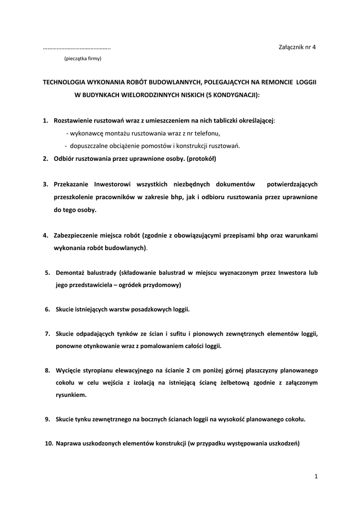 …………………………………….. Załącznik nr 4 (pieczątka firmy) TECHNOLOGIA WYKONANIA ROBÓT BUDOWLANNYCH, POLEGAJĄCYCH NA REMONCIE LOGGII W BUDYNKACH WIELORODZINNYCH NISKICH (5 KONDYGNACJI): 1. Rozstawienie rusztowań wraz z umieszczeniem na nich tabliczki określającej: - wykonawcę montażu rusztowania wraz z nr telefonu, - dopuszczalne obciążenie pomostów i konstrukcji rusztowań. 2. Odbiór rusztowania przez uprawnione osoby. (protokół) 3. Przekazanie Inwestorowi wszystkich niezbędnych dokumentów potwierdzających przeszkolenie pracowników w zakresie bhp, jak i odbioru rusztowania przez uprawnione do tego osoby. 4. Zabezpieczenie miejsca robót (zgodnie z obowiązującymi przepisami bhp oraz warunkami wykonania robót budowlanych). 5. Demontaż balustrady (składowanie balustrad w miejscu wyznaczonym przez Inwestora lub jego przedstawiciela – ogródek przydomowy) 6. Skucie istniejących warstw posadzkowych loggii. 7. Skucie odpadających tynków ze ścian i sufitu i pionowych zewnętrznych elementów loggii, ponowne otynkowanie wraz z pomalowaniem całości loggii. 8. Wycięcie styropianu elewacyjnego na ścianie 2 cm poniżej górnej płaszczyzny planowanego cokołu w celu wejścia z izolacją na istniejącą ścianę żelbetową zgodnie z załączonym rysunkiem. 9. Skucie tynku zewnętrznego na bocznych ścianach loggii na wysokość planowanego cokołu. 10. Naprawa uszkodzonych elementów konstrukcji (w przypadku występowania uszkodzeń) 1 a) Antykorozyjne zabezpieczenie zbrojenia loggii. Przed przystąpieniem do naprawy uszkodzonej konstrukcji płyty balkonowej należy zabezpieczyć elementy stalowe, które stanowią zbrojenie płyty konstrukcyjnej. Elementy te powinny przed naniesieniem zaprawy naprawczej zostać dokładnie oczyszczone z rdzy i zabrudzeń, a następnie zabezpieczone jednoskładnikową zaprawą antykorozyjną Disbocret 502 ProtectPlus. Należy pamiętać o dokładnym oczyszczeniu elementów stalowych z rdzy oraz o naniesieniu zaraz po oczyszczeniu pierwszej warstwy zabezpieczającej Disbocret 502 ProtectPlus. – zaprawę nanosi się obficie pędzlem. Po ok. 4 godzinach, nanoszona zostaje druga warstwa Disbocret 502 ProtectPlus. Druga warstwa zabezpieczenia powinna zostać nałożona do 48 godz. od nałożenia pierwszej; b) Wykonanie warstwy sczepnej. Na oczyszczonej konstrukcyjnej płycie balkonowej wykonać warstwę sczepną z Disbocret 502 ProtectPlus. Materiał nanosić równomiernie na przygotowane podłoże okrągłym pędzlem lub szczotką. Zamykać pory i intensywnie wcierać. Zaprawy naprawcze nanosić metodą „mokrym w mokre”. W przypadku wyschnięcia warstwy sczepnej, np. na skutek nie planowanych przerw w pracy, należy ją całkowicie wysuszyć, a przed dalszą obróbką nanieść kolejną warstwę sczepną. c) Naprawa uszkodzonych krawędzi loggii oraz wyrównywanie powierzchni. Do naprawy uszkodzonych krawędzi płyty balkonowej i powierzchni poziomej płyty używać należy szybkowiążącą zaprawę naprawczą Disbocret 545 PCC Feinmortel, która pozwala na naprawę ubytków w zakresie od 4 do 40 mm. Zaprawę naprawczą można nanosić zarówno na powierzchnie pionowe, jak i poziome stosując ją jako szpachlówkę wyrównawczą. Warstwę wyrównawczą wykonać ze spadkiem. Przed przystąpieniem do aplikacji zaprawy musimy usunąć z podłoża wszystkie luźne części betonu do uzyskania stabilnego i szorstkiego podłoża, na którym wykonujemy warstwę sczepną. Odkryte zbrojenie należy wcześniej zabezpieczyć przy użyciu Disbocret 502 ProtectPlus. Wkleić styropian cieńszy o 2cm od istniejącego na ścianie loggii. 11. Bezpośrednio na płycie balkonowej należy ułożyć bitumiczna masę izolacyjną (np. Fundamentflex 2K). W celu uniknięcia załamania masy na połączeniu płyty ze ścianą należy wykonać klin z w/w masy. 12. Następnie należy wkleić styropian na istniejącą ścianę – do samej płyty balkonowej – cieńszy o 2-3 cm od wykonanego na ścianie loggii. 2 13. Wykonanie warstwy spadkowej Ułożenie warstwy spadkowej z gotowej zaprawy (np: BORNIT E) o wytrzymałości min. C20/25 – z zachowaniem spadku 2-2,5%. UWAGA: Zachodzi konieczność dostosowania wszystkich wymaganych warstw do wejścia do pomieszczeń !!! 14. Wykonanie obróbek blacharskich wzdłuż czoła loggii z blachy ocynkowanej o grubości min. 0,5 mm na zakład (połączenie blach podklejone i uszczelnione) z wywinięciem na ściany loggii, bądź z profilu okapowego aluminiowego np. Renoplast K30. Różnica cenowa zostanie uwidoczniona w ofercie cenowej. Uszczelnienie połączenia obróbki blacharskiej z warstwą spadkową taśmą uszczelniającą butylową samoprzylepną. Mocowanie mechaniczne blachy do powierzchni balkonu. Przy wykonywaniu obróbki blacharskiej należy zachować płaszczyznę warstwy spadkowej. 15. Wykonanie warstwy hydroizolacji mineralnej Warstwę hydroizolacji wykonać za pomocą mineralnej zaprawy dwuskładnikowej (np. BORNIT ES) nakładanej w dwóch etapach technologicznych. Łączna grubość warstw 3 mm. Izolacja wykonywana na płycie wraz z wywinięciem na ściany loggii na wskazaną wysokość . Na styku ściany z płytą balkonową i połączeniu z obróbką blacharską wtopić taśmy uszczelniające (np. BORNIT FB+ lub BORNIT FBB). Pierwsza warstwa hydroizolacji powinna być możliwie najcieńsza i wtarta na ostro (gładką stalową pacą) w odpowiednio przygotowane wcześniej podłoże tak, aby masa dokładnie wypełniła wszystkie pory znajdujące się na jego powierzchni. UWAGA: Konieczność wywinięcia warstw izolacyjnych na ściany żelbetowe pozbawione tynków i styropianu !!! Konieczność zachowania ciągłości izolacji od ościeżnicy drzwi balkonowych do podłoża. 16. Montaż okładziny ceramicznej i spoinowanie Płytka powinna być wypełniona zaprawą w 100%. Nie dopuszcza się klejenia na tzw. „PLACKI”. Klej elastyczny i odporny na warunki atmosferyczne (np. BORNIT EK) 