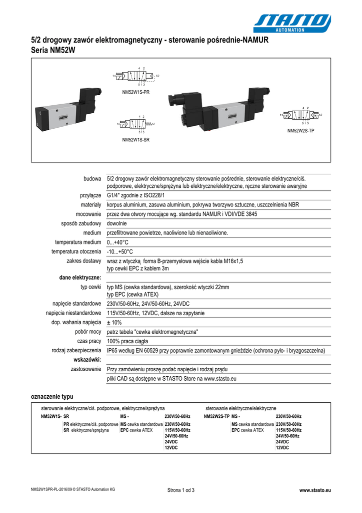 5/2 drogowy zawór elektromagnetyczny - sterowanie pośrednie-NAMUR Seria NM52W NM52W1S-PR NM52W2S-TP NM52W1S-SR budowa 5/2 drogowy zawór elektromagnetyczny sterowanie pośrednie, sterowanie elektryczne/ciś. podporowe, elektryczne/sprężyna lub elektryczne/elektryczne, ręczne sterowanie awaryjne przyłącze G1/4" zgodnie z ISO228/1 materiały korpus aluminium, zasuwa aluminium, pokrywa tworzywo sztuczne, uszczelnienia NBR mocowanie przez dwa otwory mocujące wg. standardu NAMUR i VDI/VDE 3845 sposób zabudowy dowolnie medium przefiltrowane powietrze, naoliwione lub nienaoliwione. temperatura medium 0...+40°C temperatura otoczenia -10...+50°C zakres dostawy wraz z wtyczką forma B-przemysłowa wejście kabla M16x1,5 typ cewki EPC z kablem 3m dane elektryczne: typ cewki typ MS (cewka standardowa), szerokość wtyczki 22mm typ EPC (cewka ATEX) napięcie standardowe 230V/50-60Hz, 24V/50-60Hz, 24VDC napięcia niestandardowe 115V/50-60Hz, 12VDC, dalsze na zapytanie dop. wahania napięcia ± 10% pobór mocy patrz tabela "cewka elektromagnetyczna" czas pracy 100% praca ciągła rodzaj zabezpieczenia IP65 według EN 60529 przy poprawnie zamontowanym gnieździe (ochrona pyło- i bryzgoszczelna) wskazówki: zastosowanie Przy zamówieniu proszę podać napięcie i rodzaj prądu pliki CAD są dostępne w STASTO Store na www.stasto.eu oznaczenie typu sterowanie elektryczne/ciś. podporowe, elektryczne/sprężyna NM52W1S- SR MS - sterowanie elektryczne/elektryczne 230V/50-60Hz PR elektryczne/ciś. podporowe MS cewka standardowa 230V/50-60Hz SR elektryczne/sprężyna EPC cewka ATEX 115V/50-60Hz 24V/50-60Hz 24VDC 12VDC NM52W1SPR-PL-2016/09 © STASTO Automation KG Strona 1 od 3 NM52W2S-TP MS - 230V/50-60Hz MS cewka standardowa 230V/50-60Hz EPC cewka ATEX 115V/50-60Hz 24V/50-60Hz 24VDC 12VDC www.stasto.eu średnica nominalna DN [mm] zakres ciśnień [bar] przepływ [Nl/min] * typ 8 2,5-10 1080 NM52W1S-SR 8 2,5-10 1080 NM52W1S-PR 8 1,5-10 1080 NM52W2S-TP *ciśnienie referencyjne 6bar, temperatura referencyjna 20°C diagram przepływu czas przesterowania, nominalna max. frekwencja czas przesterowania [ms] nominalna max. frekwencja [Hz] NM52W1S-SR NM52W1S-PR NM52W1S-SR NM52W1S-PR AC EIN AC z DC EIN DC z AC EIN AC z DC EIN DC z AC DC AC DC 19 35 21 46 18 33 21 44 11 11 16 13 czas przesterowania [ms] nominalna max. frekwencja [Hz] NM52W2S-TP NM52W2S-TP AC EIN AC z DC EIN DC z AC DC 11 11 14 14 27 21 NM52W1SPR-PL-2016/09 © STASTO Automation KG Strona 2 od 3 www.stasto.eu cewki magnetyczne napięcie rodzaj zabezpieczenia 12VDC 24VDC pobór mocy przy 20°C typ 3W MS01200 3W MS02400 5VA MS02450 115V/50-60Hz 5VA MS11550 230V/50-60Hz 5VA MS23050 24VDC 3,0W EPC02400 24V/50-60Hz 3.2W EPC02450 3,2W EPC11050 3,2W EPC23050 24V/50-60Hz IP65 Ex II 2G Ex mb IIC T5 Gb 110V/50-60Hz Ex II 2D Ex mb tb IIIC T95°C IP66 Db 230V/50-60Hz rysunki poglądowe Zmiany w konstrukcji, wymiarach i wykonaniu materiałowym zastrzeżone NM52W1SPR-PL-2016/09 © STASTO Automation KG Strona 3 od 3 www.stasto.eu