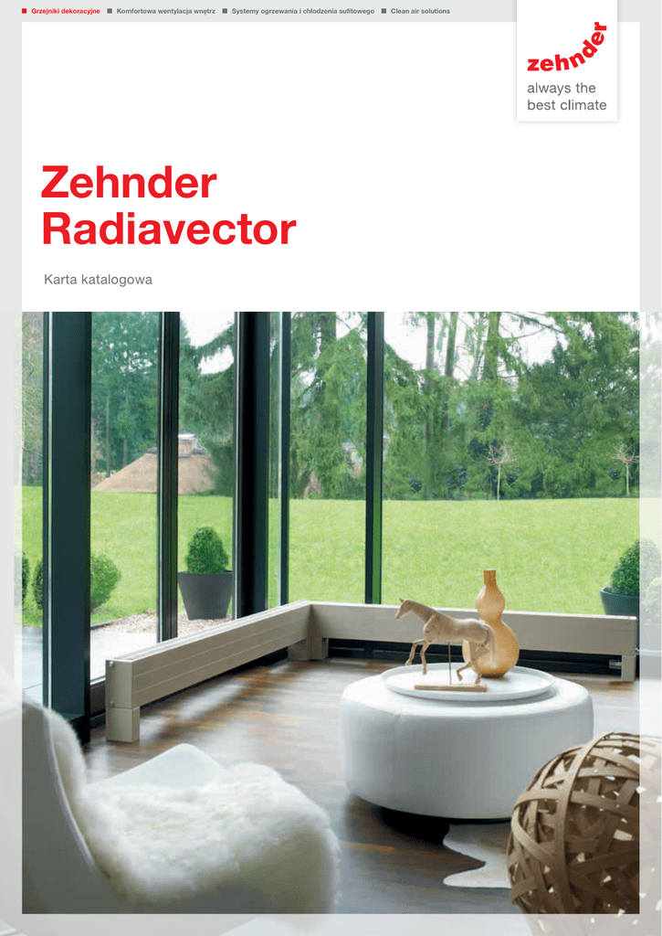 Grzejniki dekoracyjne Komfortowa wentylacja wnętrz Systemy ogrzewania i chłodzenia sufitowego Zehnder Radiavector Karta katalogowa Clean air solutions Zehnder Radiavector Wydajny i prosty. Dzięki dużej mocy cieplnej konwektor Zehnder Radiavector doskonale nadaje się do stosowania przed oknami lub w oranżeriach. Również optycznie, dzięki niewielkiej wysokości. Dostępne są również rozwiązania narożne i specjalne. Dostępny w niemal wszystkich kolorach i powierzchniach z karty kolorów Zehnder. Zalety ■ Kompaktowa konstrukcja ■ Krótki czas reakcji umożliwia szybkie ogrzanie pomieszczeń ■ Znakomita moc cieplna umożliwia ogrzanie nawet dużych pomieszczeń ■ Wszechstronne możliwości stosowania dzięki rozwiązaniom specjalnym, na przykład modele kątowe ■ Niski, a dzięki temu idealny do umieszczenia przed fasadą szklaną ■ Na zamówienie dostępne są przyspawane konsole z nóżkami, umożliwiające ukryte podłączenie od dołu Przegląd modeli RV211 - RV214 RV221 - RV224 z dodatkowymi lamelami RV321 - RV324 RV431 - RV434 2-rurowy, głębokość 73 mm 2-rurowy, głębokość 104 mm 3-rurowy, głębokość 134 mm 4-rurowy, głębokość 195 mm RV211/1 - RV214/1 2-rurowy, głębokość 134 mm RV321/1 - RV324/1 3-rurowy, głębokość 195 mm RV431/1 - RV434/1 4-rurowy, głębokość 256 mm RV541 - RV544 5-rurowy, głębokość 256 mm RV541/1 - RV544/1 5-rurowy, głębokość 317 mm Przegląd modeli Dane techniczne grzejników o długości 1000 mm Model H T Moc cieplna 75/65/20 °C1) 70/55/20 °C 55/45/20 °C mm mm W W W RV211 70 73 369 301 194 RV221 70 105 460 374 239 RV321 70 134 628 508 323 RV431 70 195 837 675 426 RV541 70 256 1077 870 552 RV432 140 195 1256 1012 637 RV322 140 134 915 738 466 RV542 140 256 1660 1342 850 RV212 140 73 528 427 272 RV222 140 105 651 525 332 RV213 210 73 689 555 349 RV223 210 105 850 681 424 RV323 210 134 1172 944 594 RV433 210 195 1625 1305 815 RV543 210 256 2148 1736 1100 RV434 280 195 1979 1587 988 RV214 280 73 865 692 430 RV224 280 105 1076 857 526 RV324 280 134 1425 1144 715 H = wysokość, T = głębokość 1) Normatywna moc cieplna wg PN-EN 442 www.zehnder.pl V20161213, PL_pl, zmiany zastrzeżone Zehnder Radiavector Przegląd modeli Dane techniczne grzejników o długości 1000 mm Model H T Moc cieplna 75/65/20 °C1) 70/55/20 °C 55/45/20 °C mm mm W W W RV544 280 256 2587 2091 1325 Przegląd modeli ze strefą niewodonośną Dane techniczne grzejników o długości 1000 mm Model H T Moc cieplna RV211/1 70 134 477 389 251 RV321/1 70 195 737 599 383 RV431/1 70 256 958 784 511 RV541/1 70 317 1177 967 634 RV212/1 140 134 717 581 371 RV322/1 140 195 1088 881 560 RV432/1 140 256 1373 1117 718 RV542/1 140 317 1676 1366 881 RV213/1 210 134 953 769 486 RV323/1 210 195 1391 1124 712 RV433/1 210 256 1832 1478 933 RV543/1 210 317 2251 1816 1147 608 RV214/1 280 134 1205 969 RV324/1 280 195 1677 1353 854 RV434/1 280 256 2375 1901 1180 RV544/1 280 317 2952 2363 1466 H = wysokość, T = głębokość 1) Normatywna moc cieplna wg PN-EN 442 Zehnder Polska Sp. z o.o. · ul. Kurpiów 14 A · 52-214 Wrocław · Polska T +48 71 367 64 24 · F +48 71 367 64 25 · [email protected] · www.zehnder.pl V20161213, RAD_DAS, PL_pl, zmiany zastrzeżone 75/65/20 °C1) 70/55/20 °C 55/45/20 °C mm mm W W W