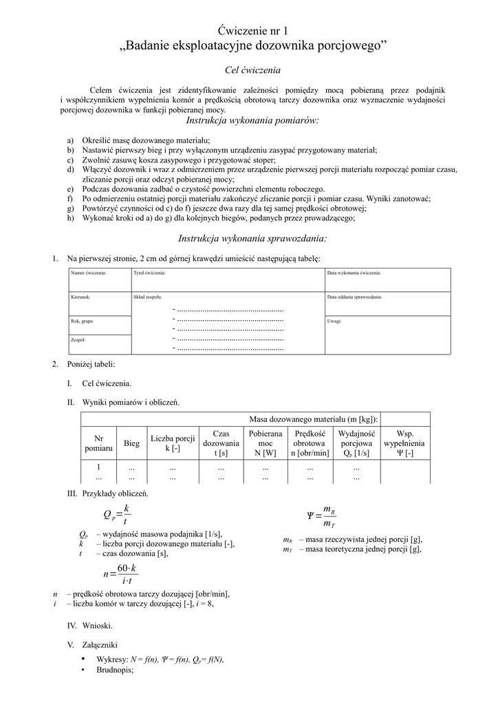 Ćwiczenie nr 1 „Badanie eksploatacyjne dozownika porcjowego” Cel ćwiczenia Celem ćwiczenia jest zidentyfikowanie zależności pomiędzy mocą pobieraną przez podajnik i współczynnikiem wypełnienia komór a prędkością obrotową tarczy dozownika oraz wyznaczenie wydajności porcjowej dozownika w funkcji pobieranej mocy. Instrukcja wykonania pomiarów: a) b) c) d) Określić masę dozowanego materiału; Nastawić pierwszy bieg i przy wyłączonym urządzeniu zasypać przygotowany materiał; Zwolnić zasuwę kosza zasypowego i przygotować stoper; Włączyć dozownik i wraz z odmierzeniem przez urządzenie pierwszej porcji materiału rozpocząć pomiar czasu, zliczanie porcji oraz odczyt pobieranej mocy; e) Podczas dozowania zadbać o czystość powierzchni elementu roboczego. f) Po odmierzeniu ostatniej porcji materiału zakończyć zliczanie porcji i pomiar czasu. Wyniki zanotować; g) Powtórzyć czynności od c) do f) jeszcze dwa razy dla tej samej prędkości obrotowej; h) Wykonać kroki od a) do g) dla kolejnych biegów, podanych przez prowadzącego; Instrukcja wykonania sprawozdania: 1. Na pierwszej stronie, 2 cm od górnej krawędzi umieścić następującą tabelę: Numer ćwiczenia: Tytuł ćwiczenia: Data wykonania ćwiczenia: Kierunek: Skład zespołu: Data oddania sprawozdania: - ................................................... - ................................................... - ................................................... - ................................................... - ................................................... Rok, grupa: Zespół: 2. Uwagi: Poniżej tabeli: I. Cel ćwiczenia. II. Wyniki pomiarów i obliczeń. Masa dozowanego materiału (m [kg]): Nr pomiaru Bieg 1 ... ... ... Czas Liczba porcji dozowania k [-] t [s] ... ... ... ... Pobierana moc N [W] Prędkość obrotowa n [obr/min] Wydajność porcjowa Qp [1/s] ... ... ... ... ... ... Wsp. wypełnienia Ψ [-] III. Przykłady obliczeń. Q p= Qp k t – wydajność masowa podajnika [1/s], – liczba porcji dozowanego materiału [-], – czas dozowania [s], n= n i k t 60⋅k i⋅t – prędkość obrotowa tarczy dozującej [obr/min], – liczba komór w tarczy dozującej [-], i = 8, IV. Wnioski. V. Załączniki • • Wykresy: N = f(n), Ψ = f(n), Qp= f(N), Brudnopis; = mR mT mR – masa rzeczywista jednej porcji [g], mT – masa teoretyczna jednej porcji [g],