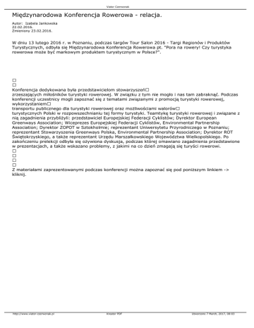 Viator Czerwonak Międzynarodowa Konferencja Rowerowa - relacja. Autor: Izabela Jankowska 22.02.2016. Zmieniony 23.02.2016. W dniu 13 lutego 2016 r. w Poznaniu, podczas targów Tour Salon 2016 - Targi Regionów i Produktów Turystycznych, odbyła się Międzynarodowa Konferencja Rowerowa pt. "Pora na rowery! Czy turystyka rowerowa może być markowym produktem turystycznym w Polsce?". Konferencja dedykowana była przedstawicielom stowarzyszeń zrzeszających miłośników turystyki rowerowej. W związku z tym nie mogło i nas tam zabraknąć. Podczas konferencji uczestnicy mogli zapoznać się z tematami związanymi z promocją turystyki rowerowej, wykorzystaniem transportu publicznego dla turystyki rowerowej oraz możliwościami walorów turystycznych Polski w rozpowszechnianiu tej formy turystyki. Teamtykę turystyki rowerowej i związane z nią zagadnienia przybliżyli: przedstawiciel Europejskiej Federacji Cyklistów; Dyrektor European Greenways Association; Wiceprezes Europejskiej Federacji Cyklistów, Environmental Partnership Association; Dyrektor ZOPOT w Sztokholmie; reprezentant Uniwersytetu Przyrodniczego w Poznaniu; reprezentant Stowarzyszenia Greenways Polska, Environmental Partnership Association; Dyrektor ROT Świętokrzyskiego, a także reprezentant Urzędu Marszałkowskiego Województwa Wielkopolskiego. Po zakończeniu prelekcji odbyła się ożywiona dyskusja, podczas której omawiano zagadnienia przedstawione w prezentacjach, a także wskazano problemy, z jakimi na co dzień zmagają się turyści rowerowi. Z materiałami zaprezentowanymi podczas konferencji można zapoznać się pod poniższym linkiem -> kliknij. http://www.viator-czerwonak.pl Kreator PDF Utworzono 7 March, 2017, 08:03