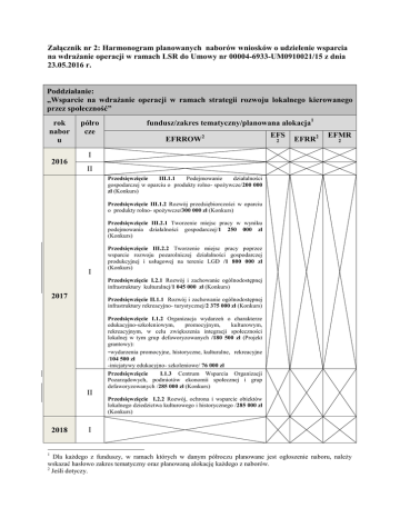 Załącznik nr 2: Harmonogram planowanych naborów wniosków o udzielenie wsparcia na wdrażanie operacji w ramach LSR do Umowy nr 00004-6933-UM0910021/15 z dnia 23.05.2016 r. Poddziałanie: „Wsparcie na wdrażanie operacji w ramach strategii rozwoju lokalnego kierowanego przez społeczność” rok nabor u półro cze fundusz/zakres tematyczny/planowana alokacja1 EFRROW2 EFS 2 EFRR2 EFMR 2 I 2016 II Przedsięwzięcie III.1.1 Podejmowanie działalności gospodarczej w oparciu o produkty rolno- spożywcze/200 000 zł (Konkurs) Przedsięwzięcie III.1.2 Rozwój przedsiębiorczości w oparciu o produkty rolno- spożywcze/300 000 zł (Konkurs) Przedsięwzięcie III.2.1 Tworzenie miejsc pracy w wyniku podejmowania działalności gospodarczej/1 250 000 zł (Konkurs) I Przedsięwzięcie III.2.2 Tworzenie miejsc pracy poprzez wsparcie rozwoju pozarolniczej działalności gospodarczej produkcyjnej i usługowej na terenie LGD /1 800 000 zł (Konkurs) Przedsięwzięcie I.2.1 Rozwój i zachowanie ogólnodostępnej infrastruktury kulturalnej/1 045 000 zł (Konkurs) 2017 Przedsięwzięcie II.1.1 Rozwój i zachowanie ogólnodostępnej infrastruktury rekreacyjno- turystycznej/2 375 000 zł (Konkurs) Przedsięwzięcie I.1.2 Organizacja wydarzeń o charakterze edukacyjno-szkoleniowym, promocyjnym, kulturowym, rekreacyjnym, w celu zwiększenia integracji społeczności lokalnej w tym grup defaworyzowanych /180 500 zł (Projekt grantowy): -wydarzenia promocyjne, historyczne, kulturalne, rekreacyjne /104 500 zł -inicjatywy edukacyjno- szkoleniowe/ 76 000 zł Przedsięwzięcie I.1.3 Centrum Wsparcia Organizacji Pozarządowych, podmiotów ekonomii społecznej i grup defaworyzowanych /285 000 zł (Konkurs) II 2018 1 Przedsięwzięcie I.2.2 Rozwój, ochrona i wsparcie obiektów lokalnego dziedzictwa kulturowego i historycznego /285 000 zł (Konkurs) I Dla każdego z funduszy, w ramach których w danym półroczu planowane jest ogłoszenie naboru, należy wskazać hasłowo zakres tematyczny oraz planowaną alokację każdego z naborów. 2 Jeśli dotyczy. II Przedsięwzięcie I.1.3 Centrum Wsparcia Organizacji Pozarządowych, podmiotów ekonomii społecznej i grup defaworyzowanych /95 000 zł (Konkurs) Przedsięwzięcie I.2.2 Rozwój, ochrona i wsparcie obiektów lokalnego dziedzictwa kulturowego i historycznego /190 000 zł (Konkurs) I Przedsięwzięcie I.3.1 Kultywowanie lokalnych tradycji w oparciu o produkty lokalne poprzez organizację lub uczestnictwo w imprezach, targach, wystawach / 266 000zł (Projekt grantowy) Przedsięwzięcie III.2.1 Tworzenie miejsc pracy w wyniku podejmowania działalności gospodarczej /750 000 zł (Konkurs) Przedsięwzięcie III.2.2 Tworzenie miejsc pracy poprzez wsparcie rozwoju pozarolniczej działalności gospodarczej produkcyjnej i usługowej na terenie LGD /1 400 000 zł (Konkurs) Przedsięwzięcie I.2.1 Rozwój i zachowanie ogólnodostępnej infrastruktury kulturalnej /95 000 zł (Konkurs) 2019 Przedsięwzięcie II.1.1 Rozwój i zachowanie ogólnodostępnej infrastruktury rekreacyjno- turystycznej / 570 000 zł (Konkurs) II Przedsięwzięcie I.3.2 Zachowanie dziedzictwa lokalnego przez: wydawanie publikacji, (w tym w formie elektronicznej digitalizacja), zagospodarowanie infrastruktury stanowiącej dziedzictwo lokalne, wyposażenie/doposażenie lokalnych podmiotów w przedmioty i urządzenia umożliwiające kultywowanie miejscowych tradycji, obrzędów, zwyczajów/237 500 zł (Projekt grantowy): - publikacje, materiały zachowujące dziedzictwo lokalne, związane z obszarem LGD , w tym w formie elektronicznej (digitalizacja)/47 500 zł - zagospodarowanie obiektów dziedzictwa lokalnego/104 500 zł - wyposażenie w przedmioty i urządzenia umożliwiające kultywowanie miejscowych tradycji, obrzędów i zwyczajów/ 85 500 zł Przedsięwzięcie II.3.1 Organizacja konkursów, warsztatów, wystaw, wyjazdów studyjnych związanych z ekologią, OZE / 76 000 zł (Projekt grantowy) 2020 2021 I II I II I 2022 II I 2023 II